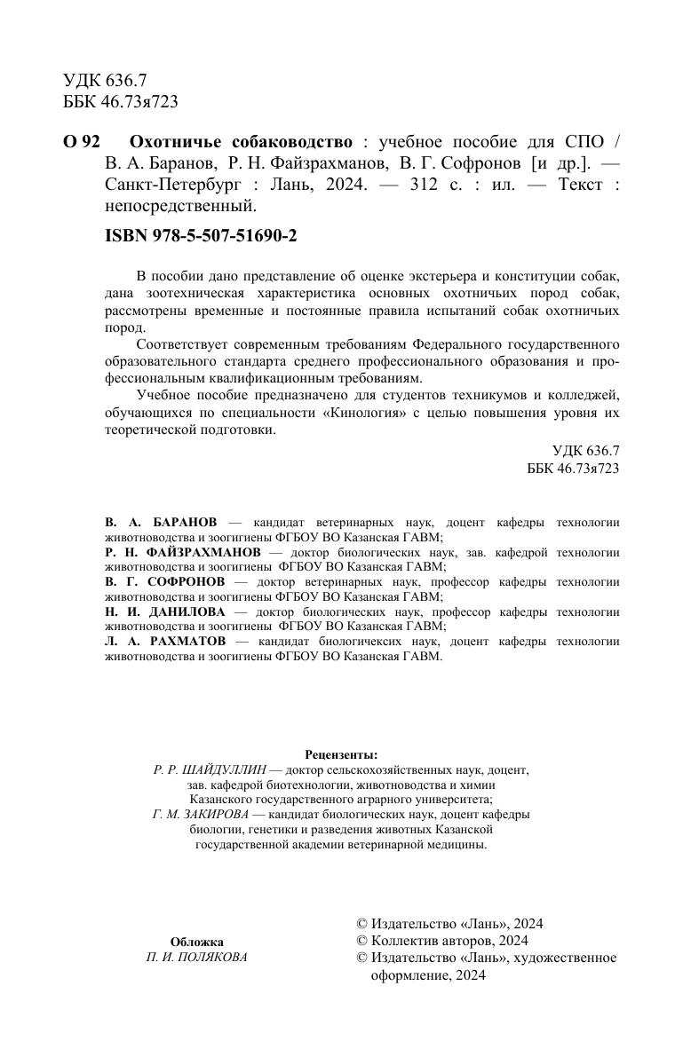 В пособии дано представление об оценке экстерьера и конституции собак, дана зоотехническая характеристика основных охотничьих пород собак, рассмотрены временные и постоянные правила испытаний собак охотничьих пород. Соответствует современным требованиям Федерального государственного образовательного стандарта среднего профессионального образования и профессиональным квалификационным требованиям. Учебное пособие предназначено для студентов техникумов и колледжей, обучающихся по специальности «Кинология» с целью повышения уровня их теоретической подготовки.