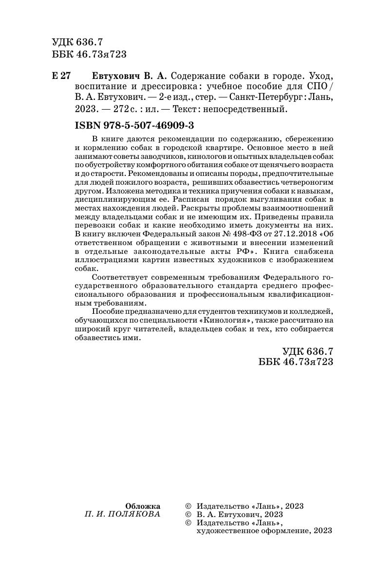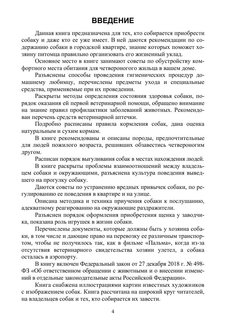 В книге даются рекомендации по содержанию, сбережению и кормлению собак в городской квартире. Основное место в ней занимают советы заводчиков, кинологов и опытных владельцев собак по обустройству комфортного обитания собаке от щенячьего возраста и до старости. Рекомендованы и описаны породы, предпочтительные для людей пожилого возраста, решивших обзавестись четвероногим другом. Изложена методика и техника приучения собаки к навыкам, дисциплинирующим ее. Расписан порядок выгуливания собак в местах нахождения людей. Раскрыты проблемы взаимоотношений между владельцами собак и не имеющим их. Приведены правила перевозки собак и какие необходимо иметь документы на них. В книгу включен Федеральный закон № 498-ФЗ от 27.12.2018 «Об ответственном обращении с животными и внесении изменений в отдельные законодательные акты РФ». Книга снабжена иллюстрациями картин известных художников с изображением собак. Соответствует современным требованиям Федерального государ-ственного образовательного стандарта среднего профессионального образования и профессиональным квалификационным требованиям. Пособие предназначено для студентов техникумов и колледжей, обучающихся по специальности «Кинология», также рассчитано на широкий круг читателей, владельцев собак и тех, кто собирается обзавестись ими.