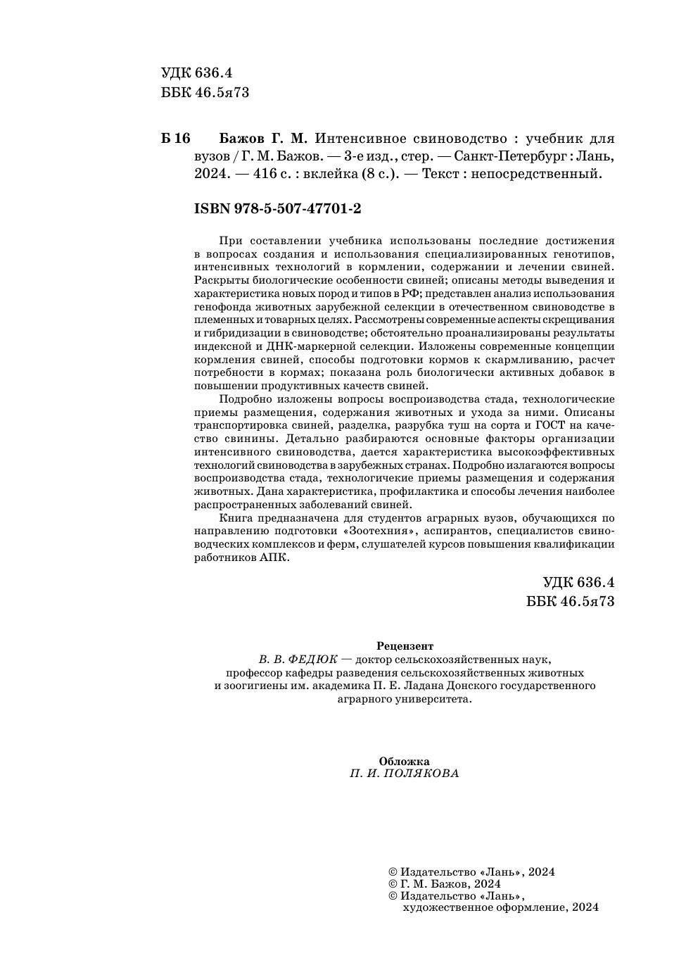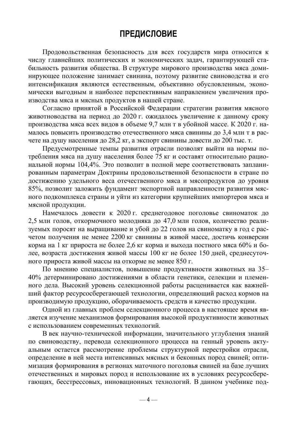 При составлении учебника использованы последние достижения в вопросах создания и использования специализированных генотипов, интенсивных технологий в кормлении, содержании и лечении свиней. Раскрыты биологические особенности свиней, описаны методы выведения и характеристика новых пород и типов в РФ, представлен анализ использования генофонда животных зарубежной селекции в отечественном свиноводстве в племенных и товарных целях. Рассмотрены современные аспекты скрещивания и гибридизации в свиноводстве, обстоятельно проанализированы результаты индексной и ДНК-маркерной селекции. Изложены современные концепции кормления свиней, способы подготовки кормов к скармливанию, расчет потребности в кормах, показана роль биологически активных добавок в повышении продуктивных качеств свиней. Подробно изложены вопросы воспроизводства стада, технологические приемы размещения, содержания животных и ухода за ними. Описаны транспортировка свиней, разделка, разрубка туш на сорта и ГОСТ на качество свинины. Детально разбираются основные факторы организации интенсивного свиноводства, дается характеристика высокоэффективных технологий свиноводства в зарубежных странах. Подробно излагаются вопросы воспроизводства стада, технологичеСкие приемы размещения и содержания животных. Дана характеристика, профилактика и способы лечения наиболее распространенных заболеваний свиней. Книга предназначена для студентов аграрных вузов, обучающихся по направлению подготовки «Зоотехния», аспирантов, специалистов свиноводческих комплексов и ферм, слушателей курсов повышения квалификации работников АПК.