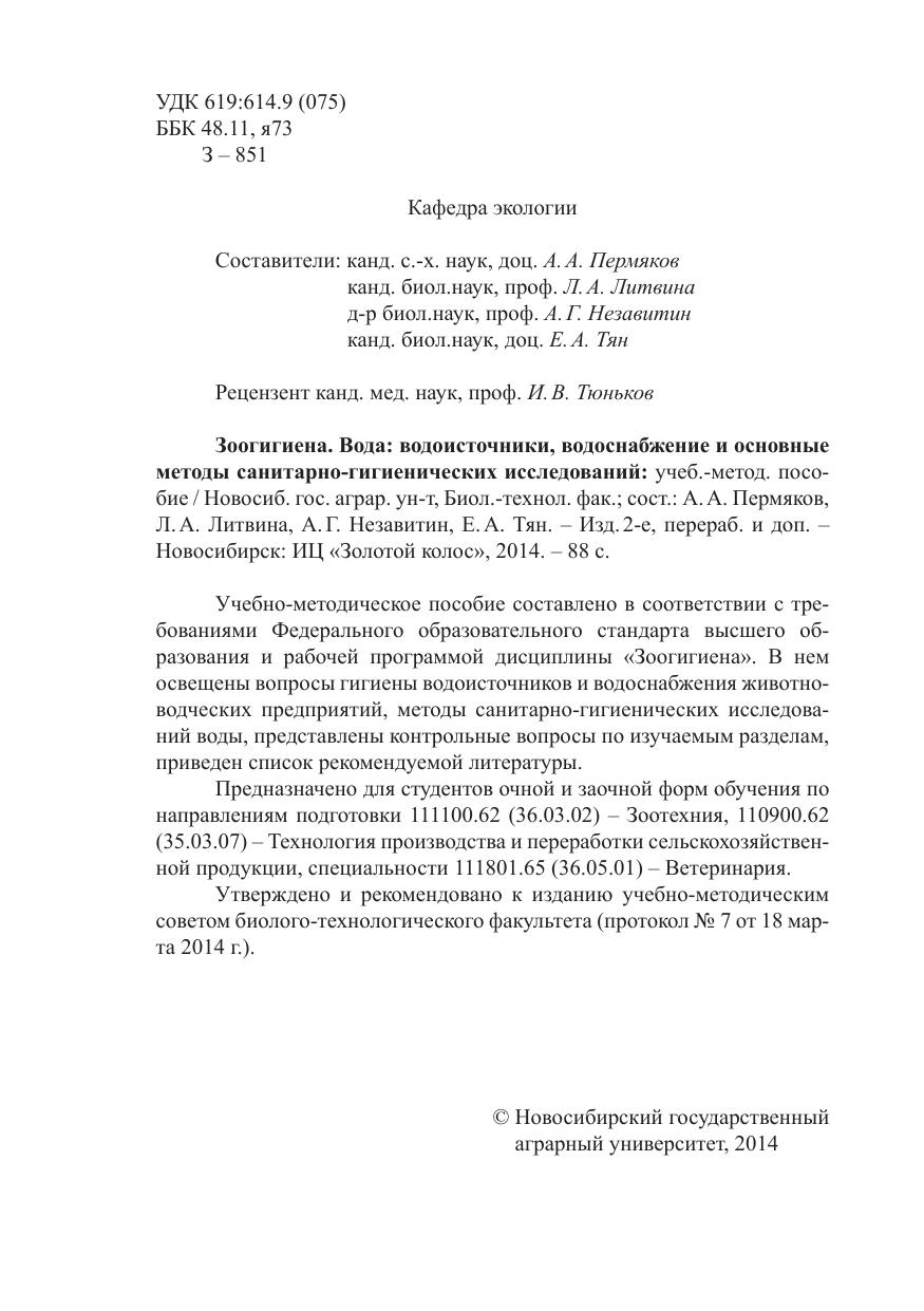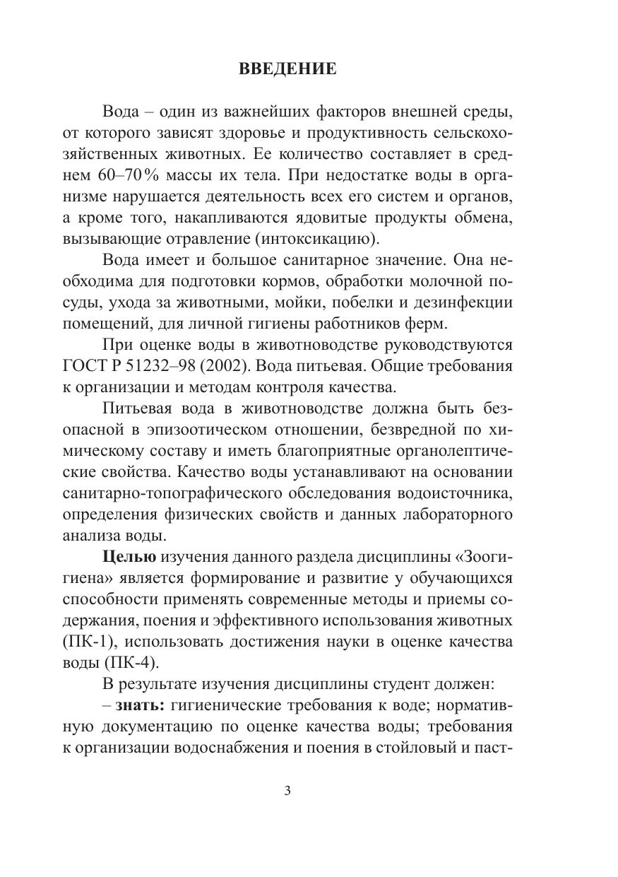 Учебно-методическое пособие составлено в соответствии с требованиями Федерального образовательного стандарта высшего образования и рабочей программой дисциплины «Зоогигиена». В нем освещены вопросы гигиены водоисточников и водоснабжения животноводческих предприятий, методы санитарно-гигиенических исследований воды, представлены контрольные вопросы по изучаемым разделам, приведен список рекомендуемой литературы. Предназначено для студентов очной и заочной форм обучения по направлениям подготовки 111100.62 (36.03.02) – Зоотехния, 110900.62 (35.03.07) – Технология производства и переработки сельскохозяйственной продукции, специальности 111801.65 (36.05.01) – Ветеринария.