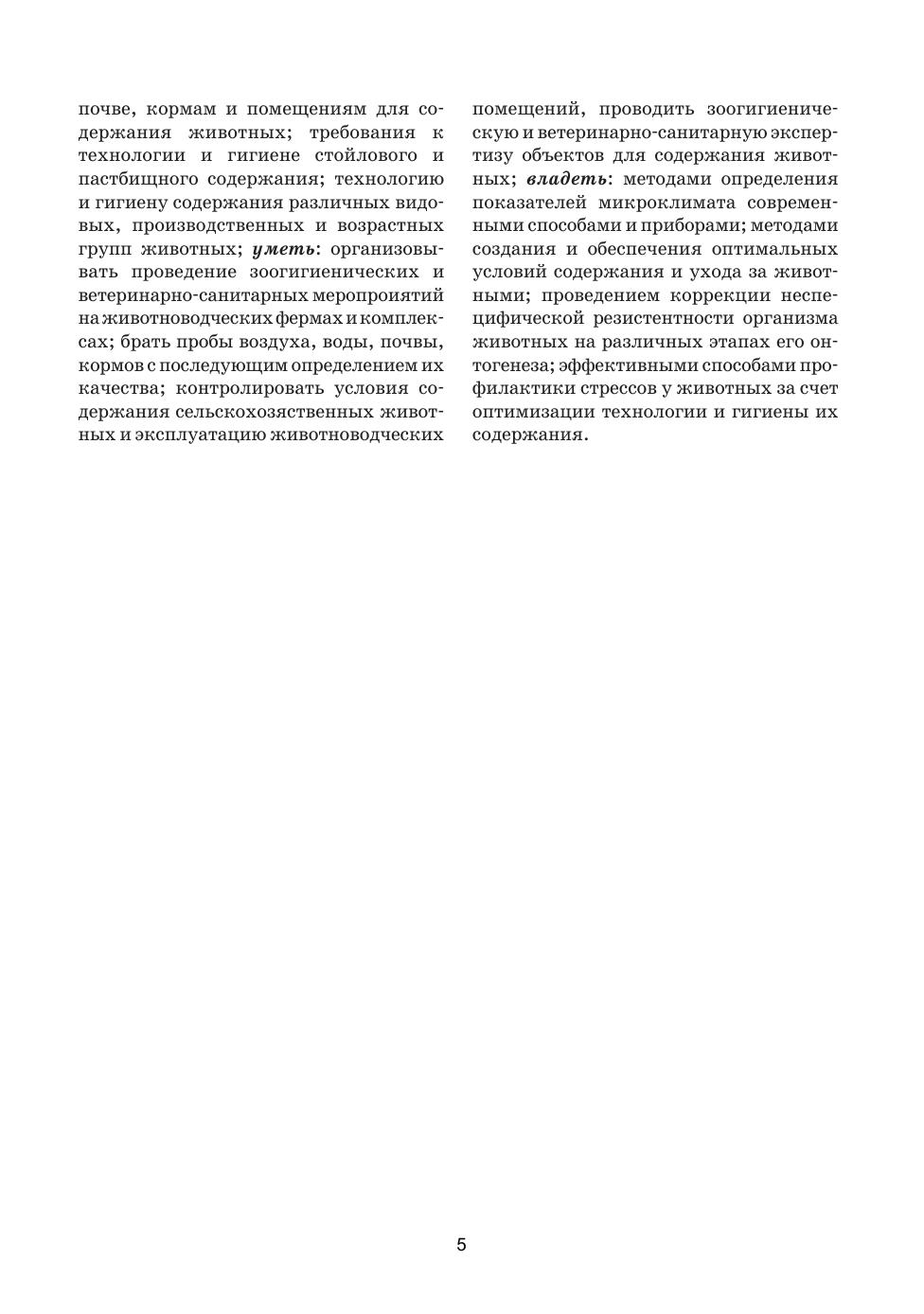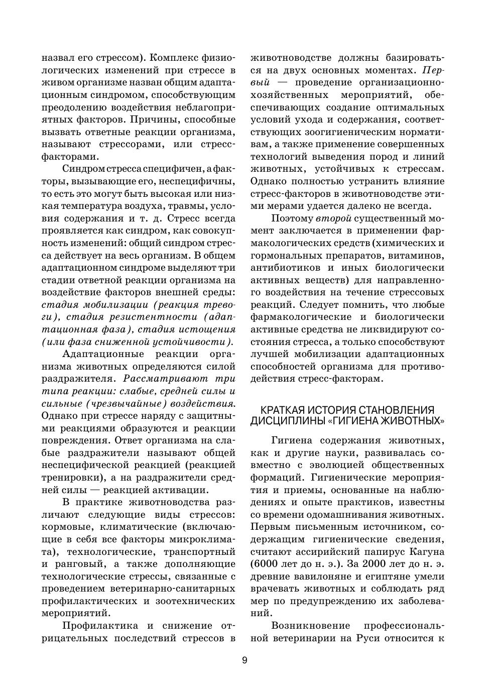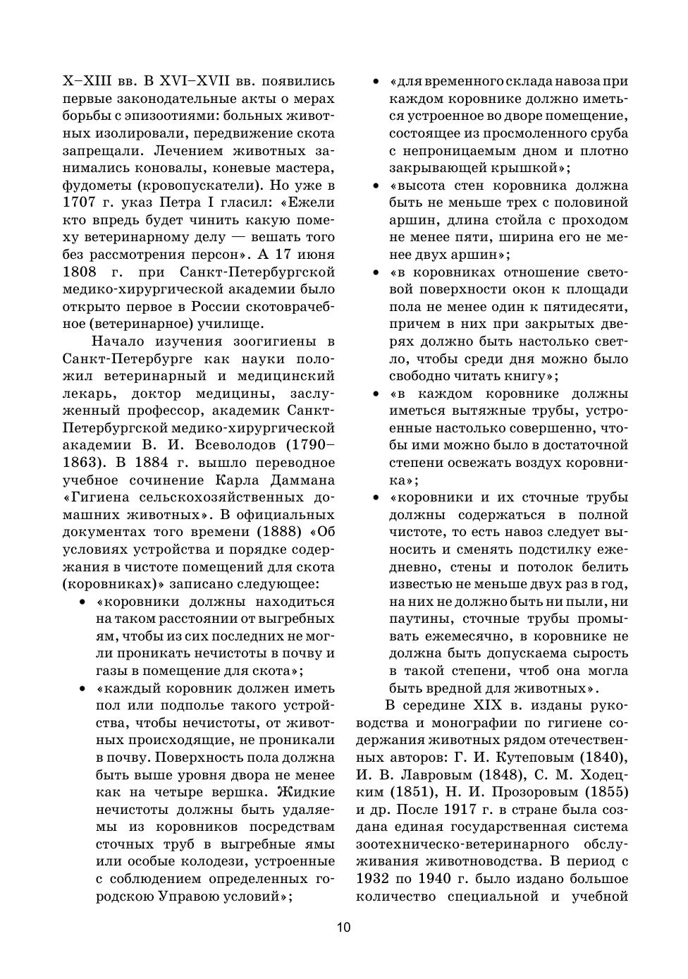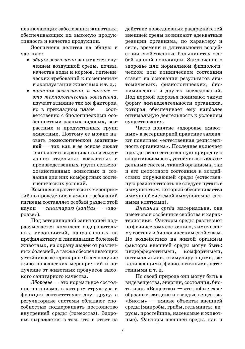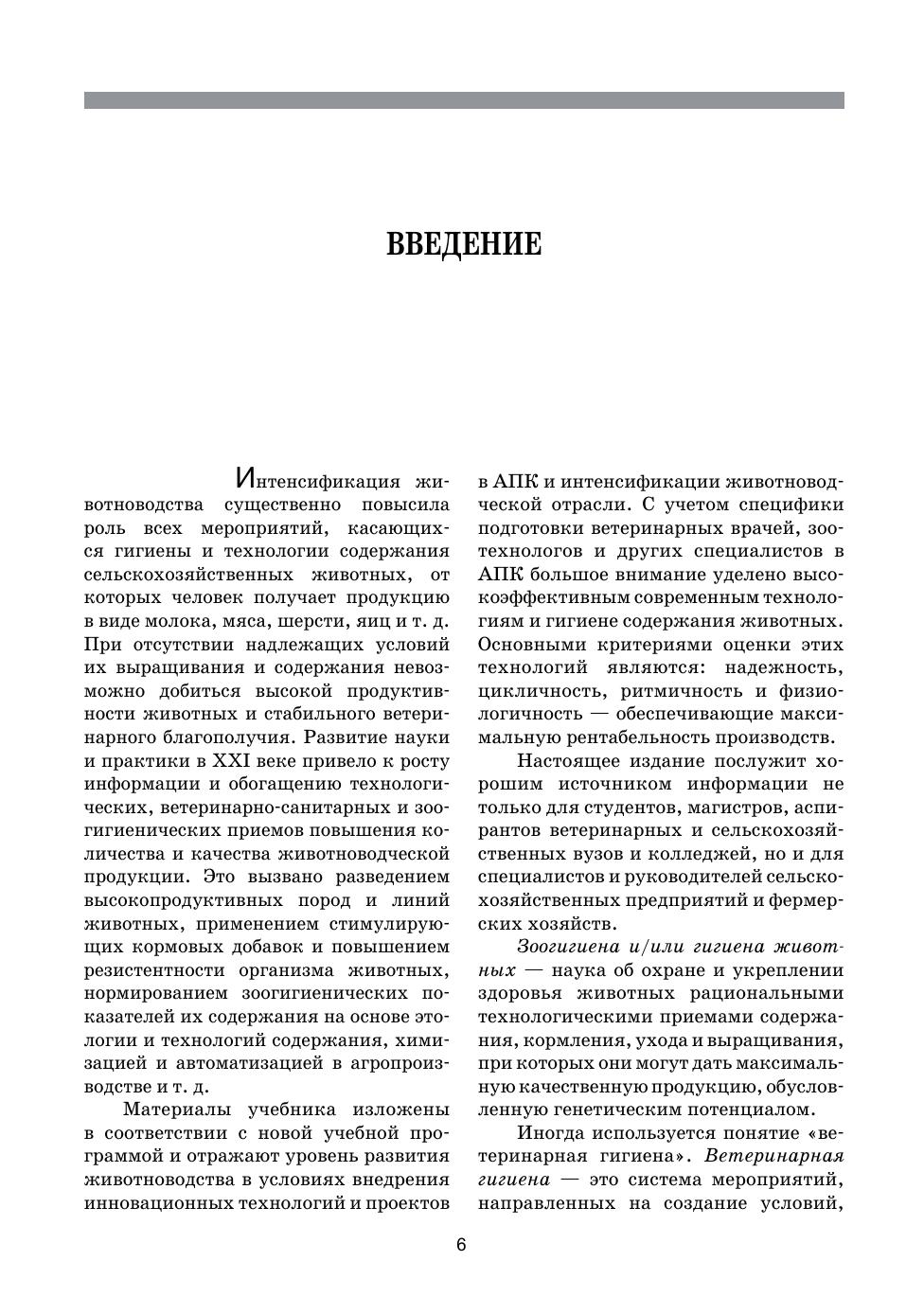 Учебник предназначен для студентов, получающих среднее профессиональное образование (СПО) в области животноводства, ветеринарии, зоотехнии и других смежных направлений. Учебник включает 18 глав. В I части «Общая гигиена» (8 глав) освещены следующие вопросы: гигиена воздушной среды, почва и ее санитарное значение, вода и поение животных, корма и кормление животных, основы проектирования и строительства животноводческих объектов, транспортировка животных, гигиена ухода за животными и ветеринарная защита ферм. Во II части (10 глав) представлен материал по гигиене и технологиям содержания, включая выращивание новорожденных животных, разных половозрастных и производственных групп следующих видов животных: крупный рогатый скот, свиньи, лошади, овцы, козы, сельскохозяйственная птица, пушные звери и кролики, товарное рыбоводство, пчелы, лабораторнрные животные. Материалы практикума отражают уровень развития животноводства в условиях внедрения инновационных проектов в АПК и интенсификации животноводческой отрасли. В нем обобщены современные требования к гигиене и технологиям содержания животных, среде их обитания. В содержание учебника включены нормативно-правовые документы: ГОСТ, ТУ, ветеринарно-санитарные правила и нормы (Вет-санПиН), санитарные правила и нормы (СанПиН), нормы технологического проектирования (НТП-АПК), рекомендательные документы (РД-АПК) и др.
