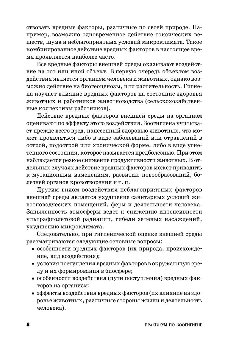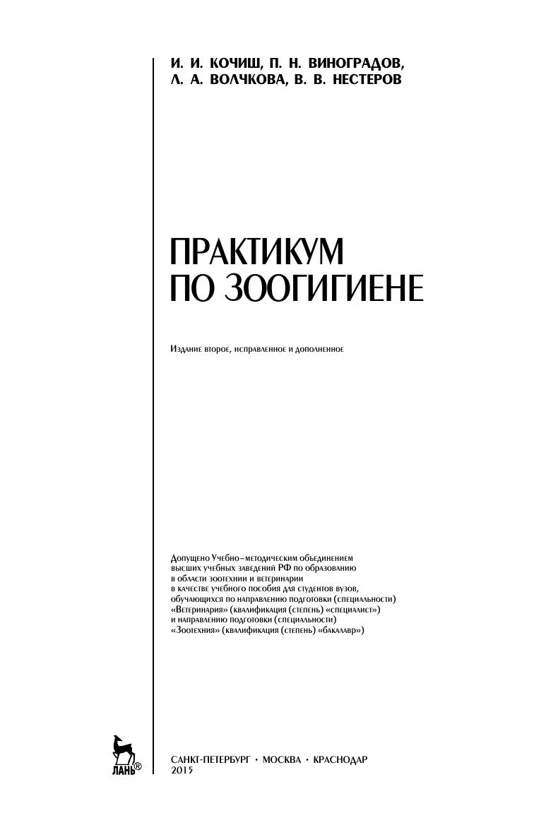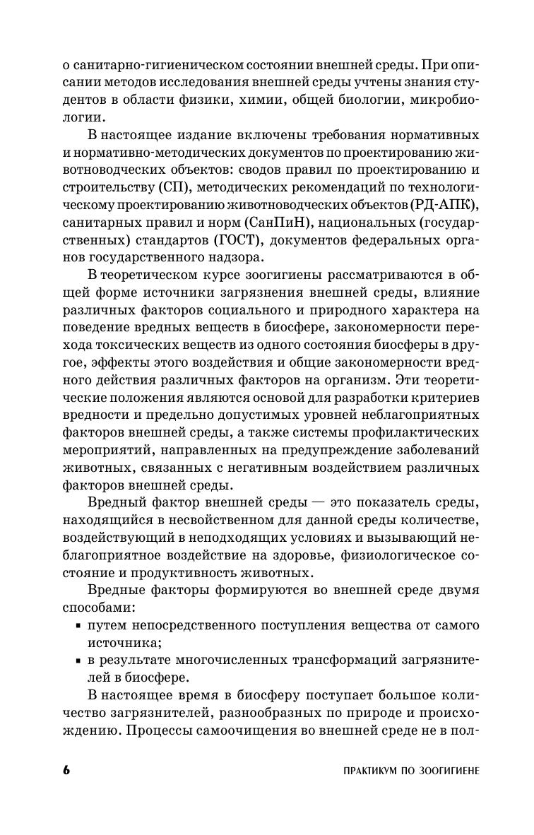 Учебное пособие «Практикум по зоогигиене» является дополнением к учебнику «Зоогигиена». Рассматривает методику проведения занятий по основным темам: зоогигиенический контроль за состоянием микроклимата в животноводческих помещениях, санитарно-гигиеническая оценка почвы, санитарно-гигиеническая оценка воды, санитарно-гигиенический контроль кормов, гигиенические основы проектирования и эксплуатации животноводческих объектов, а также порядок работы при проведении исследований. В практикум включены методы санитарного описания, органолептические, физические, химические, биологические, экспресс-методы, расчетные методы, экспериментальные и методы, применимые к различным объектам внешней среды (воздух, вода, почва, корма). Учебное пособие предназначено для студентов, обучающихся по специальности «Ветеринария» и направлению подготовки «Зоотехния».