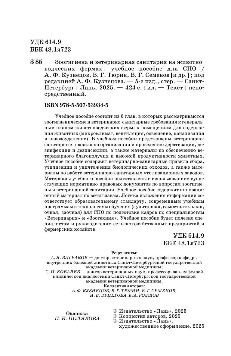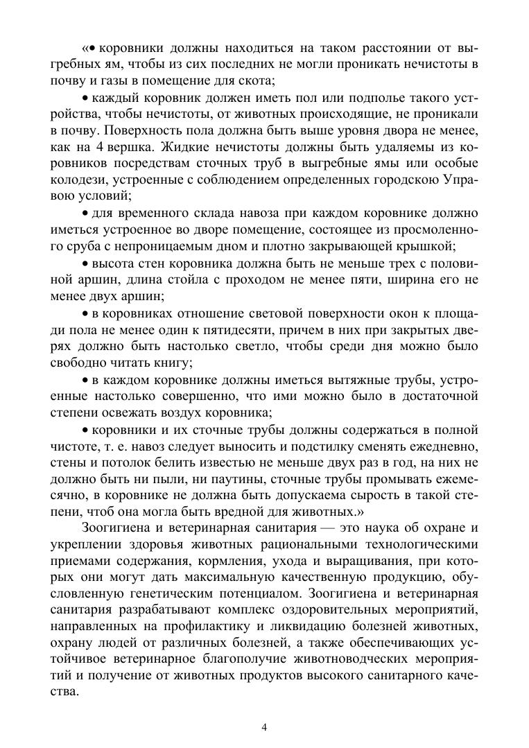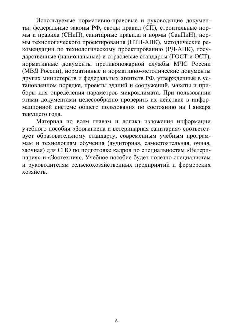 Учебное пособие состоит из 6 глав, в которых рассматриваются зоогигиенические и ветеринарно-санитарные требования к генеральным планам животноводческих ферм, к помещениям для содержания животных (микроклимат, вентиляция, освещение, канализация и навозоудаление). В учебном пособии представлены ветеринарно-санитарные правила по организации и проведению дератизации, дезинфекции и дезинсекции, а также материалы по обеспечению ветеринарного благополучия и высокой продуктивности животных. Учебное пособие содержит ветеринарно-санитарные правила сбора, утилизации и уничтожения биологических отходов, а также материалы по работе ветеринарно-санитарных утилизационных заводов. Материалы учебного пособия подготовлены с использованием существующих нормативно-правовых документов по вопросам зоогигиены и ветеринарной санитарии. Учебное пособие содержит инновационный материал по всем главам. Логика изложения информации соответствует образовательному стандарту, современным учебным программам и технологиям обучения (аудиторная, самостоятельная, очная, заочная) для СПО по подготовке кадров по специальностям «Ветеринария» и «Зоотехния». Учебное пособие будет полезно специалистам и руководителям сельскохозяйственных предприятий и фермерских хозяйств