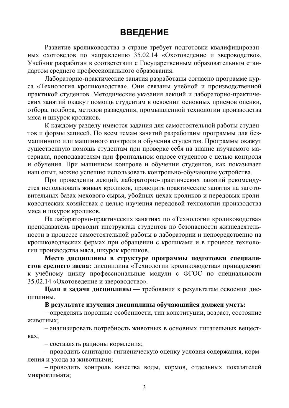В учебнике изложены методические указания проведения лекций, лабораторно-практических занятий по дисциплине «Технология кролиководства». В темах лекций, лабораторно-практических занятий отражены: современные методы оценки экстерьера, конституции, мясной, шкурковой, пуховой продуктивности, содержание, кормление, технология производства мяса и шкурок кроликов. По всем темам разработаны программы с вопросами для контроля и обучения студентов. Даны методические рекомендации по проведению научно-производственных исследований и выполнению выпускных квалификационных работ (ВКР) по технологии кролиководства.