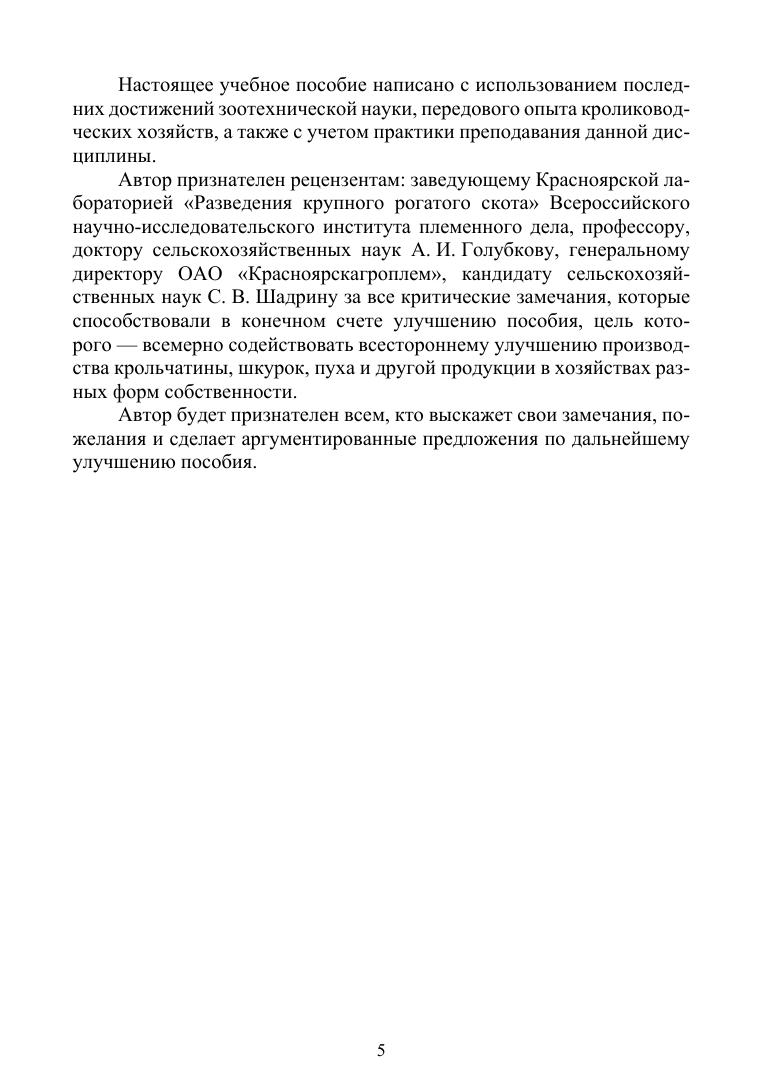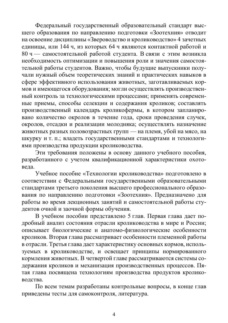 Учебное пособие состоит из пяти глав. Первая глава рассматривает основы кролиководства, вторая – племенную работы в отрасли, третья – подробно освещает характеристику основных кормов, используемых в кролиководстве и принципы нормированного кормления животных разных половозрастных групп, четвёртая – системы содержания кроликов и механизацию производственных процессов, пятая – особенности производства продуктов кролиководства.