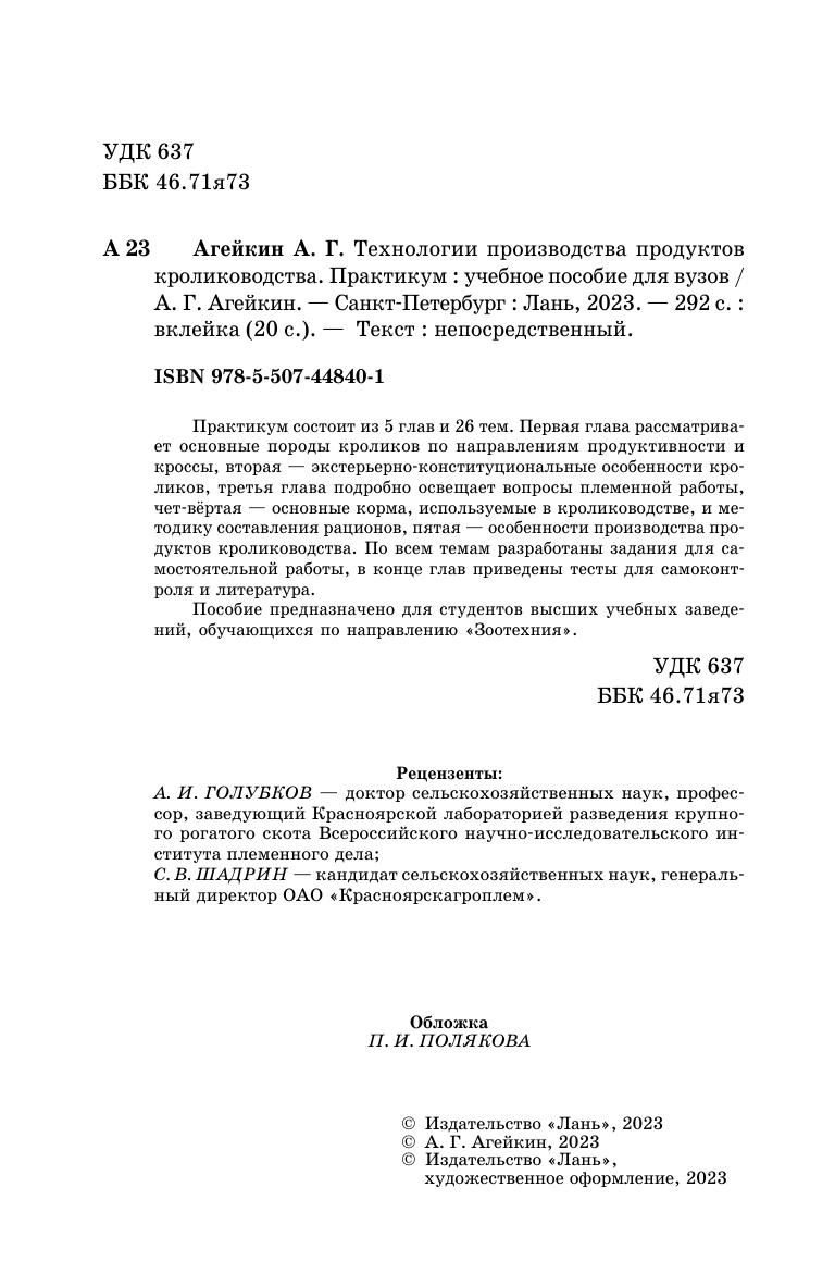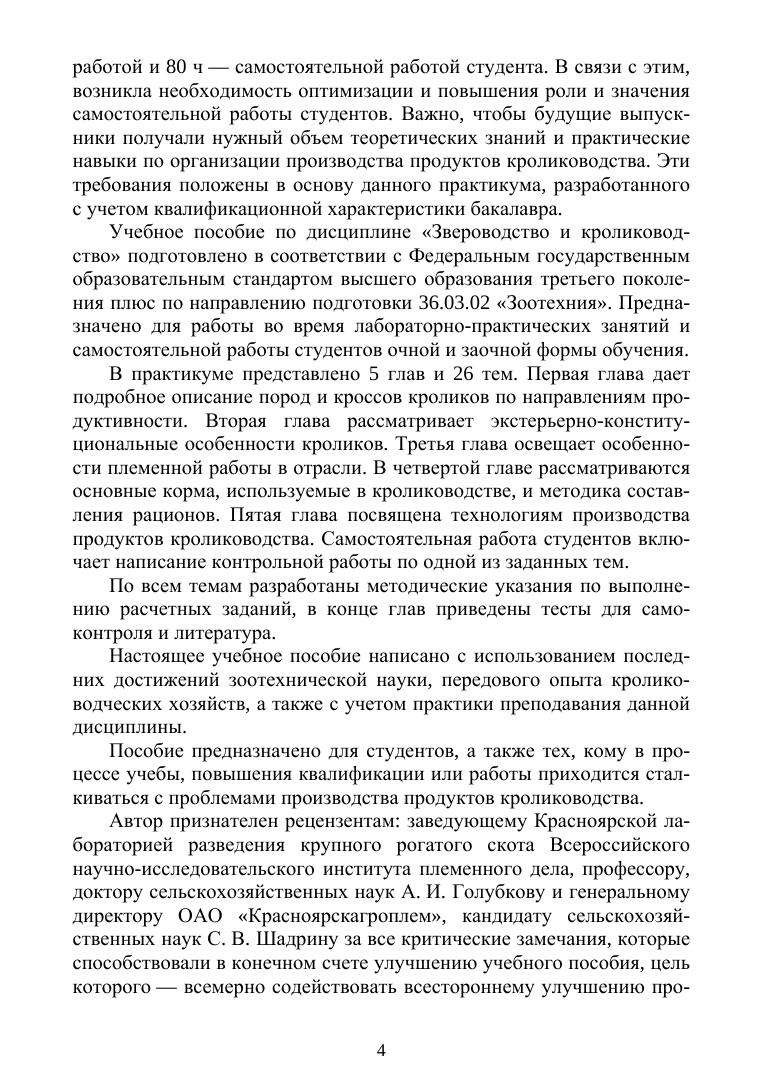 Практикум состоит из 5 глав и 26 тем. Первая глава рассматривает основные породы кроликов по направлениям продуктивности и кроссы, вторая — экстерьерно-конституциональные особенности кроликов, третья глава подробно освещает вопросы племенной работы, четвёртая — основные корма, используемые в кролиководстве, и методику составления рационов, пятая — особенности производства продуктов кролиководства. По всем темам разработаны задания для самостоятельной работы, в конце глав приведены тесты для самоконтроля и литература. Пособие предназначено для студентов высших учебных заведений, обучающихся по направлению «Зоотехния».