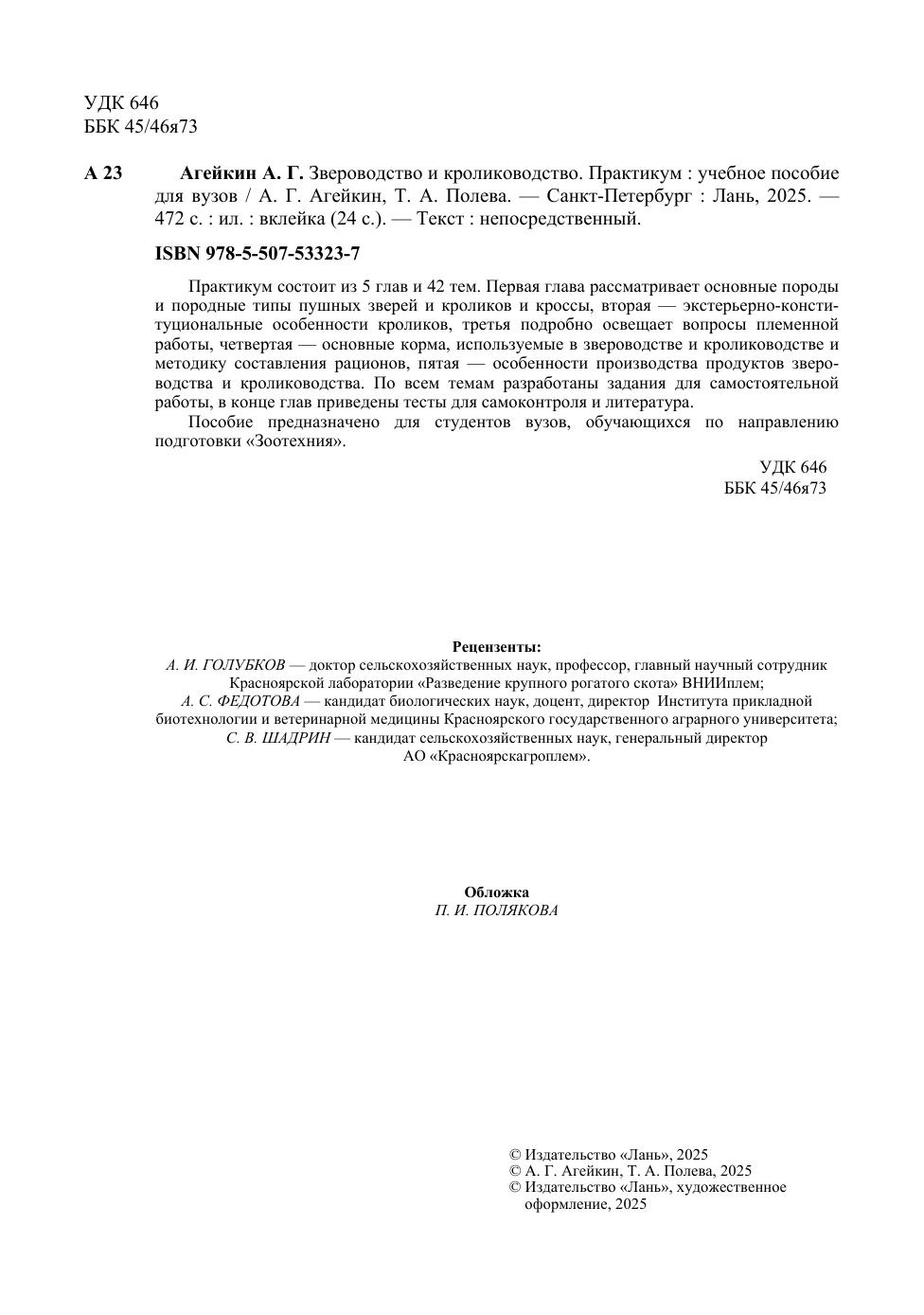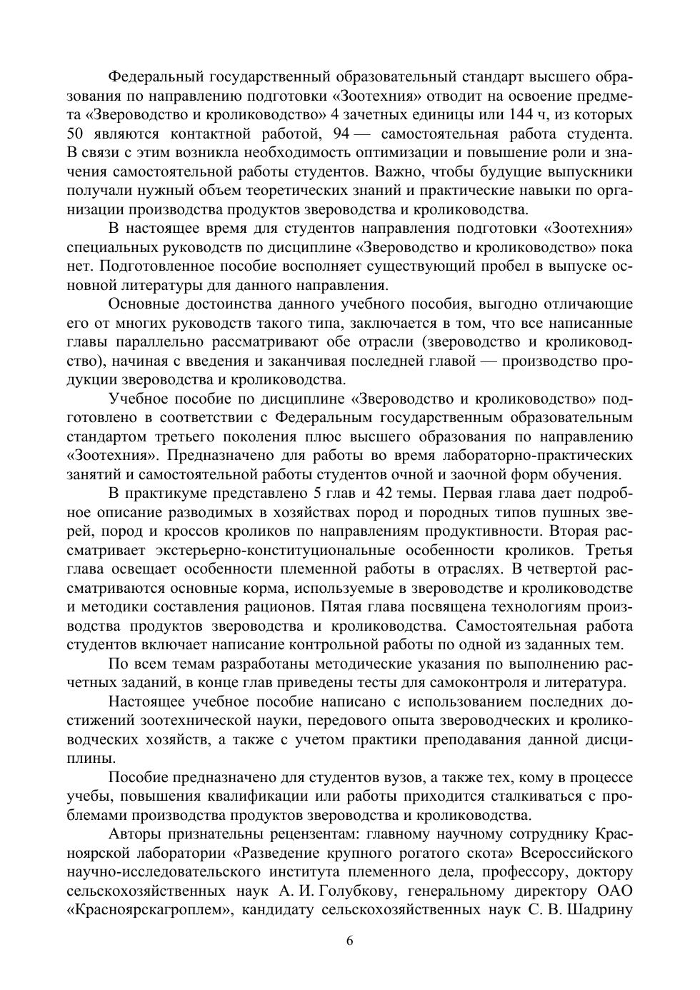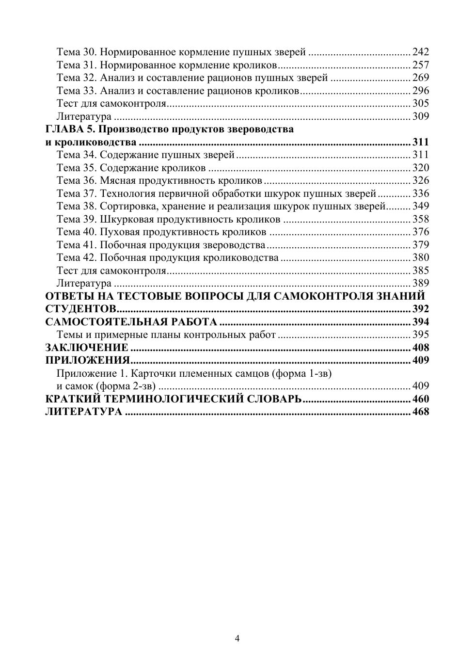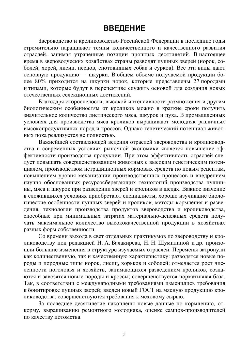 Практикум состоит из 5 глав и 42 тем. Первая глава рассматривает основные породы и породные типы пушных зверей и кроликов и кроссы, вторая — экстерьерно-конституциональные особенности кроликов, третья подробно освещает вопросы племенной работы, четвертая — основные корма, используемые в звероводстве и кролиководстве и методику составления рационов, пятая — особенности производства продуктов звероводства и кролиководства. По всем темам разработаны задания для самостоятельной работы, в конце глав приведены тесты для самоконтроля и литература. Пособие предназначено для студентов вузов, обучающихся по направлению подготовки «Зоотехния».