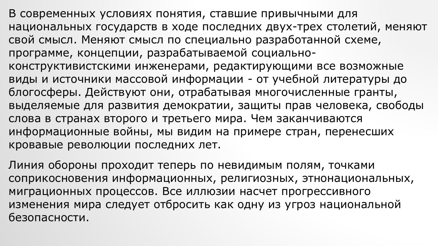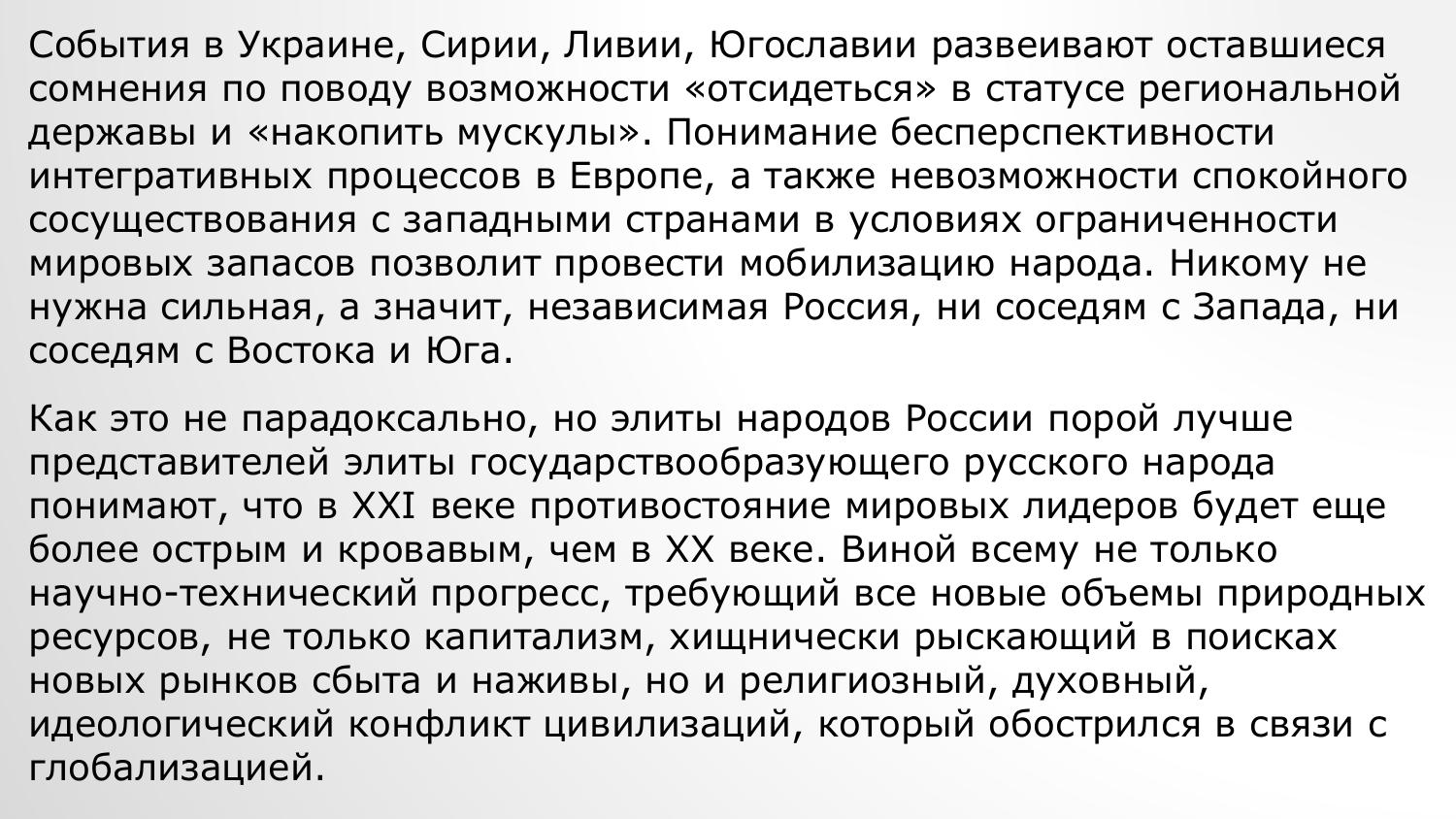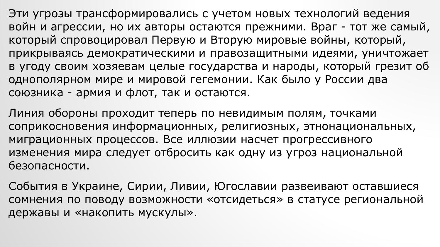 Все иллюзии насчет прогрессивного изменения мира следует отбросить как одну из угроз национальной безопасности. События в Украине, Сирии, Ливии, Югославии развеивают оставшиеся сомнения по поводу возможности «отсидеться» в статусе региональной державы и «накопить мускулы». Понимание бесперспективности интегративных процессов в Европе, а также невозможности спокойного сосуществования с западными странами в условиях ограниченности мировых запасов позволит провести мобилизацию народа. Никому не нужна сильная, а значит, независимая Россия. Поэтому национальная безопасность России - безопасность всех народов и народностей, проживающих на ее территории.