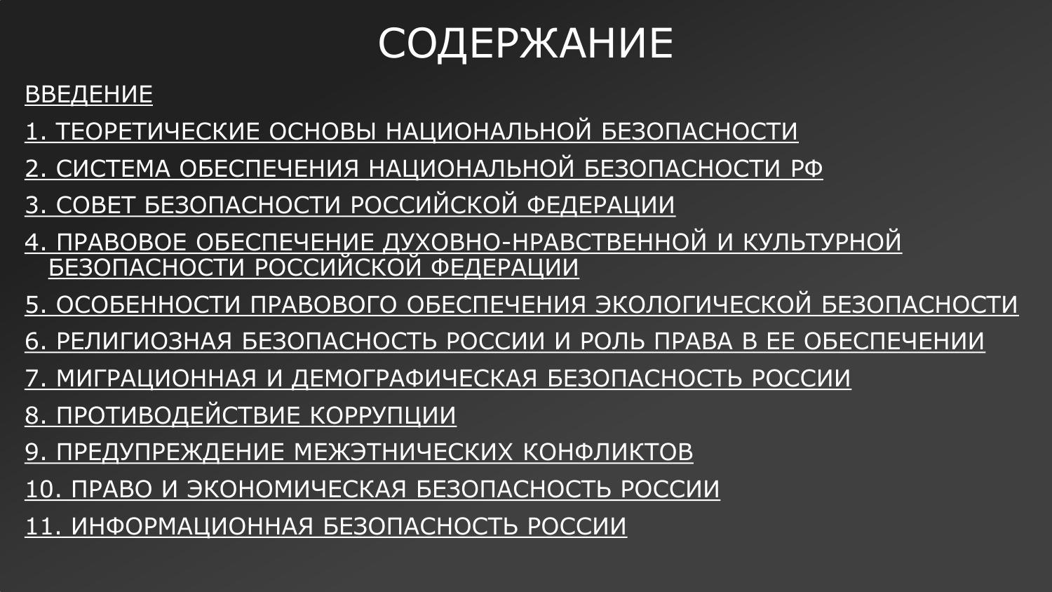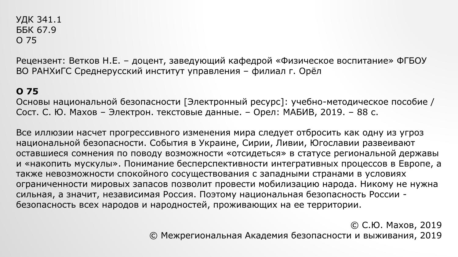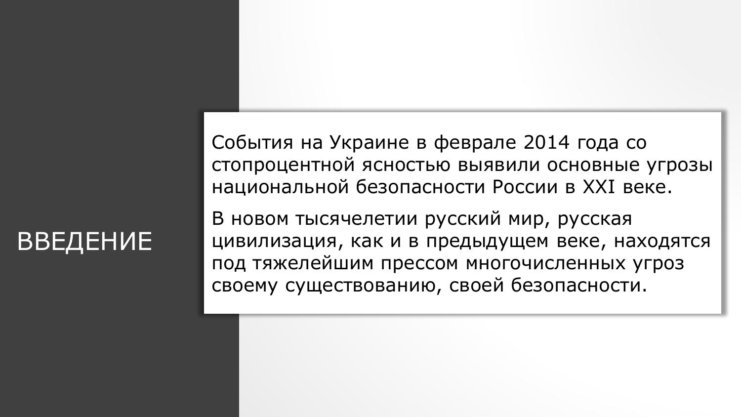 Все иллюзии насчет прогрессивного изменения мира следует отбросить как одну из угроз национальной безопасности. События в Украине, Сирии, Ливии, Югославии развеивают оставшиеся сомнения по поводу возможности «отсидеться» в статусе региональной державы и «накопить мускулы». Понимание бесперспективности интегративных процессов в Европе, а также невозможности спокойного сосуществования с западными странами в условиях ограниченности мировых запасов позволит провести мобилизацию народа. Никому не нужна сильная, а значит, независимая Россия. Поэтому национальная безопасность России - безопасность всех народов и народностей, проживающих на ее территории.