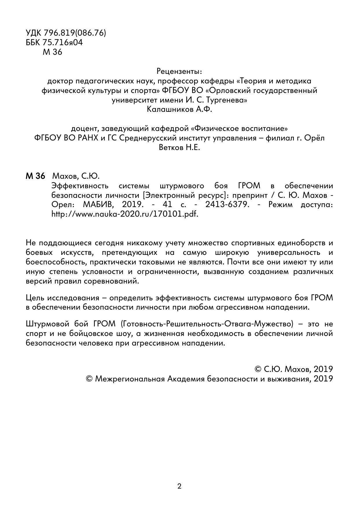 Не поддающиеся сегодня никакому учету множество спортивных единоборств и боевых искусств, претендующих на самую широкую универсальность и боеспособность, практически таковыми не являются. Почти все они имеют ту или иную степень условности и ограниченности, вызванную созданием различных версий правил соревнований. Цель исследования – определить эффективность системы штурмового боя ГРОМ в обеспечении безопасности личности при любом агрессивном нападении. Штурмовой бой ГРОМ (Готовность-Решительность-Отвага-Мужество) – это не спорт и не бойцовское шоу, а жизненная необходимость в обеспечении личной безопасности человека при агрессивном нападении.