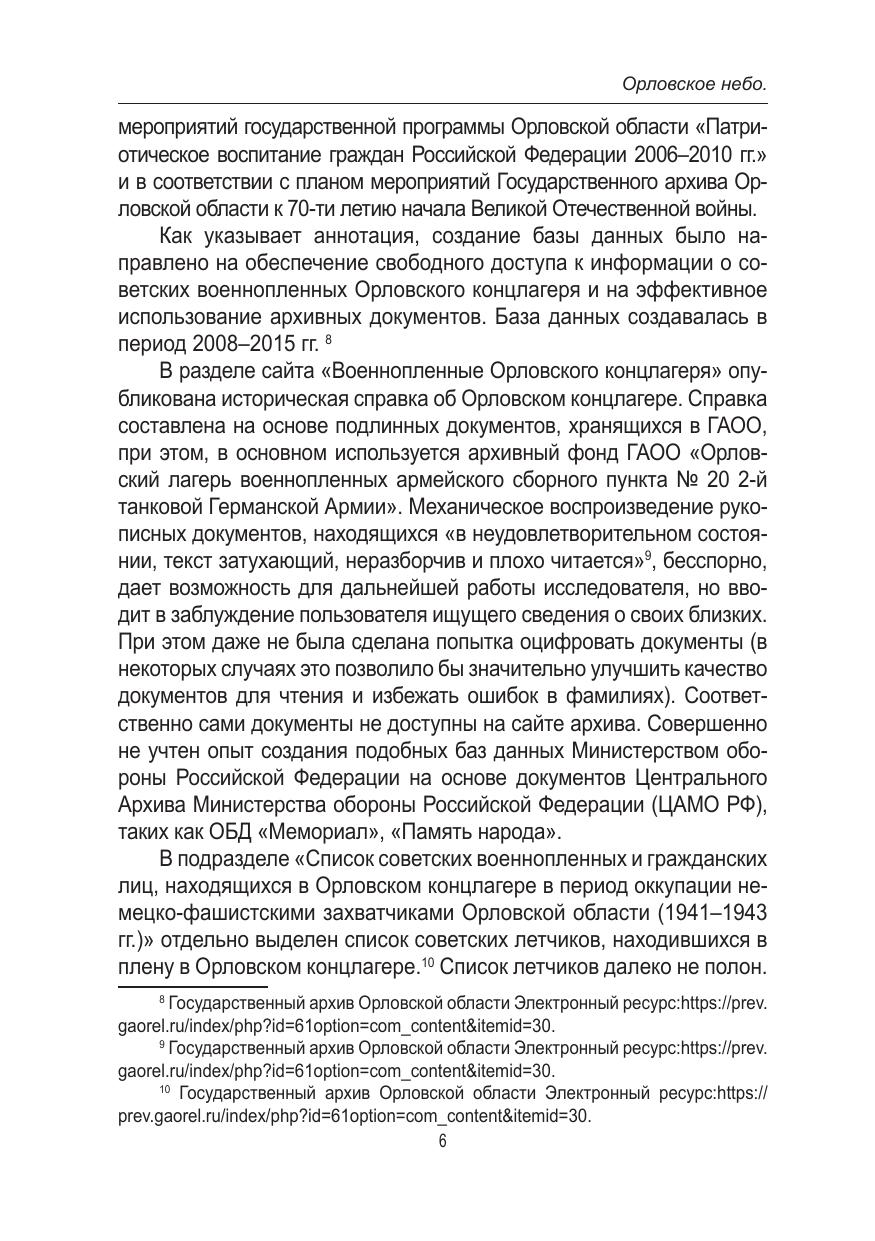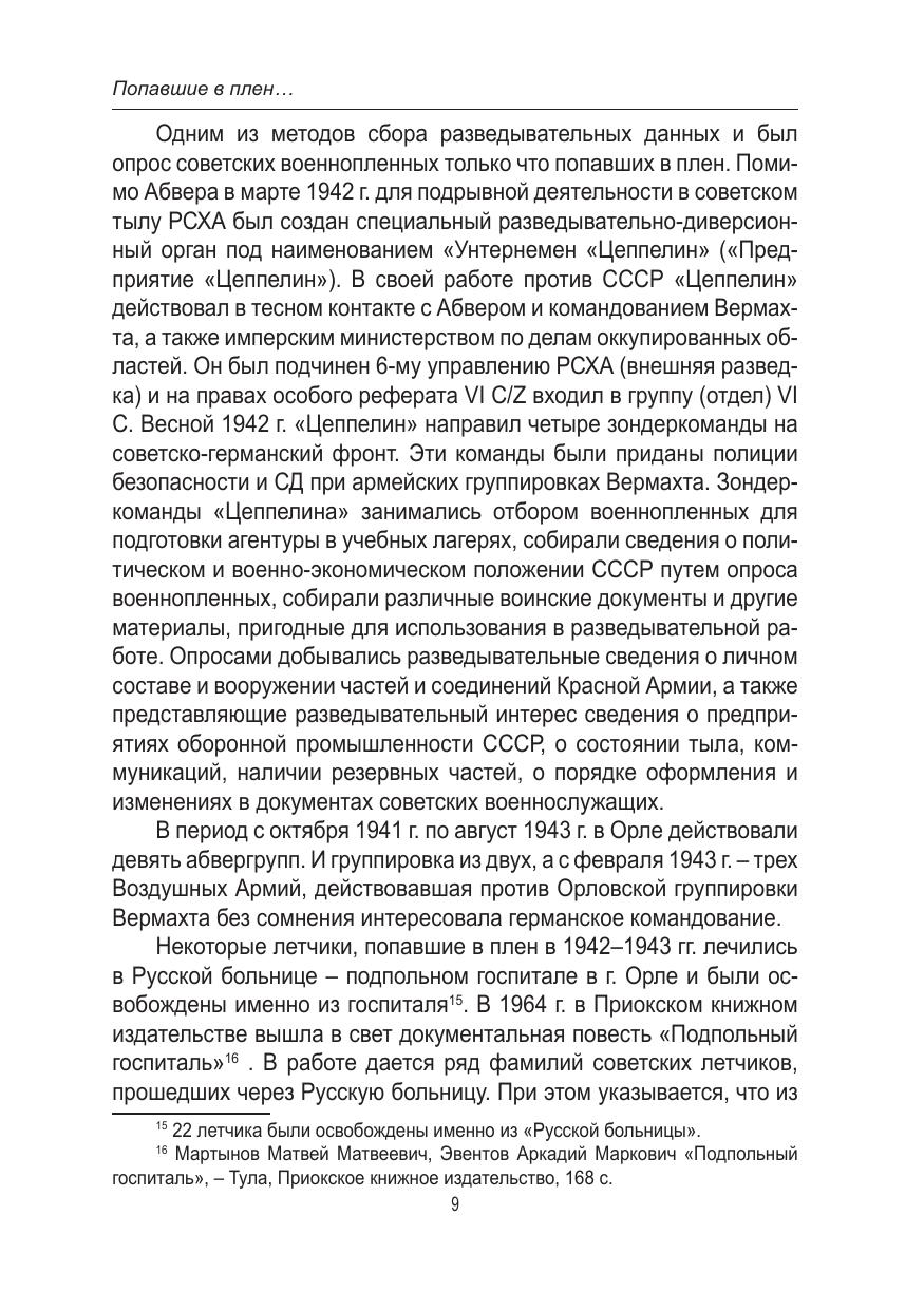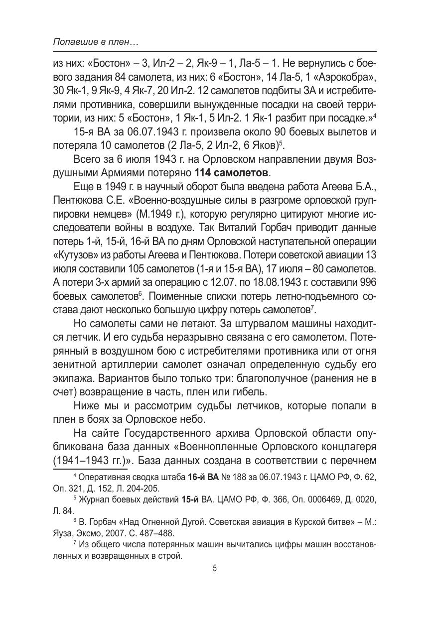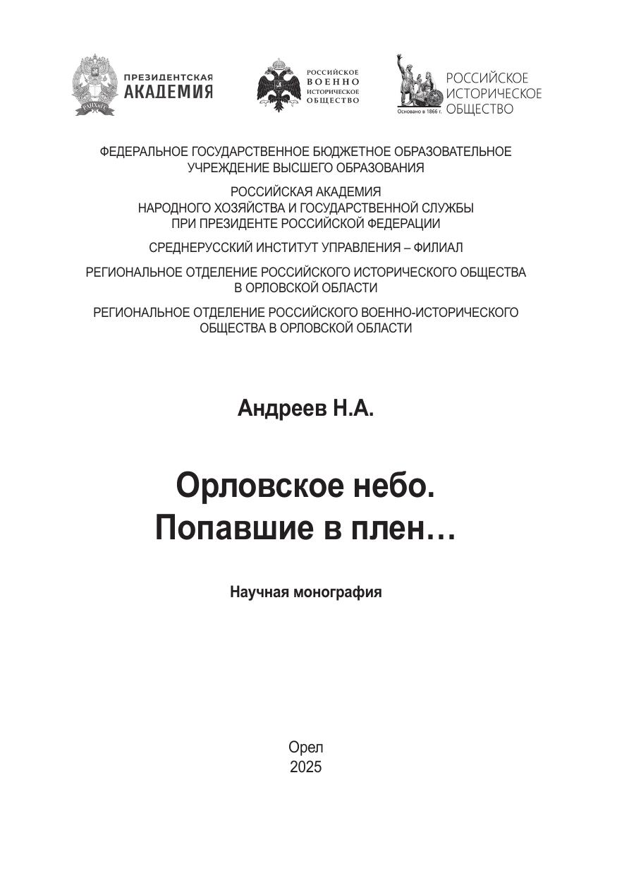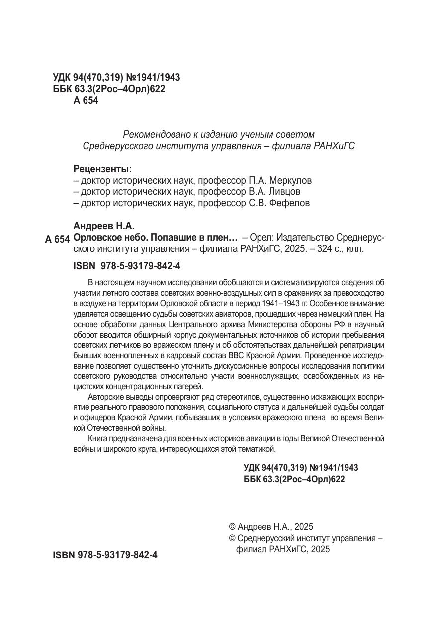 В настоящем научном исследовании обобщаются и систематизируются сведения об участии летного состава советских военно-воздушных сил в сражениях за превосходство в воздухе на территории Орловской области в период 1941–1943 гг. Особенное внимание уделяется освещению судьбы советских авиаторов, прошедших через немецкий плен. На основе обработки данных Центрального архива Министерства обороны РФ в научный оборот вводится обширный корпус документальных источников об истории пребывания советских летчиков во вражеском плену и об обстоятельствах дальнейшей репатриации бывших военнопленных в кадровый состав ВВС Красной Армии. Проведенное исследование позволяет существенно уточнить дискуссионные вопросы исследования политики советского руководства относительно участи военнослужащих, освобожденных из нацистских концентрационных лагерей. Авторские выводы опровергают ряд стереотипов, существенно искажающих восприятие реального правового положения, социального статуса и дальнейшей судьбы солдат и офицеров Красной Армии, побывавших в условиях вражеского плена во время Великой Отечественной войны. Книга предназначена для военных историков авиации в годы Великой Отечественной войны и широкого круга, интересующихся этой тематикой.