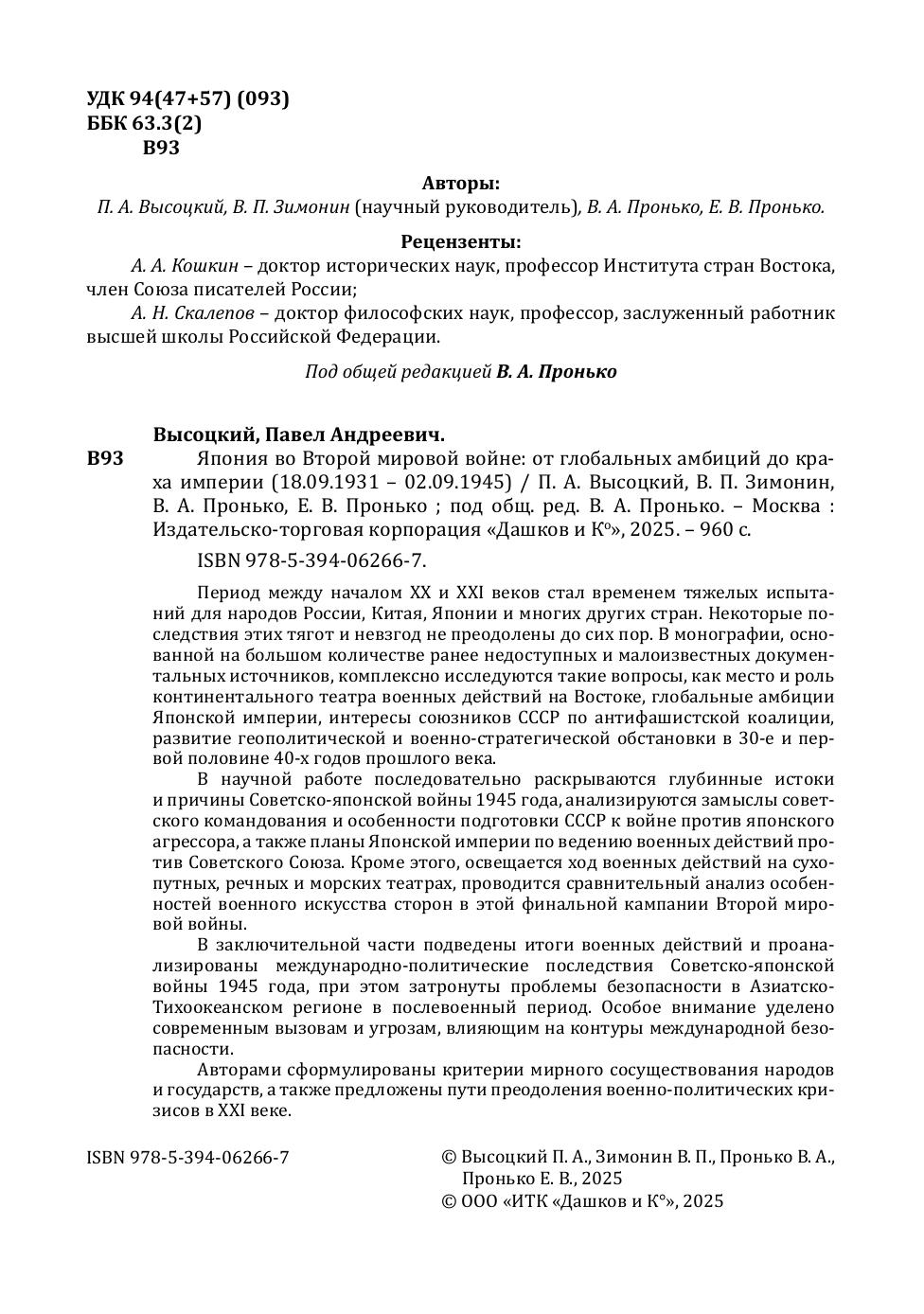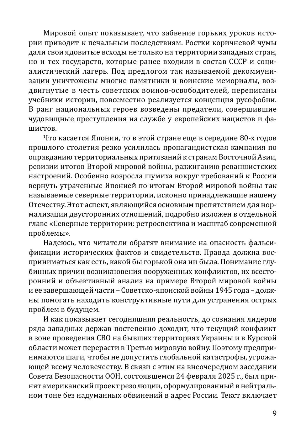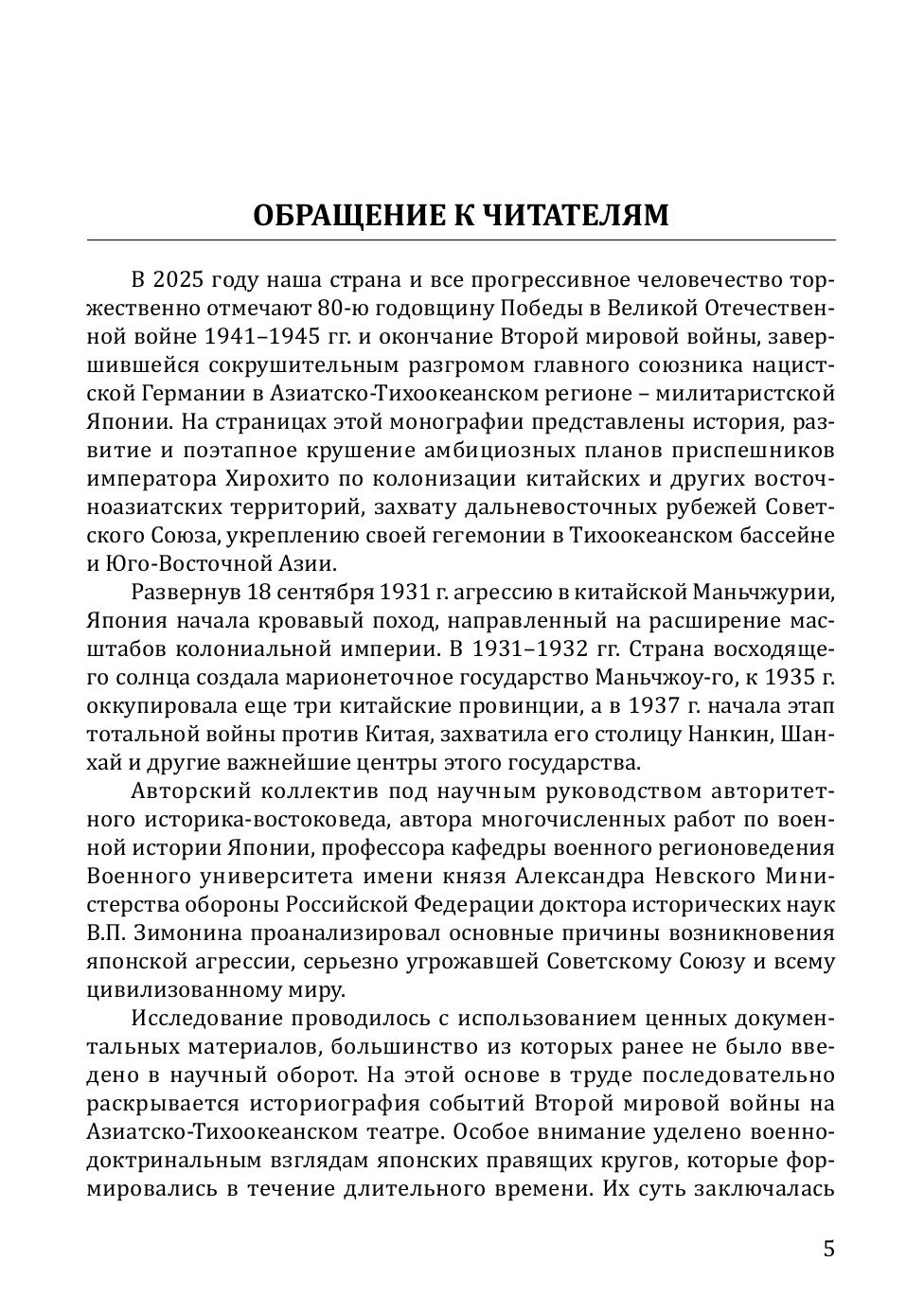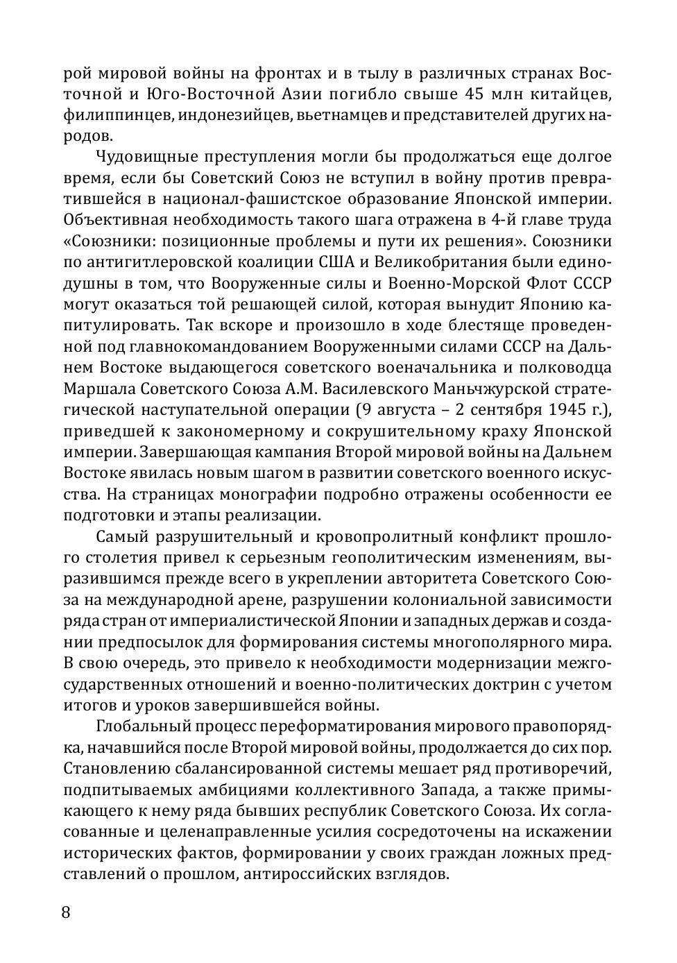Период между началом ХХ и ХХI веков стал временем тяжелых испытаний для народов России, Китая, Японии и многих других стран. Некоторые последствия этих тягот и невзгод не преодолены до сих пор. В монографии, основанной на большом количестве ранее недоступных и малоизвестных документальных источников, комплексно исследуются такие вопросы, как место и роль континентального театра военных действий на Востоке, глобальные амбиции Японской империи, интересы союзников СССР по антифашистской коалиции, развитие геополитической и военно-стратегической обстановки в 30-е и первой половине 40-х годов прошлого века. В научной работе последовательно раскрываются глубинные истоки и причины Советско-японской войны 1945 года, анализируются замыслы советского командования и особенности подготовки СССР к войне против японского агрессора, а также планы Японской империи по ведению военных действий против Советского Союза. Кроме этого, освещается ход военных действий на сухопутных, речных и морских театрах, проводится сравнительный анализ особенностей военного искусства сторон в этой финальной кампании Второй мировой войны. В заключительной части подведены итоги военных действий и проанализированы международно-политические последствия Советско-японской войны 1945 года, при этом затронуты проблемы безопасности в Азиатско- Тихоокеанском регионе в послевоенный период. Особое внимание уделено современным вызовам и угрозам, влияющим на контуры международной безопасности. Авторами сформулированы критерии мирного сосуществования народов и государств, а также предложены пути преодоления военно-политических кризисов в XXI веке.