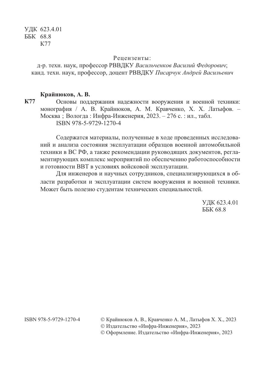 Содержатся материалы, полученные в ходе проведенных исследований и анализа состояния эксплуатации образцов военной автомобильной техники в ВС РФ, а также рекомендации руководящих документов, регламентирующих комплекс мероприятий по обеспечению работоспособности и готовности ВВТ в условиях войсковой эксплуатации.