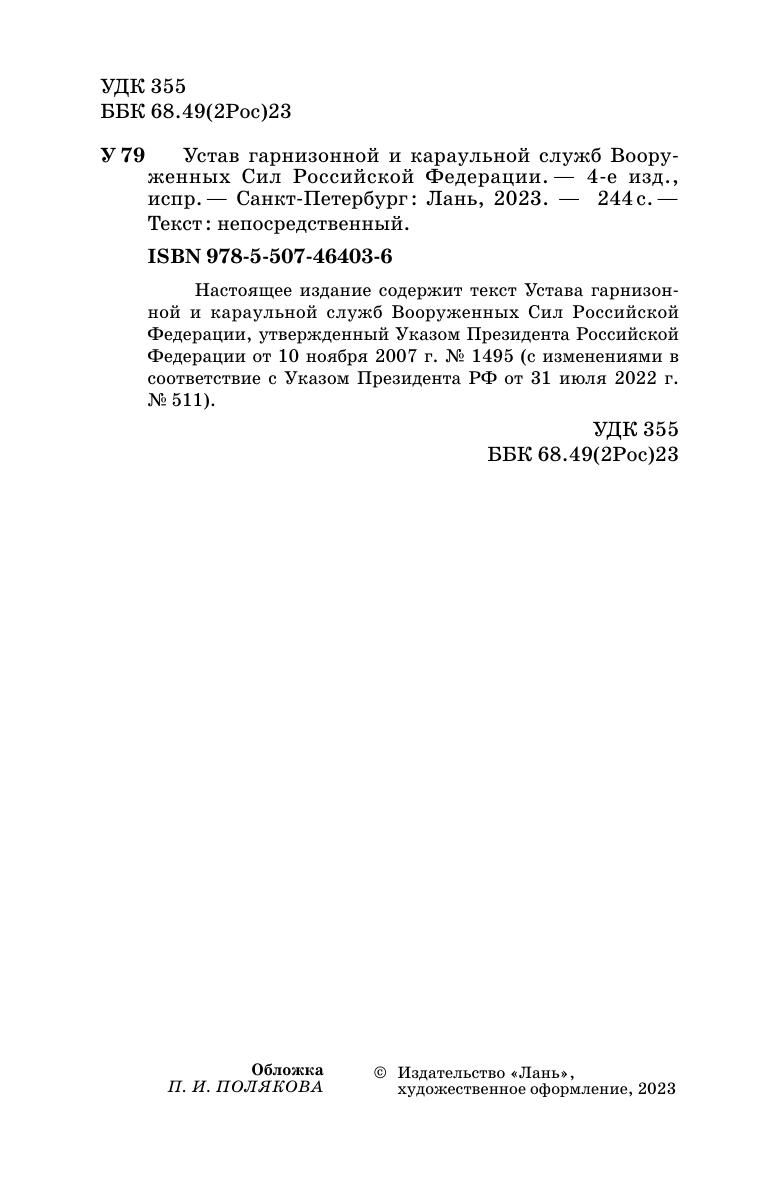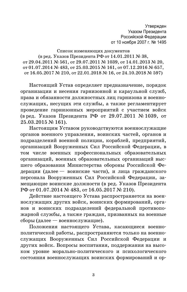Настоящее издание содержит текст Устава гарнизон-ной и караульной служб Вооруженных Сил Российской Федерации, утвержденный Указом Президента Российской Федерации от 10 ноября 2007 г. № 1495 (с изменениями в соответствие с Указом Президента РФ от 31 июля 2022 г. № 511).