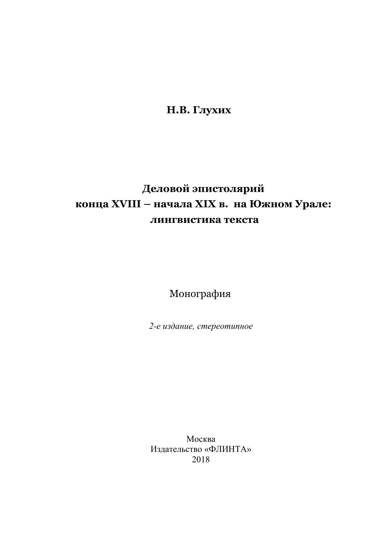 Монография посвящена исследованию текста делового эпистолярия конца XVIII – начала XIX в., выполнена на материале памятников деловой письменности, хранящихся в Объединенном государственном архиве Челябинской области. Анализируются тексты эпистолярной формы разной коммуникативной направленности, определяется место делового эпистолярия в системе русского литературного языка, устанавливаются специфические черты, типологические признаки данных текстов, отношение к формирующейся норме русского литературного языка и русского национального общения. Предназначается филологам, историкам, краеведам, специалистам других наук, интересующимся лингвистикой текста, лингвистическим источниковедением, культурным наследием прошлого, историей Урала.