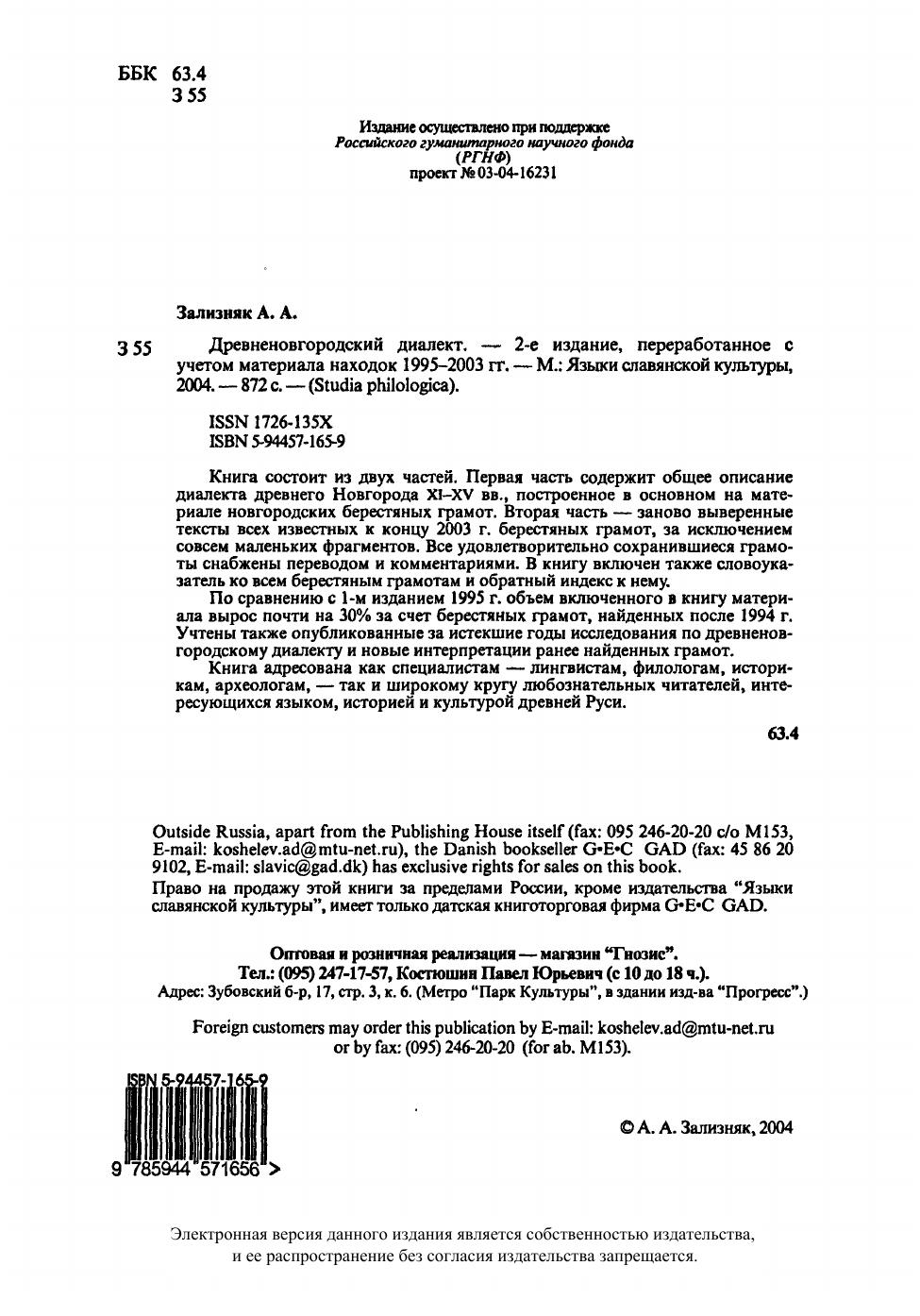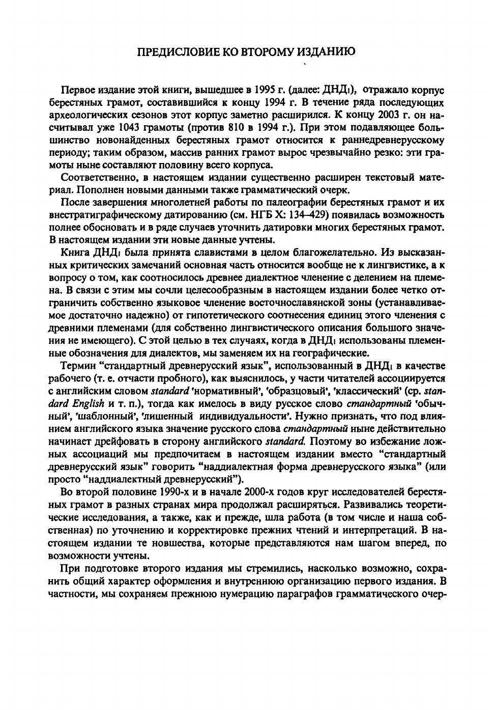Книга состоит из двух частей. Первая часть содержит общее описание диалекта древнего Новгорода XI-XV вв., построенное в основном на материале новгородских берестяных грамот. Вторая часть – заново выверенные тексты всех известных к концу 2003 г. берестяных грамот, за исключением совсем маленьких фрагментов. Все удовлетворительно сохранившиеся грамоты снабжены переводом и комментариями. В книгу включен также словоуказатель ко всем берестяным грамотам и обратный индекс к нему. По сравнению с 1-м изданием 1995 г. объем включенного в книгу материала вырос почти на 30% за счет берестяных грамот, найденных после 1994 г. Учтены также опубликованные за истекшие годы исследования по древненовгородскому диалекту и новые интерпретации ранее найденных грамот. Книга адресована как специалистам – лингвистам, филологам, историкам, археологам, – так и широкому кругу любознательных читателей, интересующихся языком, историей и культурой древней Руси.