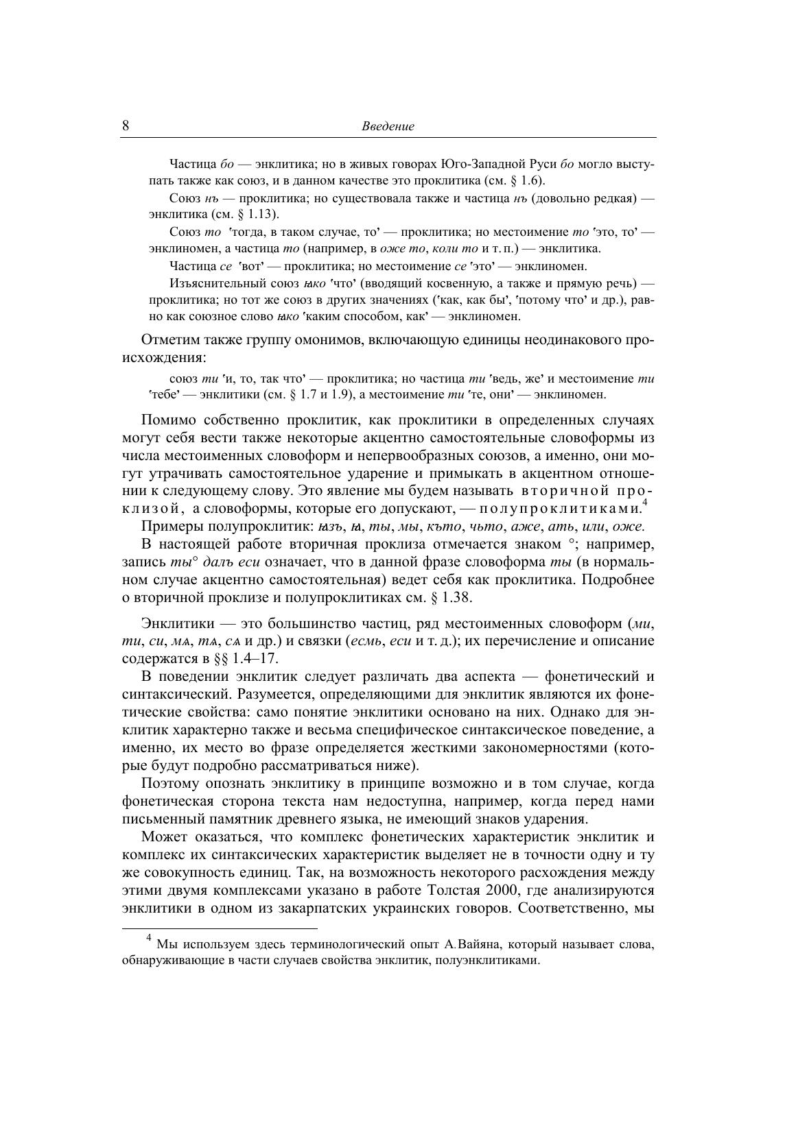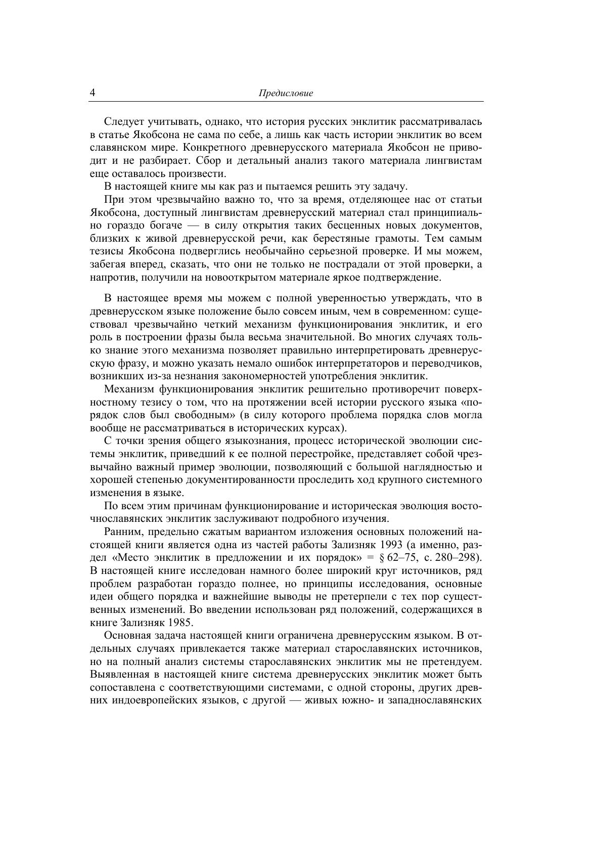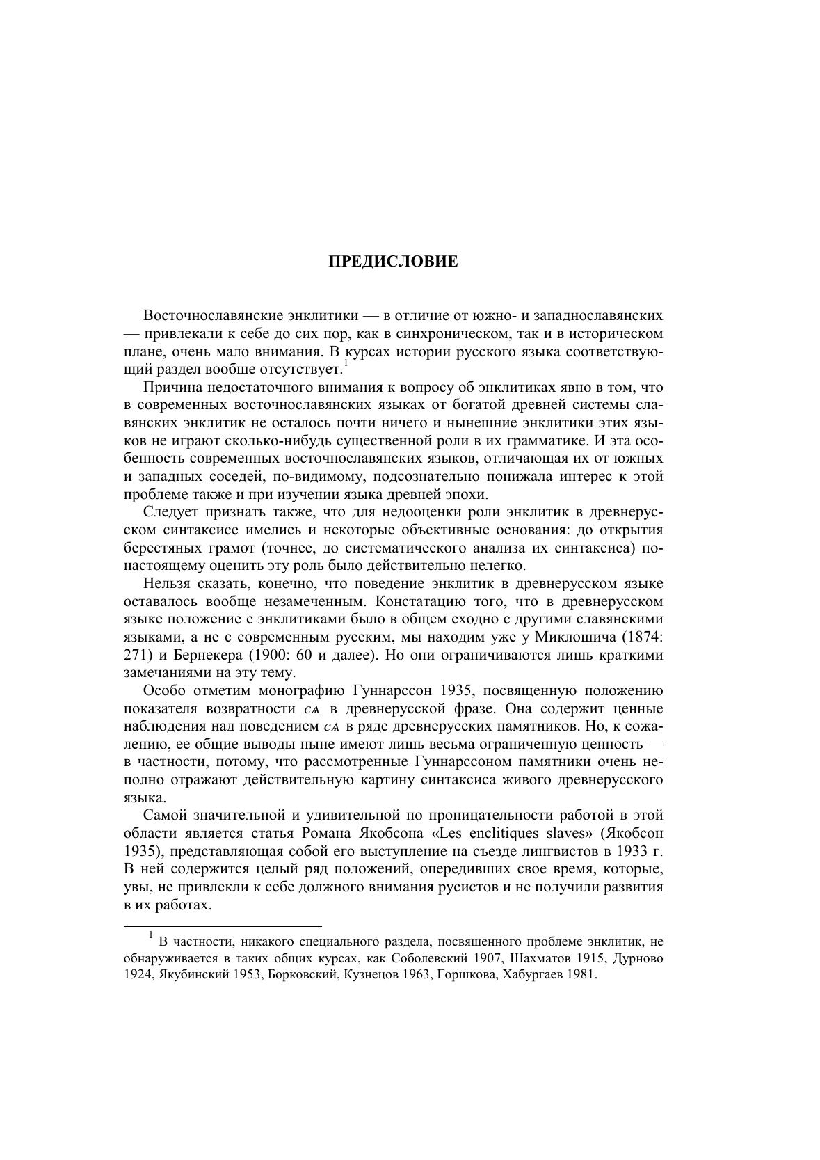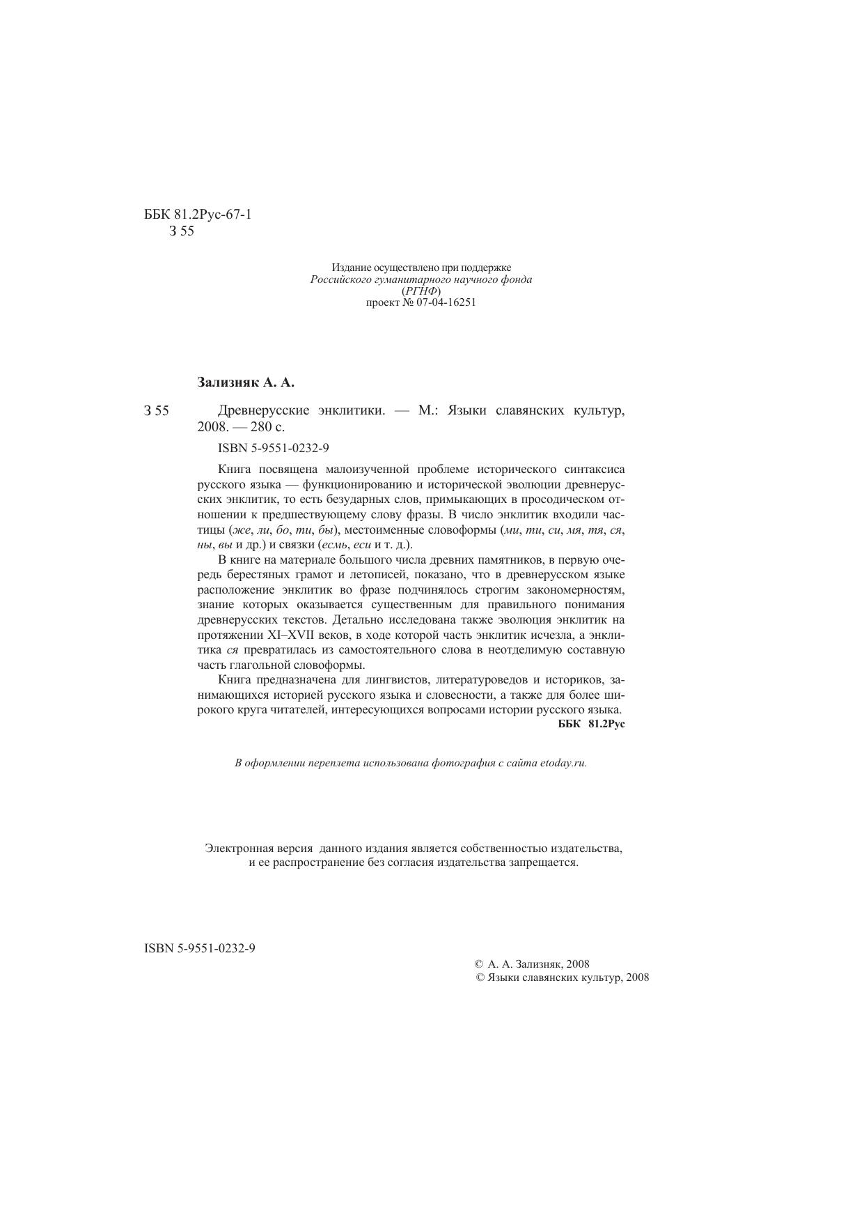 Книга посвящена малоизученной проблеме исторического синтаксиса русского языка – функционированию и исторической эволюции древнерусских энклитик, то есть безударных слов, примыкающих в просодическом отношении к предшествующему слову фразы. В число энклитик входили частицы ( же, ли, бо, ти, бы ), местоименные словоформы ( ми, ти, си, мя, тя, ся, ны, вы и др.) и связки ( есмь, ecu и т. д.). В книге на материале большого числа древних памятников, в первую очередь берестяных грамот и летописей, показано, что в древнерусском языке расположение энклитик во фразе подчинялось строгим закономерностям, знание которых оказывается существенным для правильного понимания древнерусских текстов. Детально исследована также эволюция энклитик на протяжении XI-XVII веков, в ходе которой часть энклитик исчезла, а энклитика ся превратилась из самостоятельного слова в неотделимую составную часть глагольной словоформы. Книга предназначена для лингвистов, литературоведов и историков, занимающихся историей русского языка и словесности, а также для более широкого круга читателей, интересующихся вопросами истории русского языка.