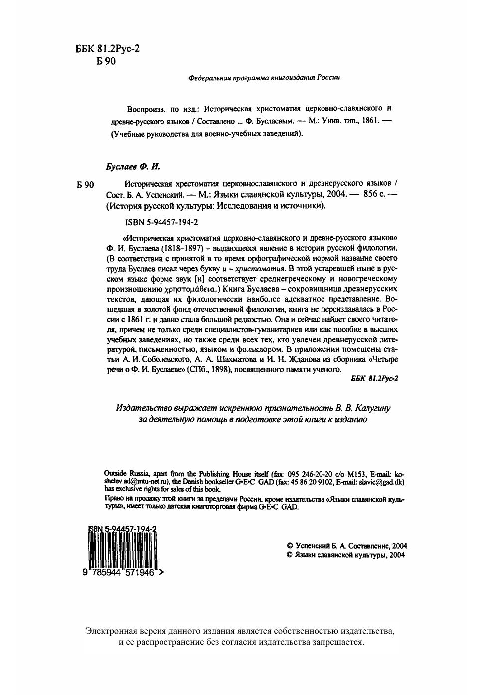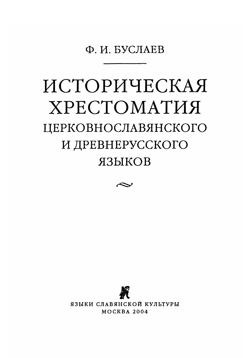 Историческая хрестоматия церковно-славянского и древнерусского языков Ф.И. Буслаева (1818-1897) - выдающееся явление в истории русской филологии. Книга Буслаева - сокровищница древнерусских текстов, дающая их филологически наиболее адекватное представление. Вошедшая в золотой фонд отечественной филологии, книга не переиздавалась в России с 1861 г. и давно стала большой редкостью. Она и сейчас найдет своего читателя, причем не только среди специалистов-гуманитариев или как пособие в высших учебных заведениях, но также среди всех тех, кто увлечен древнерусской литературой, письменностью, языком и фольклором. В приложении помещены статьи А.И.Соболевского, А.А.Шахматова и И.Н.Жданова из сборника "Четыре речи о Ф.И.Буслаеве" (СПб., 1898), посвященного памяти ученого. Для научных работников, широкого круга специалистов-гуманитариев, студентов и преподавателей вузов.