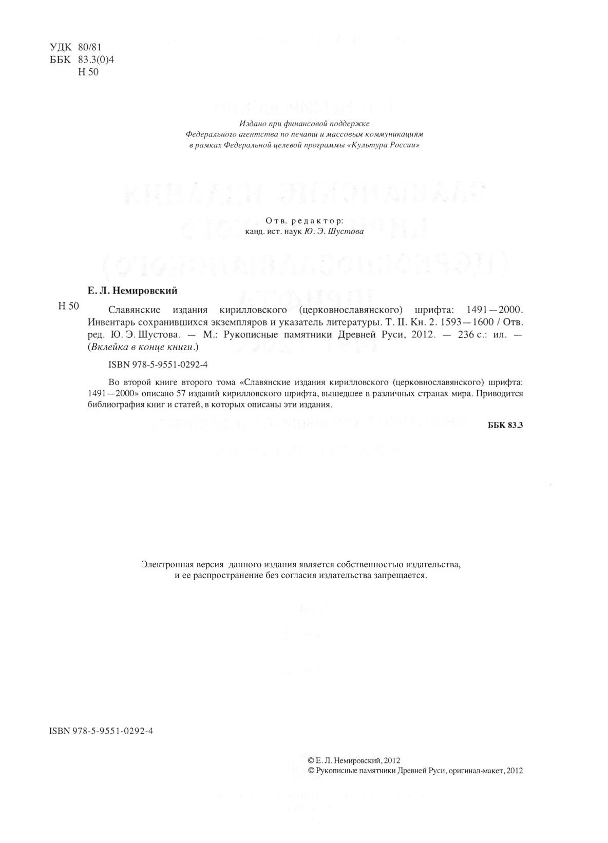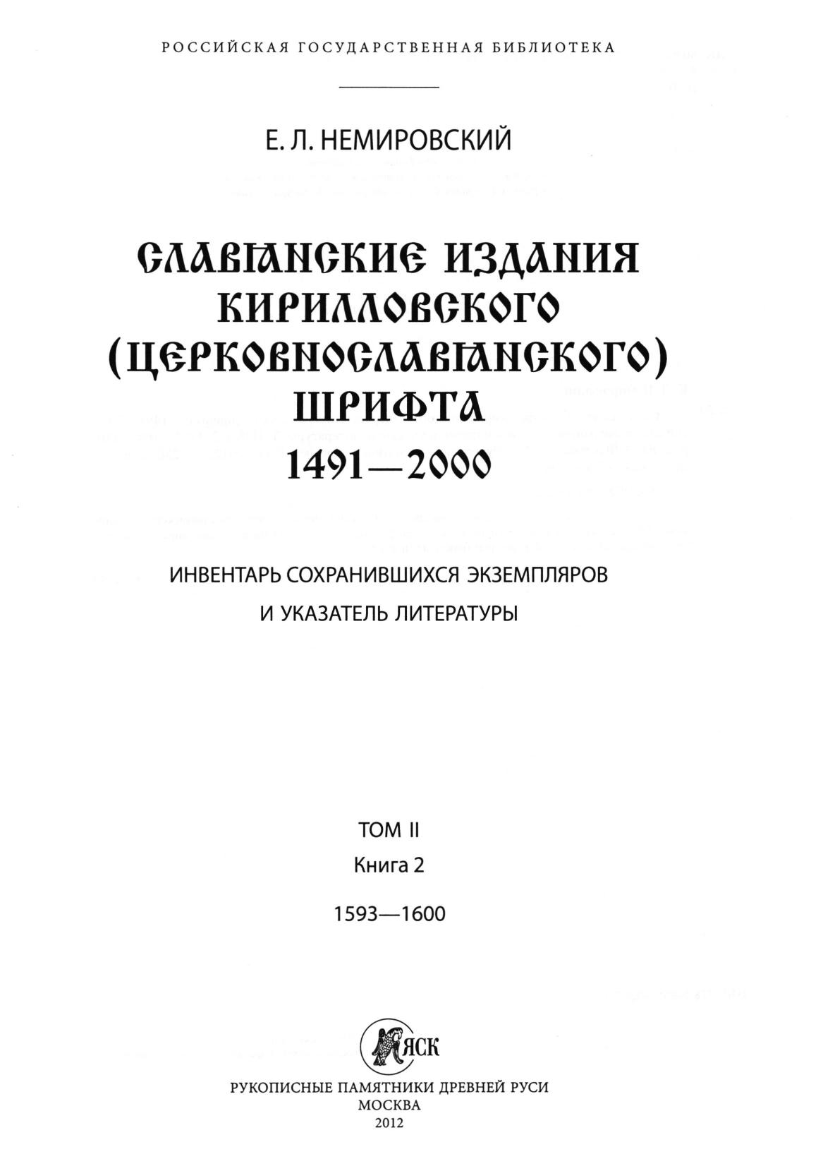 Славянские издания кирилловского (церковнославянского) шрифта: 1491—2000. Инвентарь сохранившихся экземпляров и указатель литературы. Т. II. Кн. 2. 1593—1600