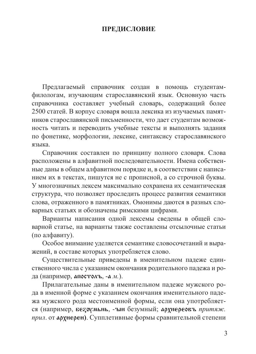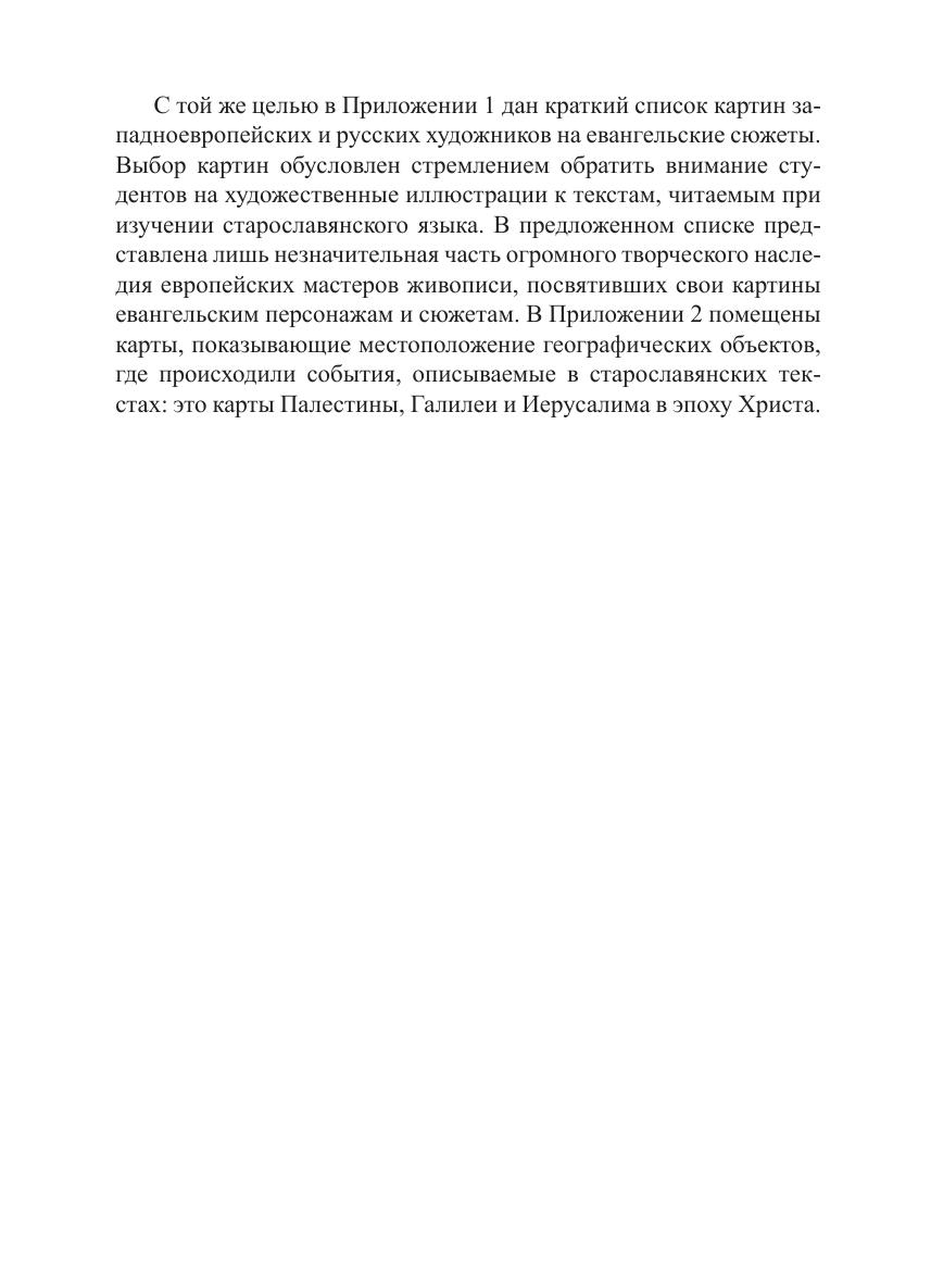 Справочник содержит более 2500 слов из памятников старославянской письменности, что дает возможность читать и переводить учебные тексты и выполнять задания по фонетике, морфологии, лексике, синтаксису старославянского языка. В приложениях дан краткий список картин западноевропейских и русских художников на евангельские сюжеты, а также карты исторических областей, где происходили события в эпоху Иисуса Христа. Справочник предназначен для студентов-филологов, изучающих курс «Старославянский язык».