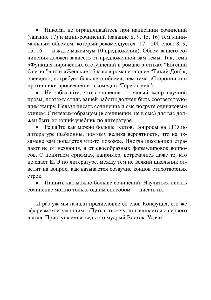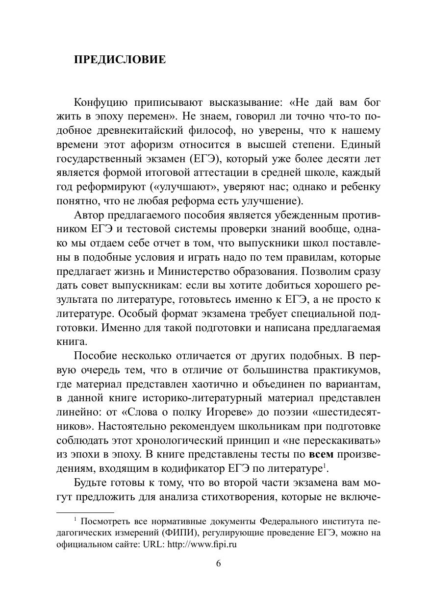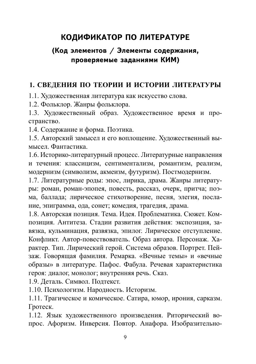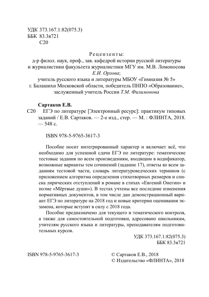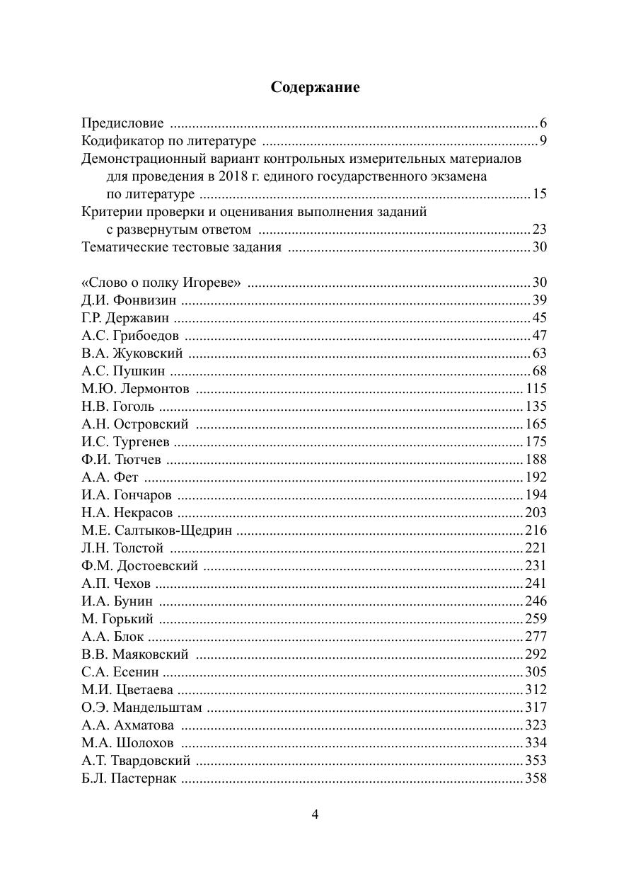 Пособие носит интегрированный характер и включает всё, что необходимо для успешной сдачи ЕГЭ по литературе: тематические тестовые задания по всем произведениям, входящим в кодификатор, возможные варианты тем сочинений (задание 17), ответы ко всем заданиям тестовой части, словарь литературоведческих терминов (с приложением алгоритма определения стихотворных размеров и списка лирических отступлений в романе в стихах «Евгений Онегин» и поэме «Мёртвые души»). В тестах учтены все последние изменения нормативных документов, в том числе дан демонстрационный вариант ЕГЭ по литературе на 2018 год и новые критерии оценивания экзамена, которые вступят в силу с 2018 года. Пособие предназначено для текущего и тематического контроля, а также для самостоятельной подготовки, адресовано школьникам, учителям русского языка и литературы, преподавателям подготовительных курсов.