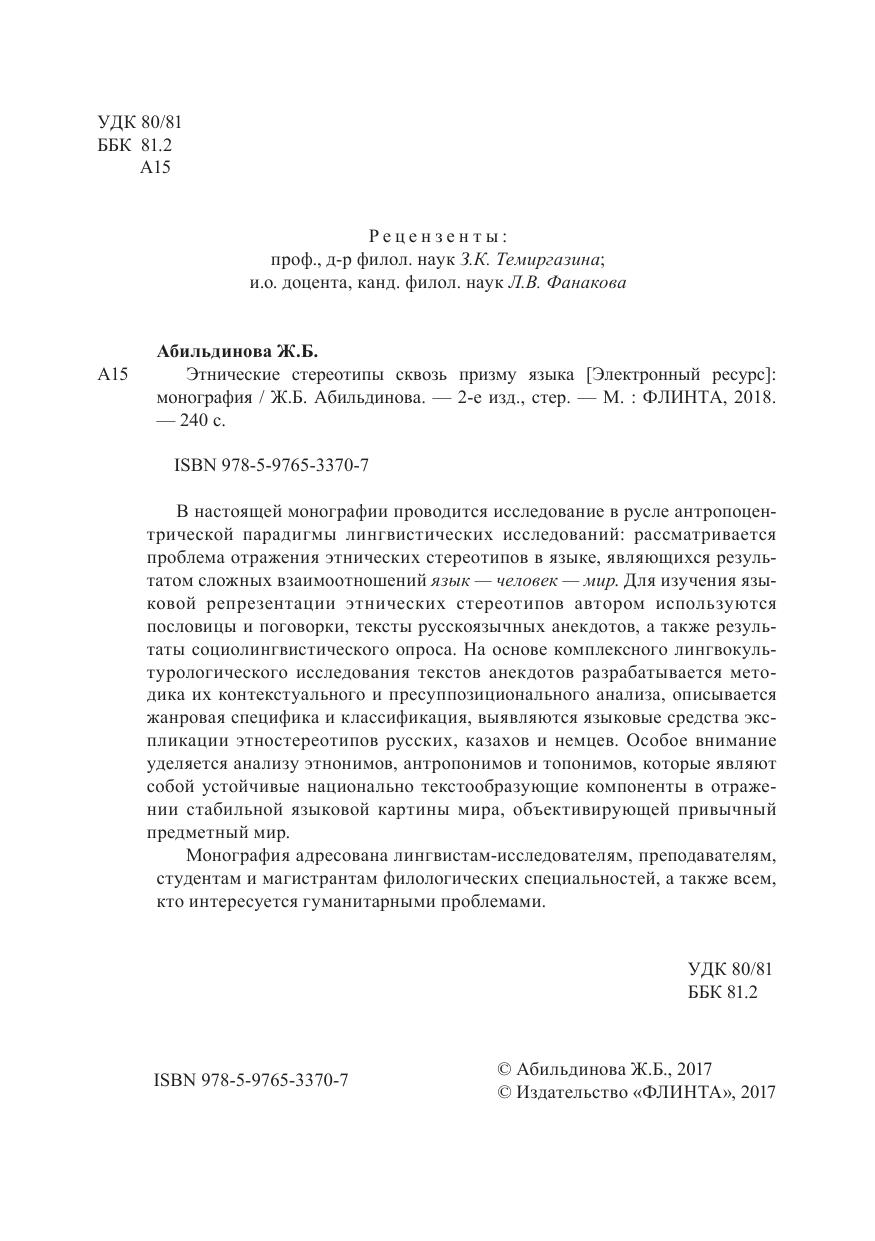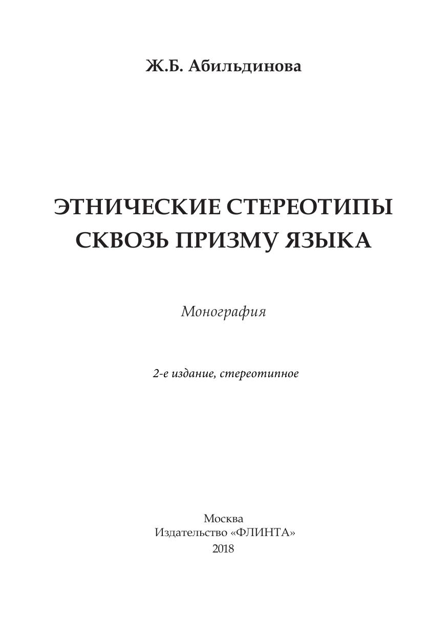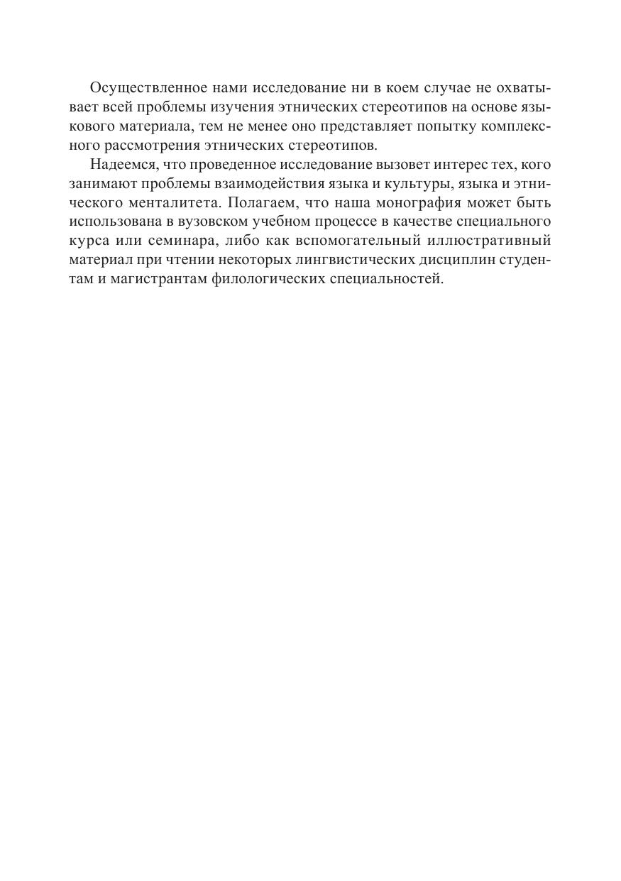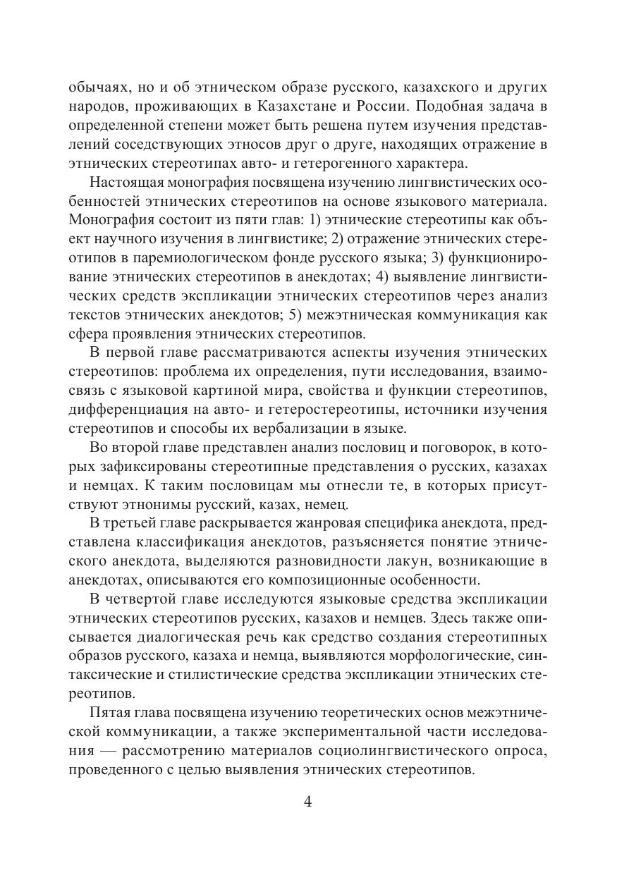В настоящей монографии проводится исследование в русле антропоцентрической парадигмы лингвистических исследований: рассматривается проблема отражения этнических стереотипов в языке, являющихся результатом сложных взаимоотношений язык — человек — мир. Для изучения языковой репрезентации этнических стереотипов автором используются пословицы и поговорки, тексты русскоязычных анекдотов, а также результаты социолингвистического опроса. На основе комплексного лингвокультурологического исследования текстов анекдотов разрабатывается методика их контекстуального и пресуппозиционального анализа, описывается жанровая специфика и классификация, выявляются языковые средства экспликации этностереотипов русских, казахов и немцев. Особое внимание уделяется анализу этнонимов, антропонимов и топонимов, которые являют собой устойчивые национально текстообразующие компоненты в отражении стабильной языковой картины мира, объективирующей привычный предметный мир. Монография адресована лингвистам-исследователям, преподавателям, студентам и магистрантам филологических специальностей, а также всем, кто интересуется гуманитарными проблемами.