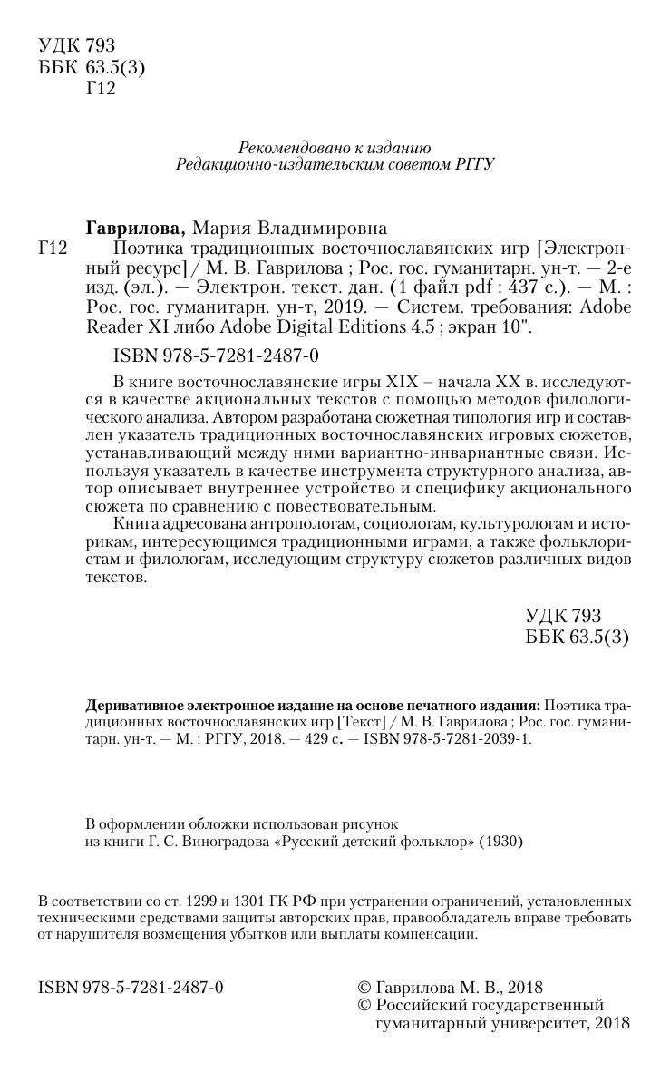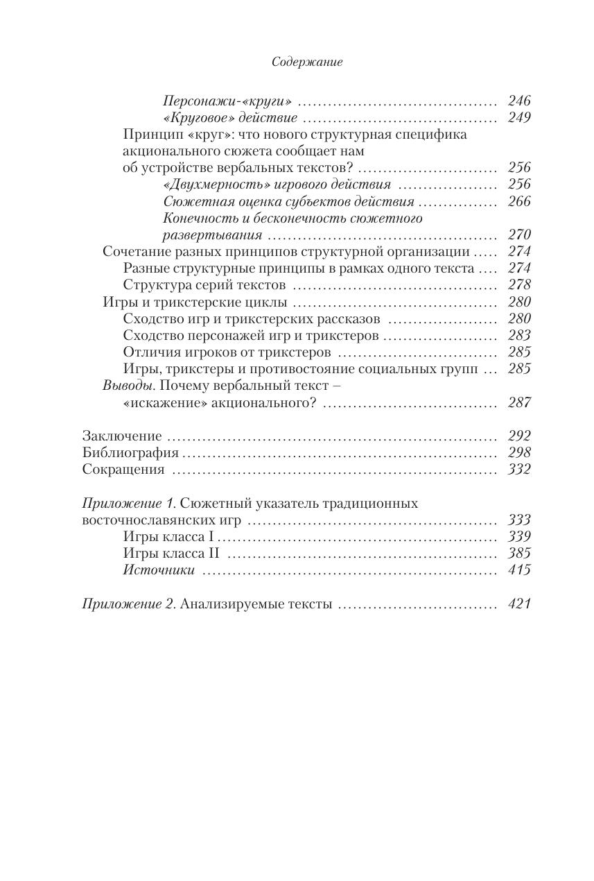 В книге восточнославянские игры XIX — начала XX в. исследуются в качестве акциональных текстов с помощью методов филологического анализа. Автором разработана сюжетная типология игр и составлен указатель традиционных восточнославянских игровых сюжетов, устанавливающий между ними вариантно-инвариантные связи. Используя указатель в качестве инструмента структурного анализа, автор описывает внутреннее устройство и специфику акционального сюжета по сравнению с повествовательным.