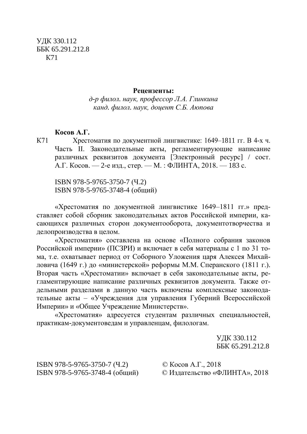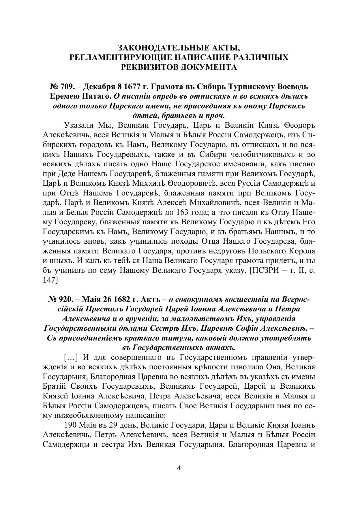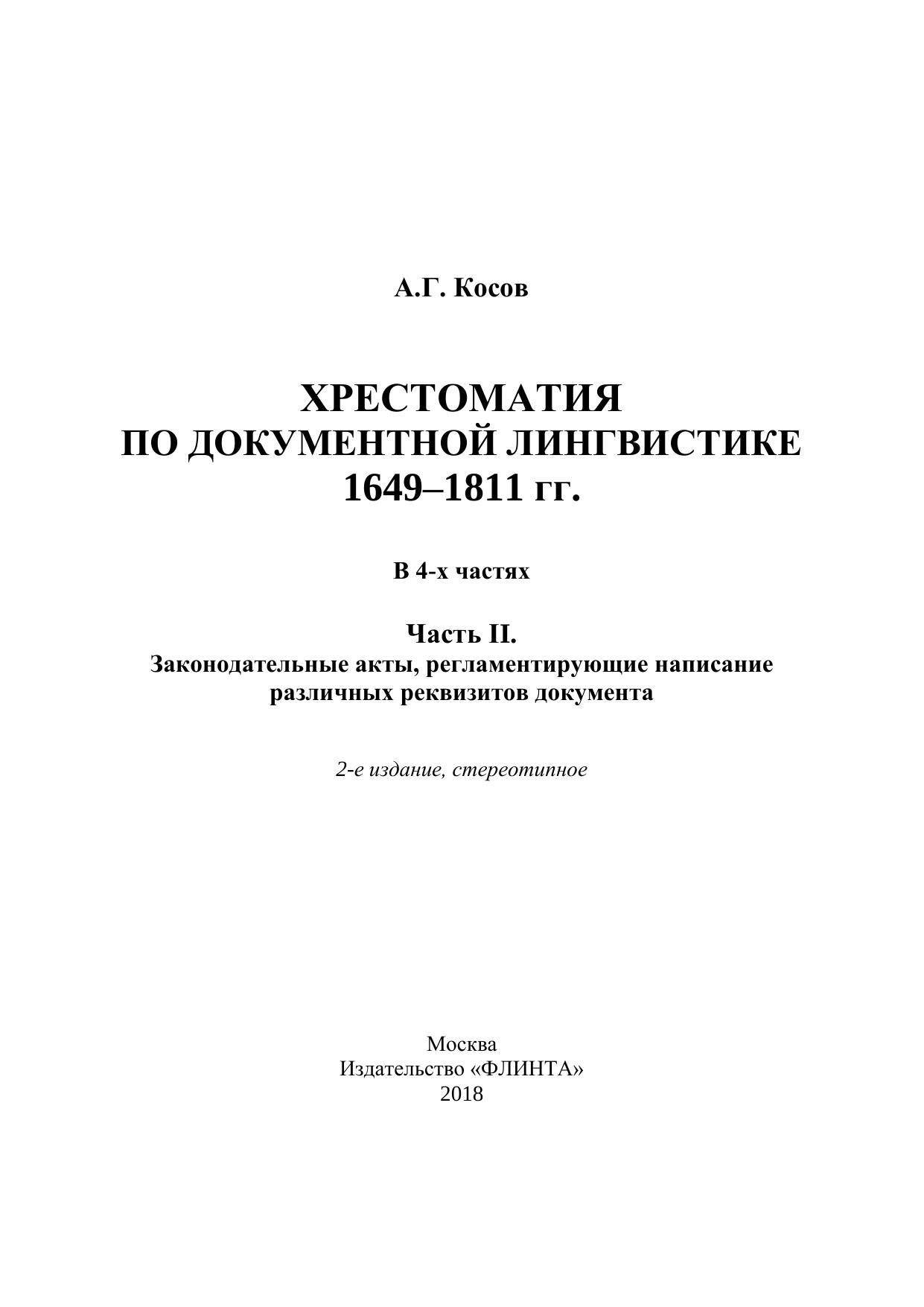 Хрестоматия по документной лингвистике: 1649–1811 гг. В 4-х ч. Часть II. Законодательные акты, регламентирующие написание различных реквизитов документа