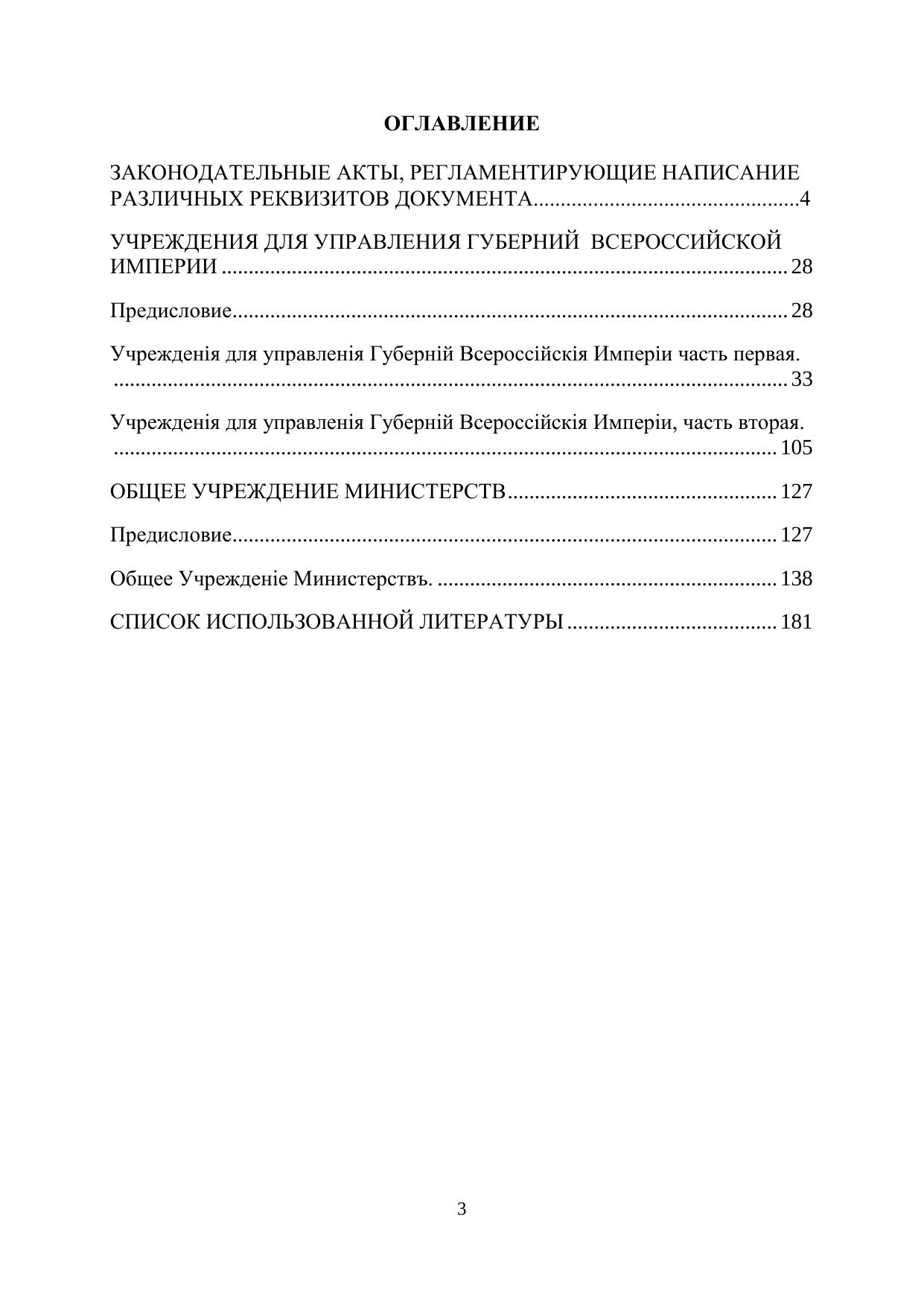 «Хрестоматия» составлена на основе «Полного собрания законов Российской империи» (ПСЗРИ) и включает в себя материалы с 1 по 31 тома, т.е. охватывает период от Соборного Уложения царя Алексея Михайловича (1649 г.) до «министерской» реформы М.М. Сперанского (1811 г.). Вторая часть «Хрестоматии» включает в себя законодательные акты, регламентирующие написание различных реквизитов документа. Также отдельными разделами в данную часть включены комплексные законодательные акты – «Учреждения для управления Губерний Всероссийской Империи» и «Общее Учреждение Министерств». «Хрестоматия» адресуется студентам различных специальностей, практикам-документоведам и управленцам, филологам.
