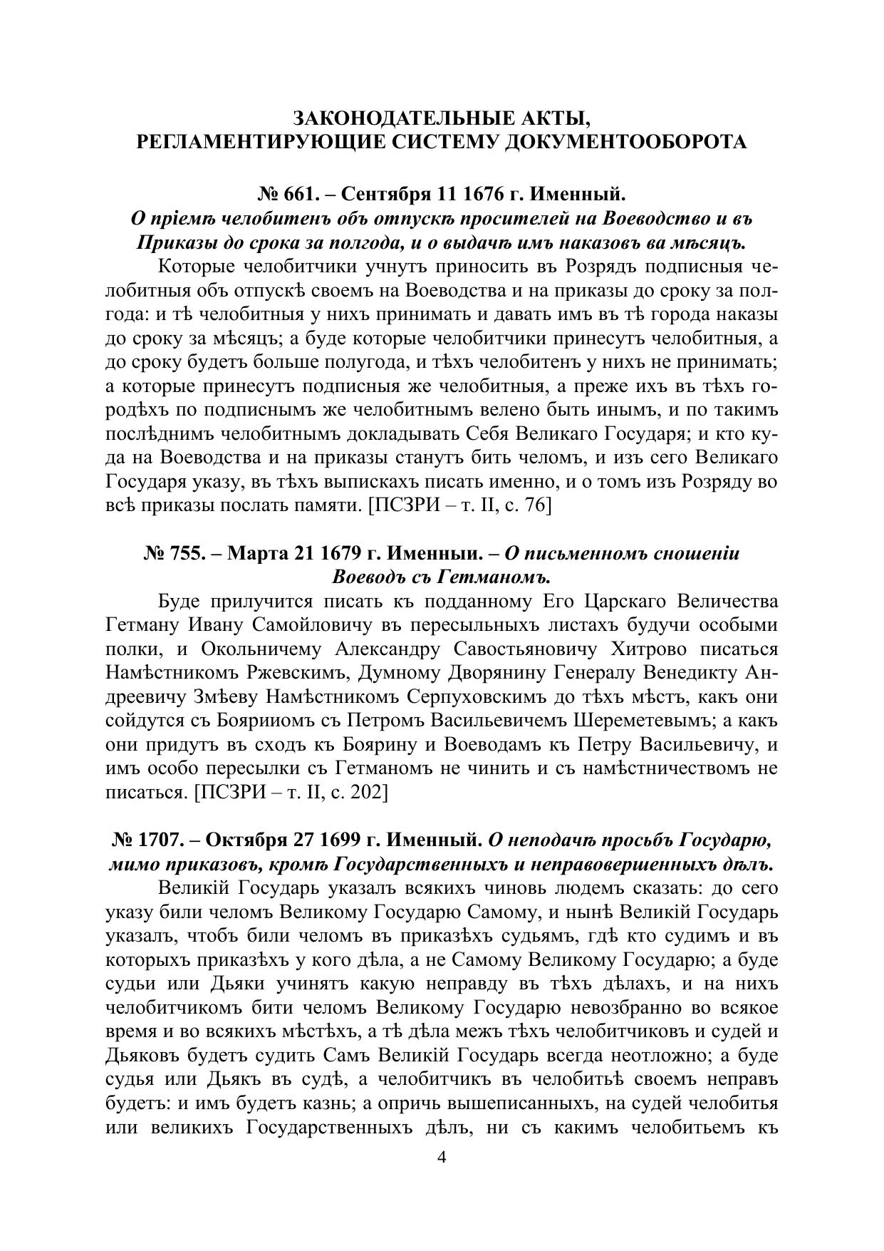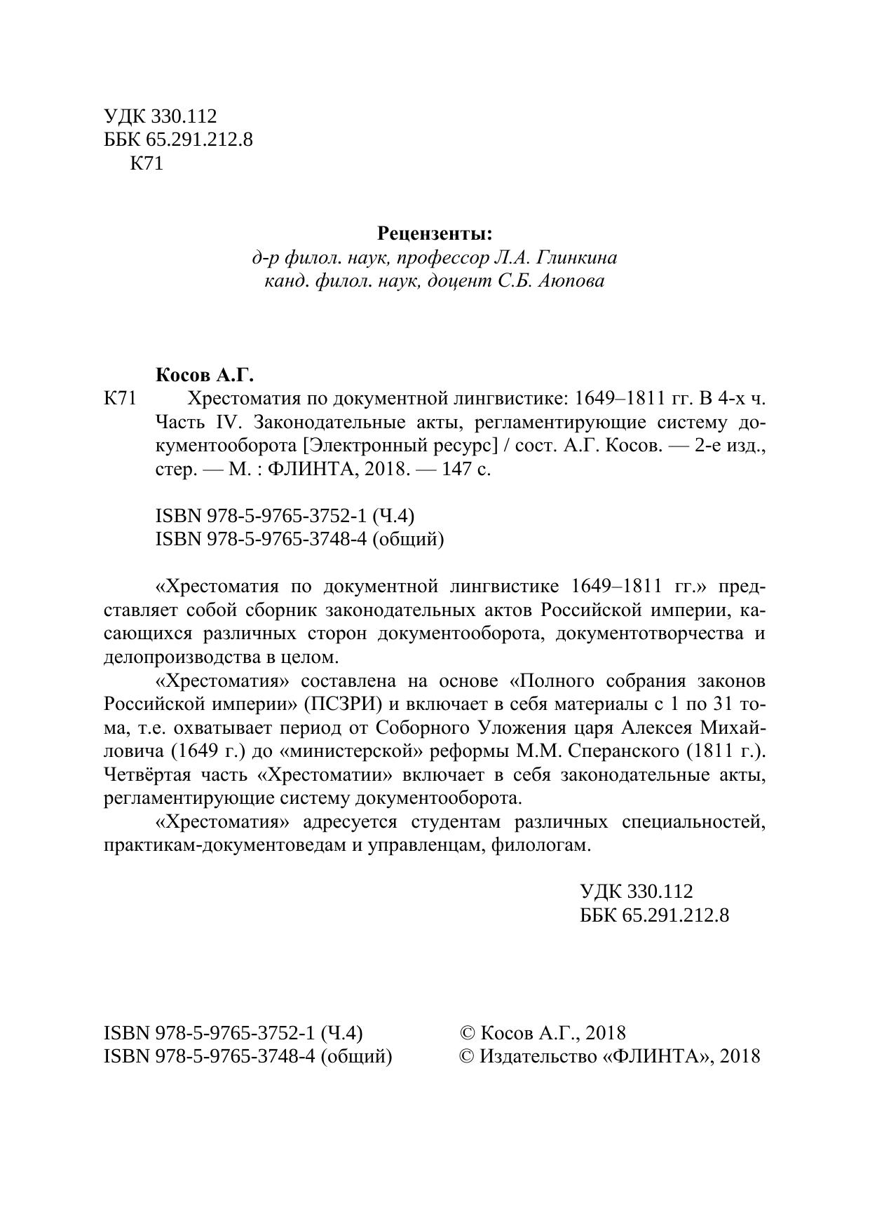 Хрестоматия по документной лингвистике: 1649–1811 гг. В 4-х ч. Часть IV. Законодательные акты, регламентирующие систему документооборота