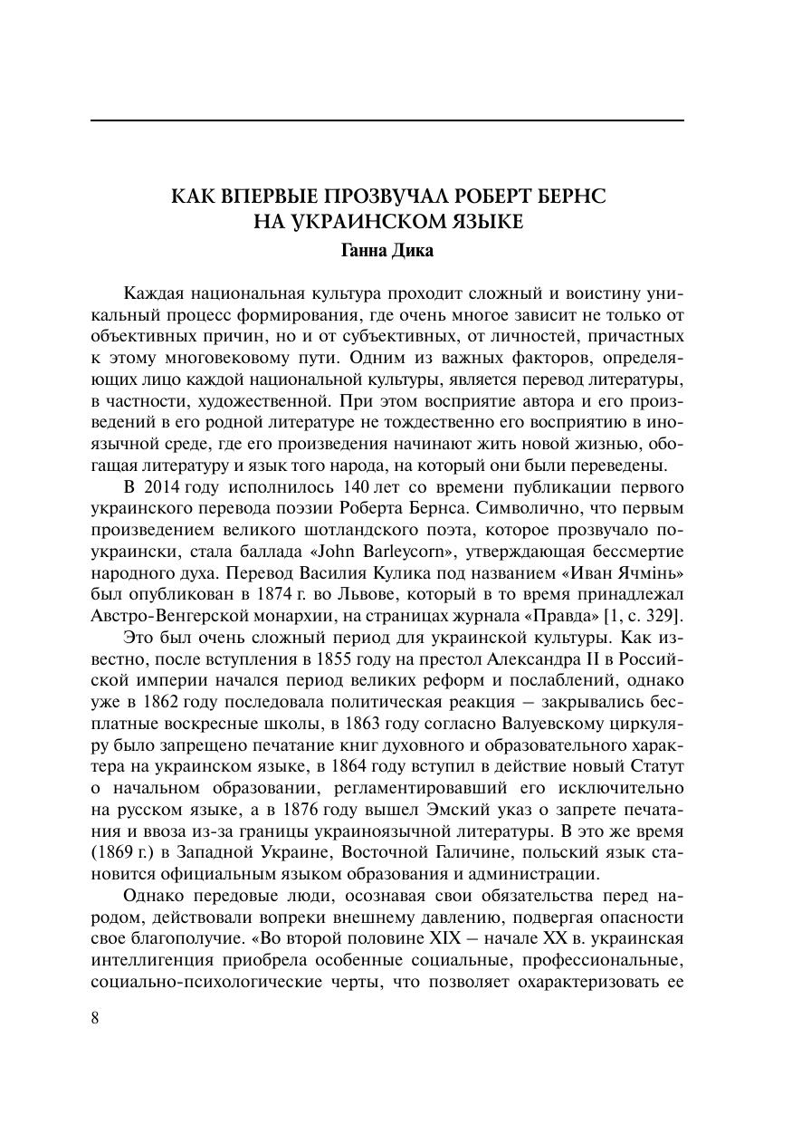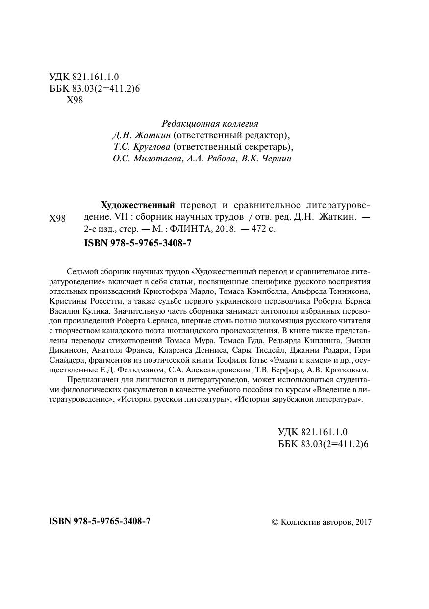 Седьмой сборник научных трудов «Художественный перевод и сравнительное литературоведение» включает в себя статьи, посвященные специфике русского восприятия отдельных произведений Кристофера Марло, Томаса Кэмпбелла, Альфреда Теннисона, Кристины Россетти, а также судьбе первого украинского переводчика Роберта Бернса Василия Кулика. Значительную часть сборника занимает антология избранных переводов произведений Роберта Сервиса, впервые столь полно знакомящая русского читателя с творчеством канадского поэта шотландского происхождения. В книге также представлены переводы стихотворений Томаса Мура, Томаса Гуда, Редьярда Кип линга, Эмили Дикинсон, Анатоля Франса, Кларенса Денниса, Сары Тисдейл, Джанни Родари, Гэри Снайдера, фрагментов из поэтической книги Теофиля Готье «Эмали и камеи» и др., осуществленные Е.Д. Фельдманом, С.А. Александровским, Т.В. Берфорд, А.В. Кротковым. Предназначен для лингвистов и литературоведов, может использоваться студентами филологических факультетов в качестве учебного пособия по курсам «Введение в литературоведение», «История русской литературы», «История зарубежной литературы».