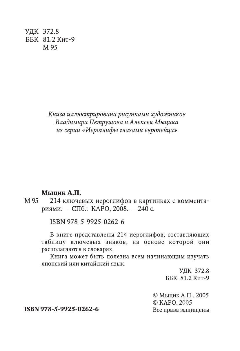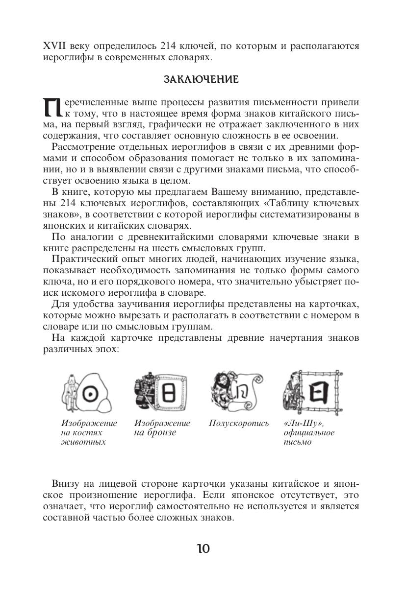 В книге представлены 214 иероглифов, составляющих таблицу ключевых знаков, на онове которой они располагаются в словарях. Книга может быть полезна всем начинающим изучать японский или китайский язык.