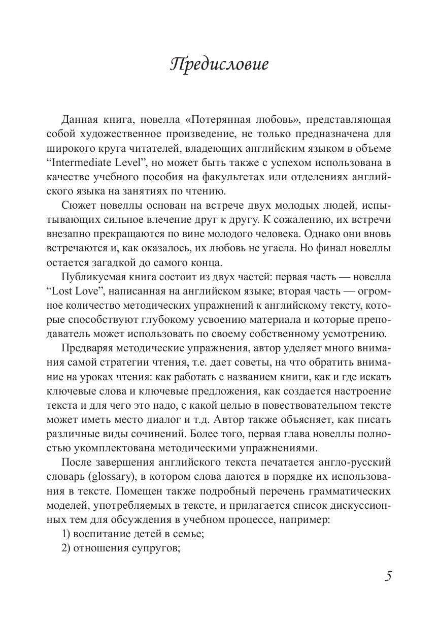 Пособие состоит из двух частей: первая часть — новелла “Lost Love”, написанная на английском языке; вторая часть — упражнения, которые способствуют глубокому усвоению материала. Автор уделяет много внимания стратегии чтения, дает рекомендации, как работать с названием книги, как и где искать ключевые слова и предложения и т.д. Автор также объясняет, как писать различные виды сочинений. В конце английского текста представлены англо-русский словарь, подробный перечень употребляемых грамматических моделей и список дискуссионных тем.