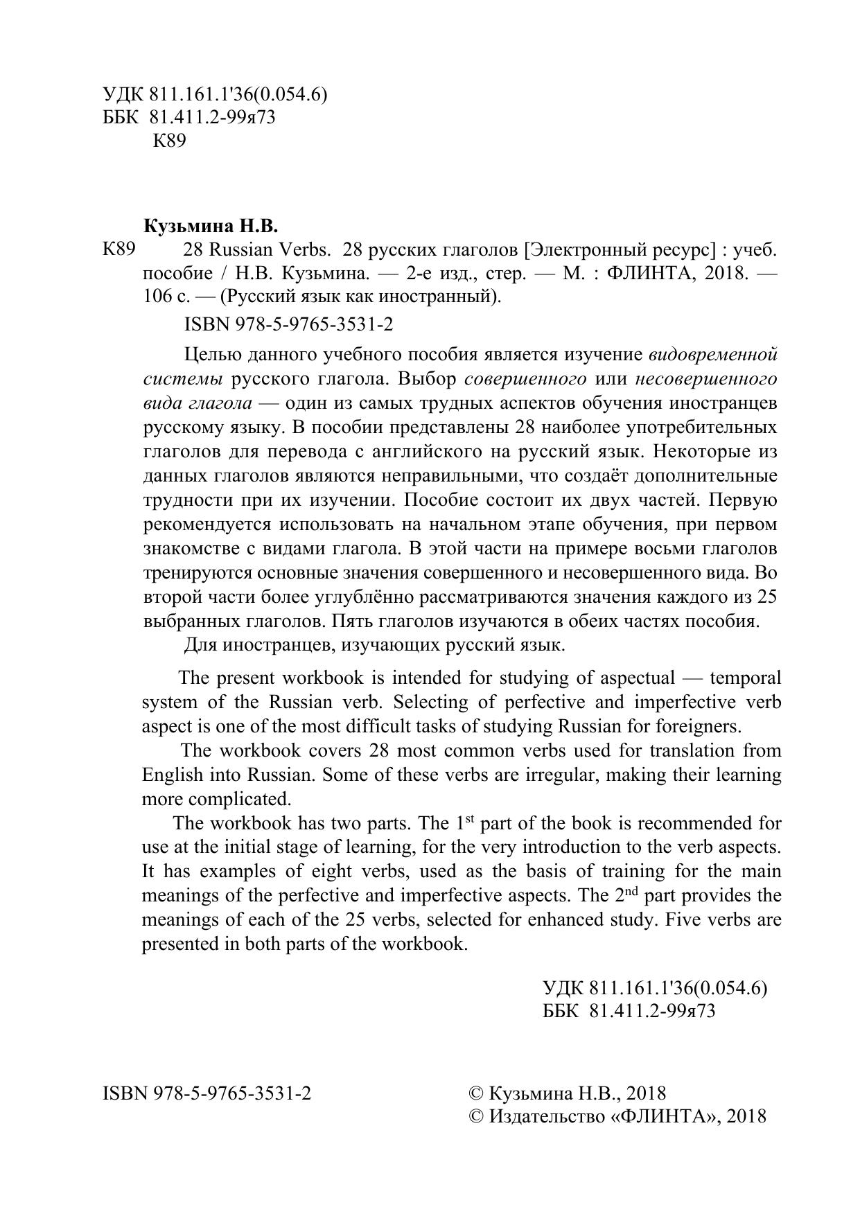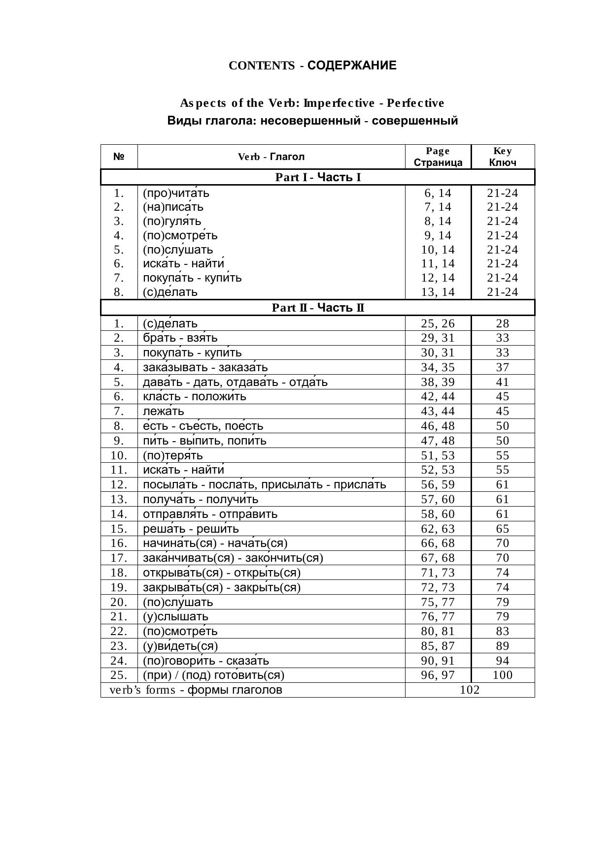 The workbook has two parts. The 1st part of the book is recommended for use at the initial stage of learning, for the very introduction to the verb aspects. It has examples of eight verbs, used as the basis of training for the main meanings of the perfective and imperfective aspects. The 2nd part provides the meanings of each of the 25 verbs, selected for enhanced study. Five verbs are presented in both parts of the workbook.