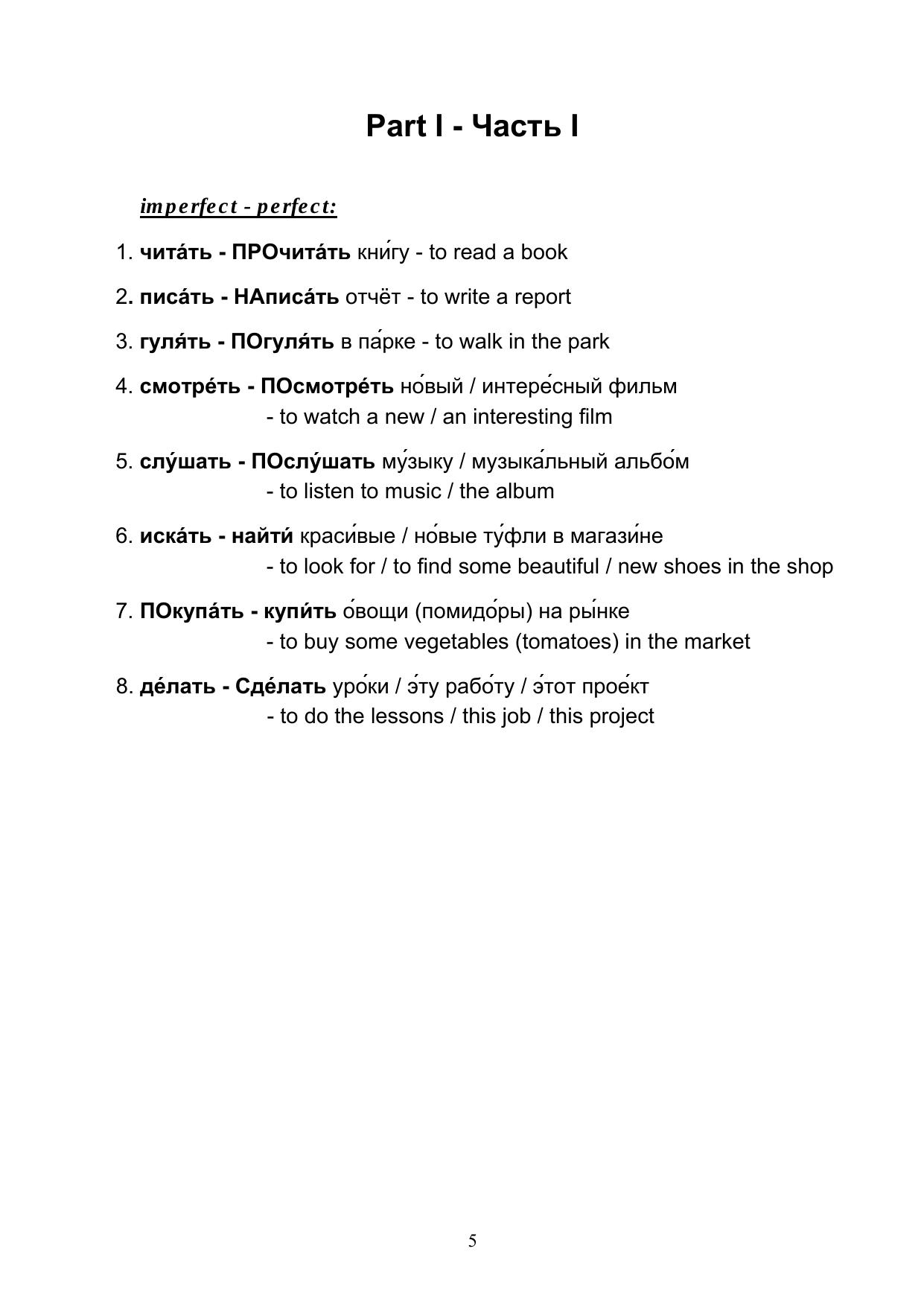 Целью данного учебного пособия является изучение видовременной системы русского глагола. Выбор совершенного или несовершенного вида глагола — один из самых трудных аспектов обучения иностранцев русскому языку. В пособии представлены 28 наиболее употребительных глаголов для перевода с английского на русский язык. Некоторые из данных глаголов являются неправильными, что создаёт дополнительные трудности при их изучении. Пособие состоит их двух частей. Первую рекомендуется использовать на начальном этапе обучения, при первом знакомстве с видами глагола. В этой части на примере восьми глаголов тренируются основные значения совершенного и несовершенного вида. Во второй части более углублённо рассматриваются значения каждого из 25 выбранных глаголов. Пять глаголов изучаются в обеих частях пособия.