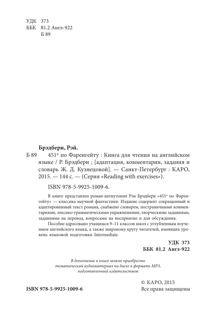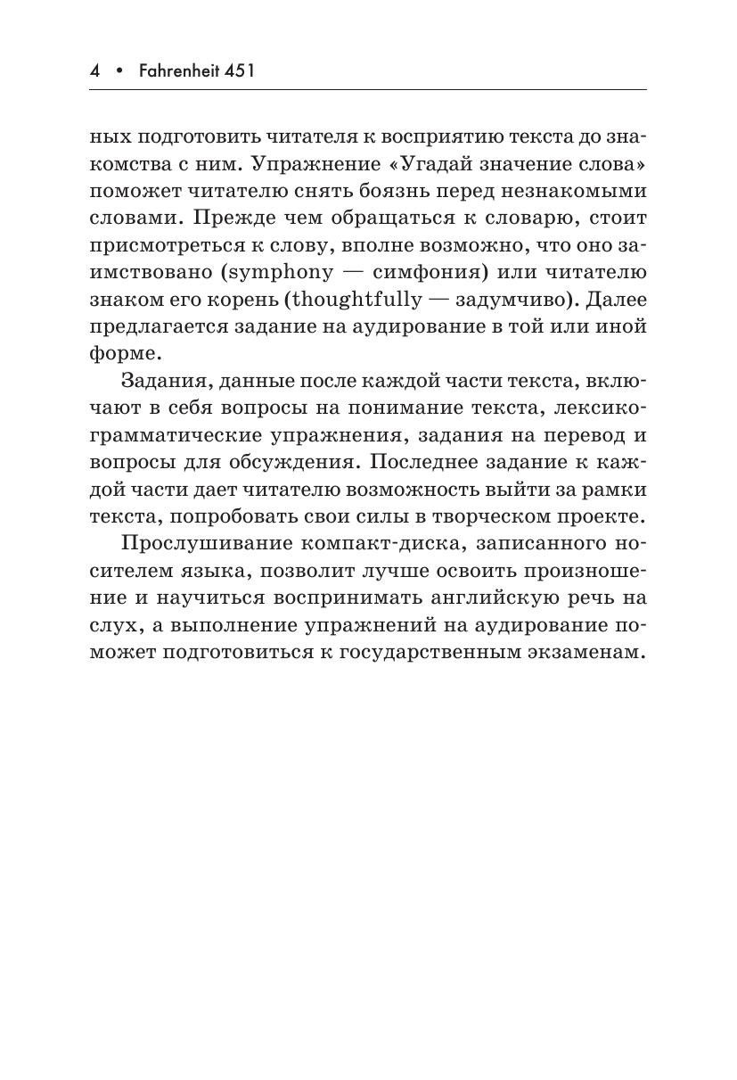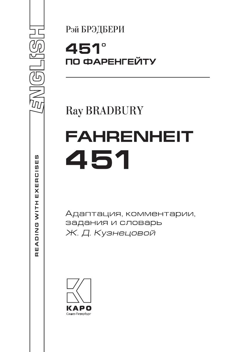 В книге представлен роман-антиутопия Рэя Брэдбери «451º по Фаренгейту» — классика научной фантастики. Издание содержит сокращенный и адаптированный текст романа, снабжено словарем, постраничными комментариями, лексико-грамматическими упражнениями, творческими заданиями, заданиями на перевод, вопросами на восприятие и для обсуждения. Пособие адресовано учащимся 9–11 классов школ с углубленным изучени ем английского языка, а также широкому кругу читателей, имеющих уровень языковой подготовки Intermediate.