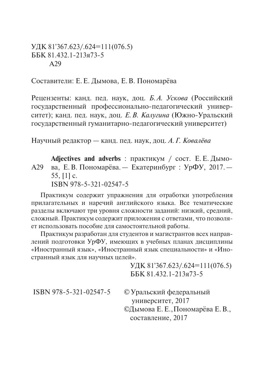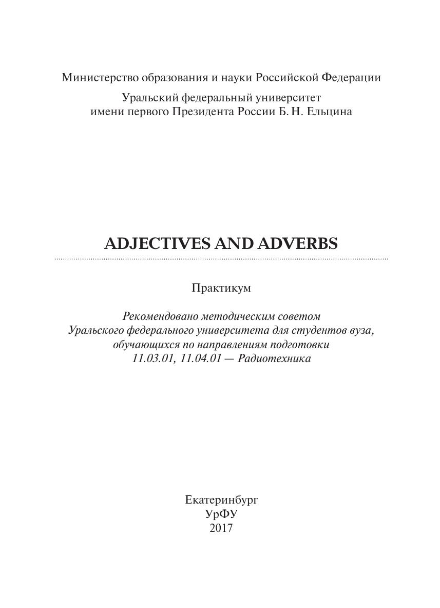 Практикум содержит упражнения для отработки употребления прилагательных и наречий английского языка. Все тематические разделы включают три уровня сложности заданий: низкий, средний, сложный. Практикум содержит приложения с ответами, что позволяет использовать пособие для самостоятельной работы. Практикум разработан для студентов и магистрантов всех направлений подготовки УрФУ, имеющих в учебных планах дисциплины «Иностранный язык», «Иностранный язык специальности» и «Иностранный язык для научных целей».