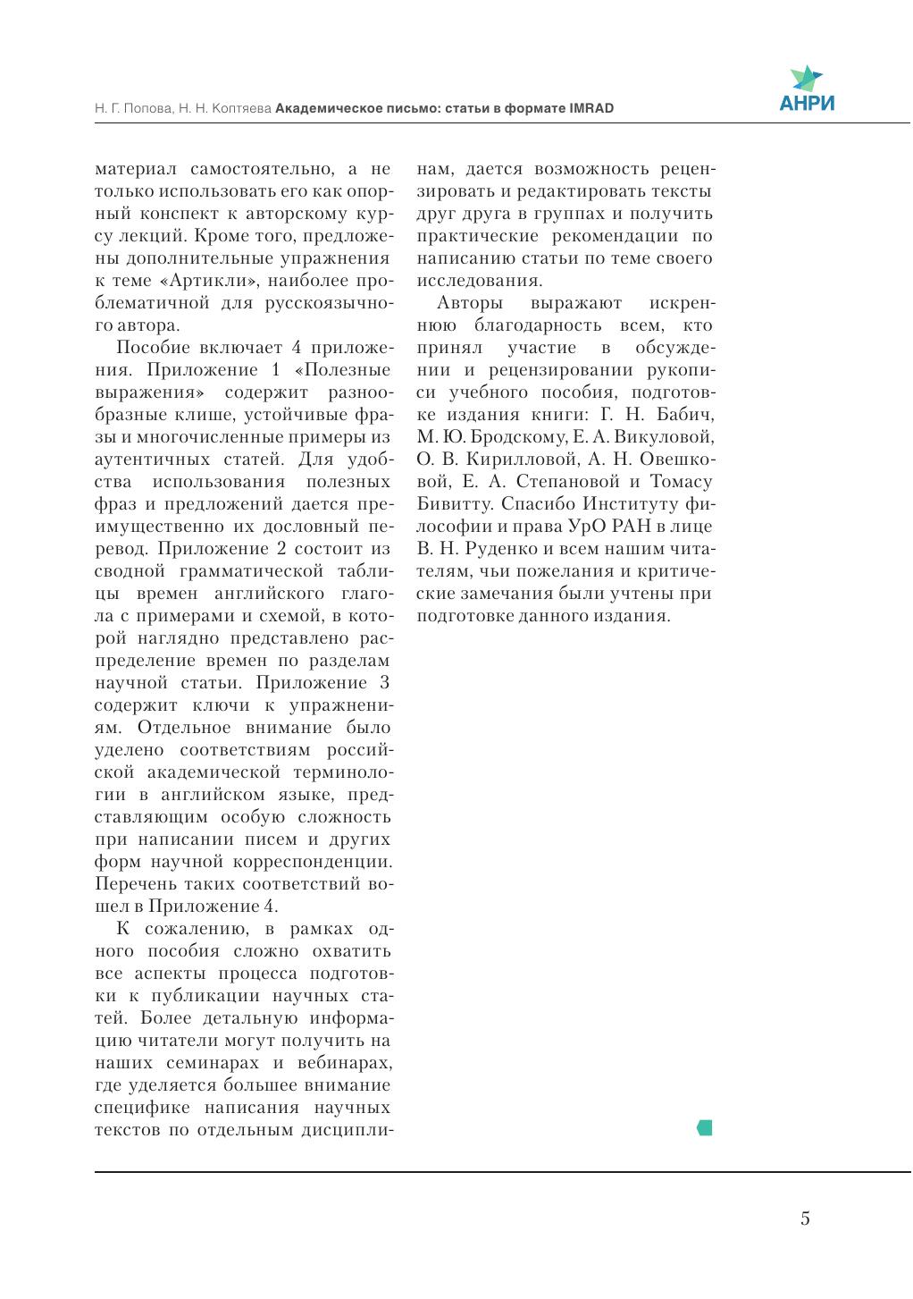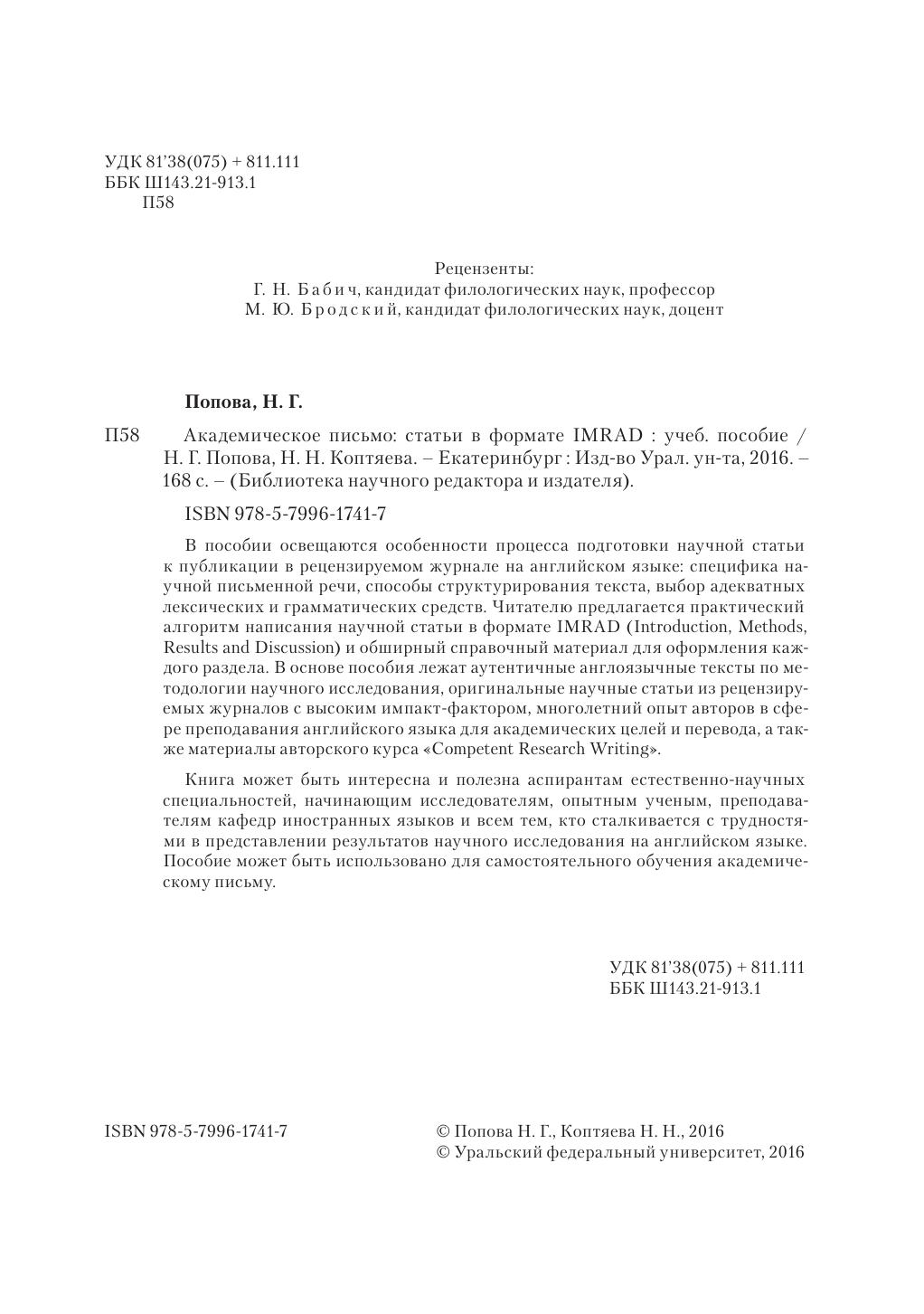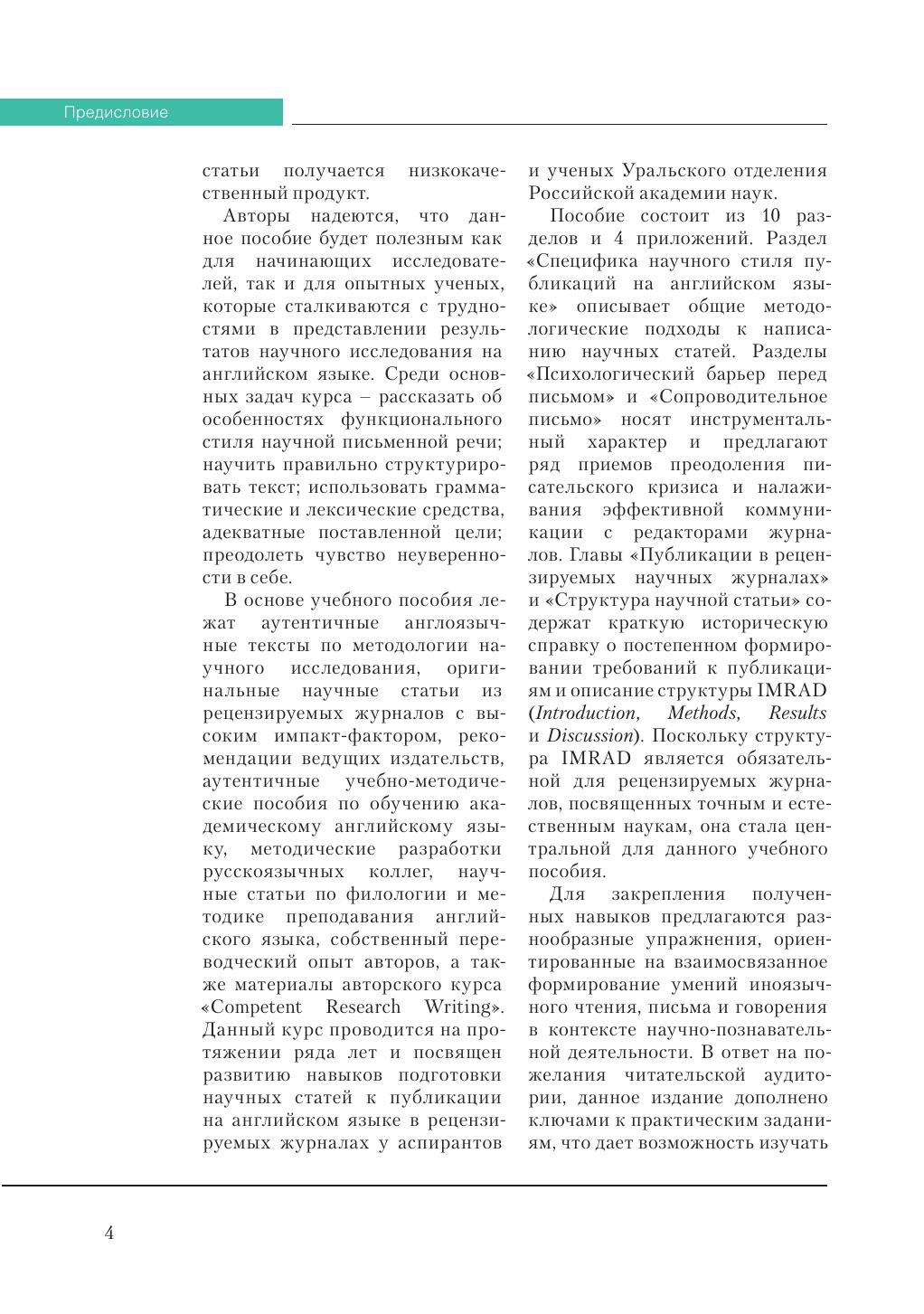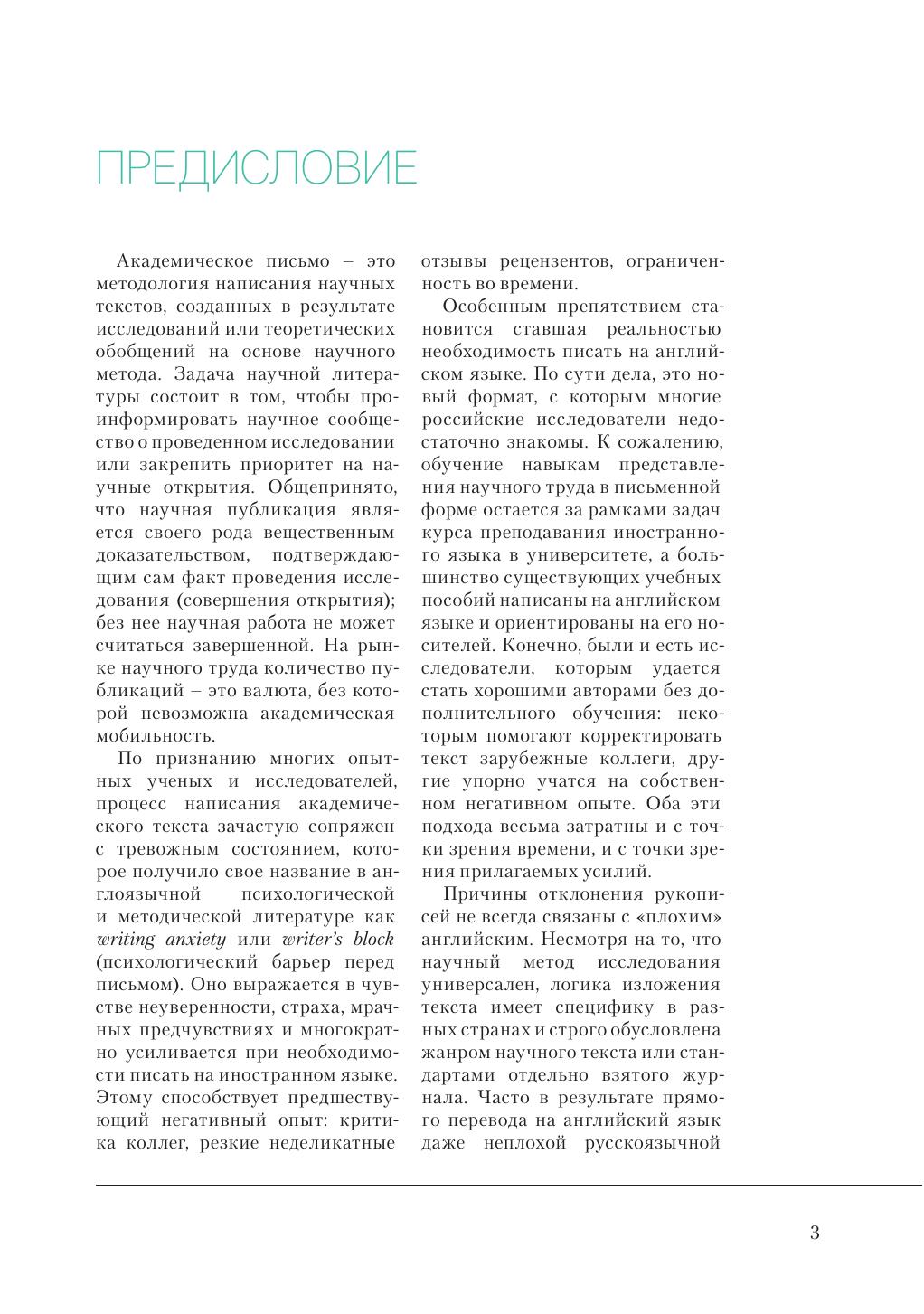В пособии освещаются особенности процесса подготовки научной статьи к публикации в рецензируемом журнале на английском языке: специфика научной письменной речи, способы структурирования текста, выбор адекватных лексических и грамматических средств. Читателю предлагается практический алгоритм написания научной статьи в формате IMRAD (Introduction, Methods, Results and Discussion) и обширный справочный материал для оформления каждого раздела. В основе пособия лежат аутентичные англоязычные тексты по методологии научного исследования, оригинальные научные статьи из рецензируемых журналов с высоким импакт-фактором, многолетний опыт авторов в сфере преподавания английского языка для академических целей и перевода, а также материалы авторского курса «Competent Research Writing». Книга может быть интересна и полезна аспирантам естественно-научных специальностей, начинающим исследователям, опытным ученым, преподавателям кафедр иностранных языков и всем тем, кто сталкивается с трудностями в представлении результатов научного исследования на английском языке. Пособие может быть использовано для самостоятельного обучения академическому письму.