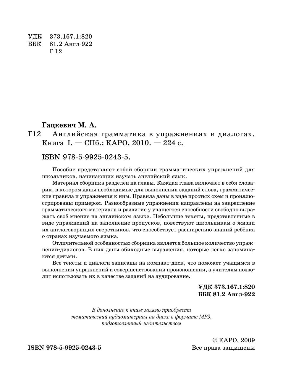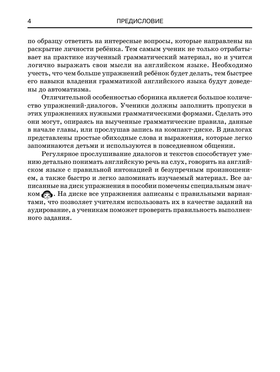 Пособие представляет собой сборник грамматических упражнений для школьников, начинающих изучать английский язык. Материал сборника разделен на главы, каждая из которых включает в себя словарик, в котором даны необходимые для выполнения заданий слова, грамматические правила и упражнения к ним. Правила даны в виде простых схем и проиллюстрированы примером. Разнообразные упражнения направлены на закрепление грамматического материала и развитие у учащегося способности свободно выражать свое мнение на английском языке. Небольшие тексты, представленные в виде упражнений на заполнение пропусков, повествуют школьникам о жизни их англоговорящих сверстников, что способствует расширению знаний ребенка о странах изучаемого языка. Отличительной особенностью сборника является большое количество упражнений-диалогов. В них даны обиходные выражения, которые легко запоминаются детьми. Все тексты и диалоги записаны на компакт-диск, что поможет учащимся в выполнении упражнений и совершенствовании произношения, а учителям позволит использовать их в качестве заданий на аудирование.