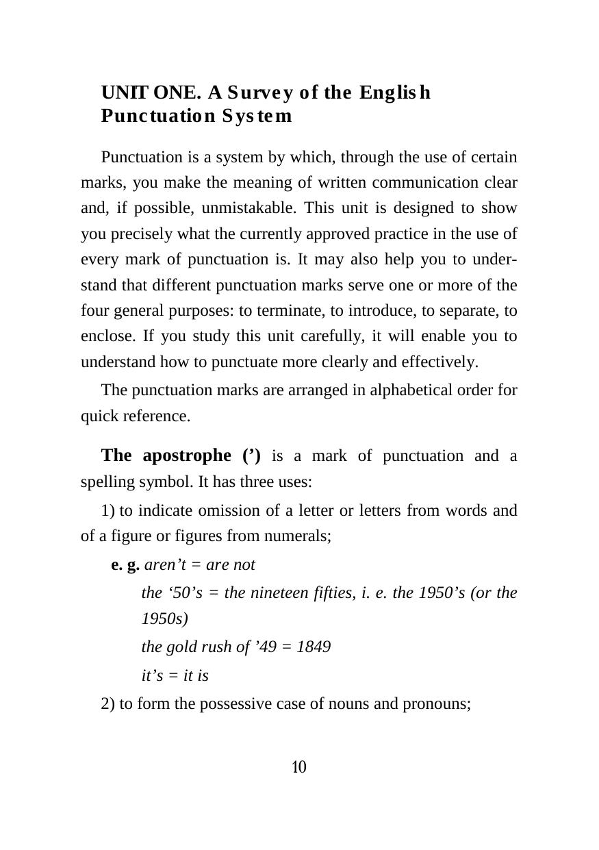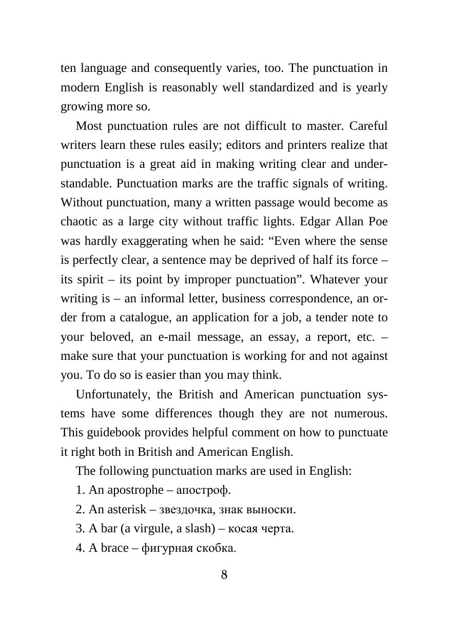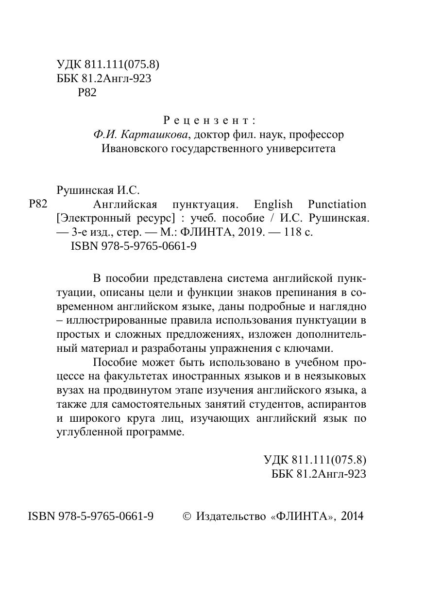 В пособии представлена система английской пунктуации, описаны цели и функции знаков препинания в современном английском языке, даны подробные и наглядно–иллюстрированные правила использования пунктуации в простых и сложных предложениях, изложен дополнительный материал и разработаны упражнения с ключами.