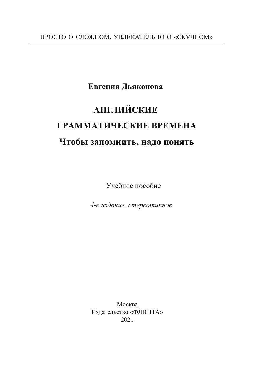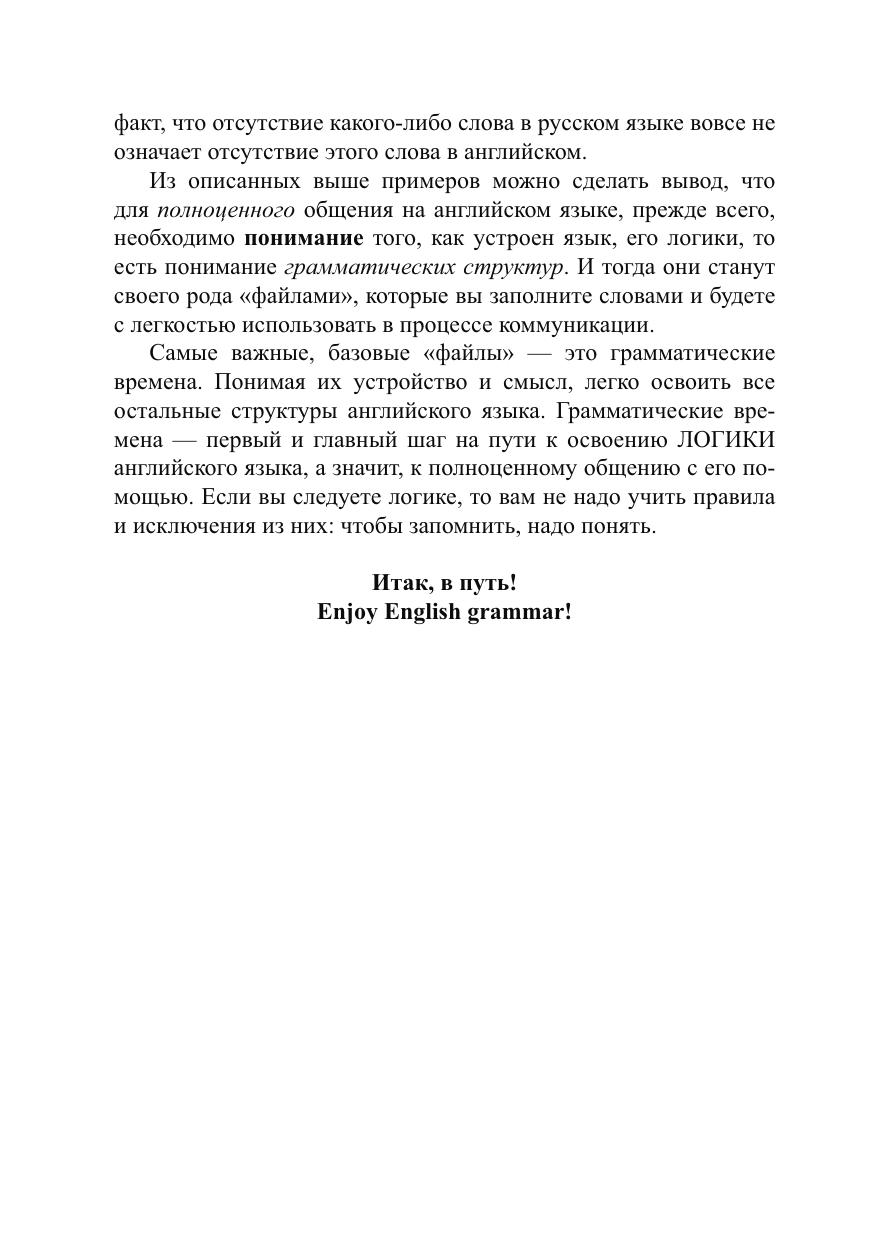 Книга раскроет секреты английских грамматических времен, объяснит их смысл, логику образования и употребления. При ее на писании учитывались многие явления, открытые и изученные в разное время (от времен Сократа до сегодняшнего дня) и в разных областях науки: в педагогике, андрагогике, философии, лингвистик е, психологии, нейролингвистике, филологии, медицине, физике. Книга написана в простой, доступной форме и снабжена большим к оличеством иллюстраций, которые делают изложение материала б олее наглядным. Книга также может быть использована преподават елями английского языка в качестве пособия для объяснения базово й грамматики английского языка. В книге содержатся упражнения (с ключами) для закрепления изученного материала. Важно отмет ить, что данная книга создана специально для русскоговорящего читателя, и уровень владения английским языком для освоения мат ериала данной книги не имеет решающего значения.