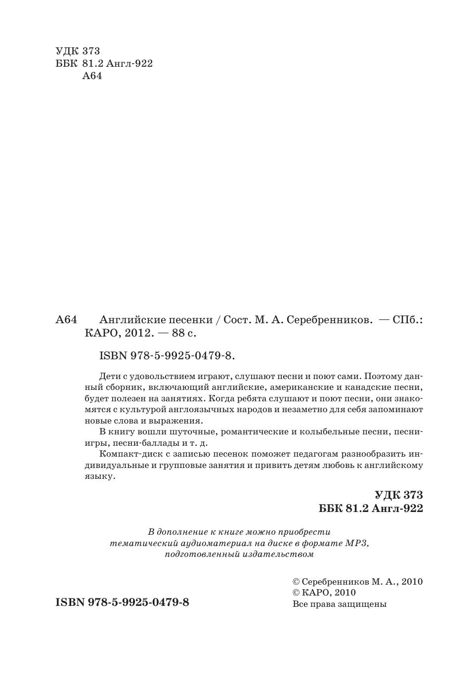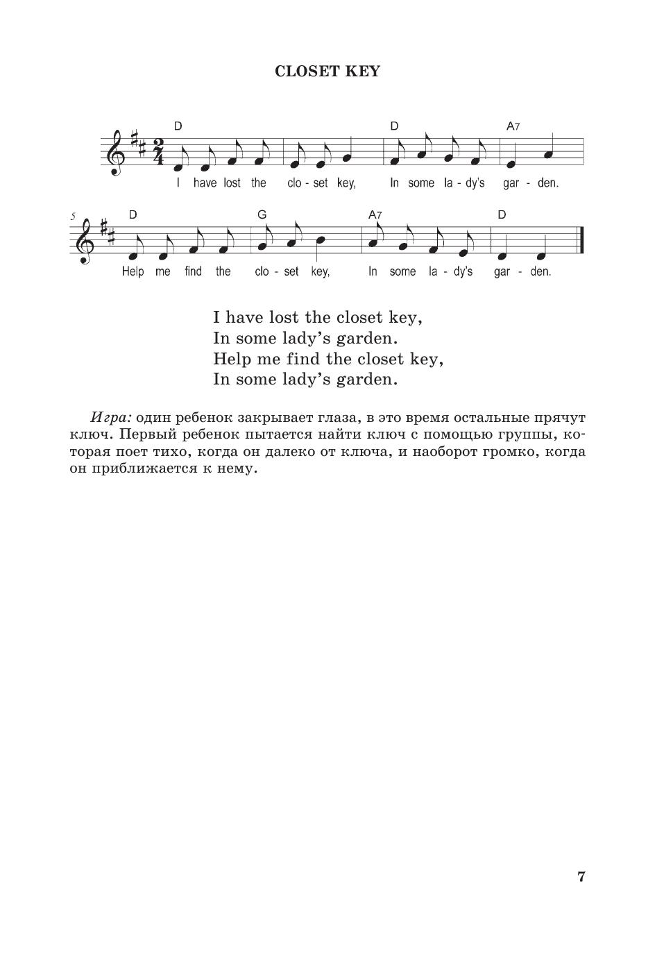 Дети с удовольствием играют, слушают песни и поют сами. Поэтому данный сборник, включающий английские, американские и канадские песни, будет полезен на занятиях. Когда ребята слушают и поют песни, они знакомятся с культурой англоязычных народов и незаметно для себя запоминают новые слова и выражения. В книгу вошли шуточные, романтические и колыбельные песни, песни-игры, песни-баллады и т. д. Компакт-диск с записью песенок поможет педагогам разнообразить индивидуальные и групповые занятия и привить детям любовь к английскому языку.