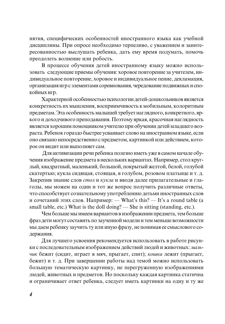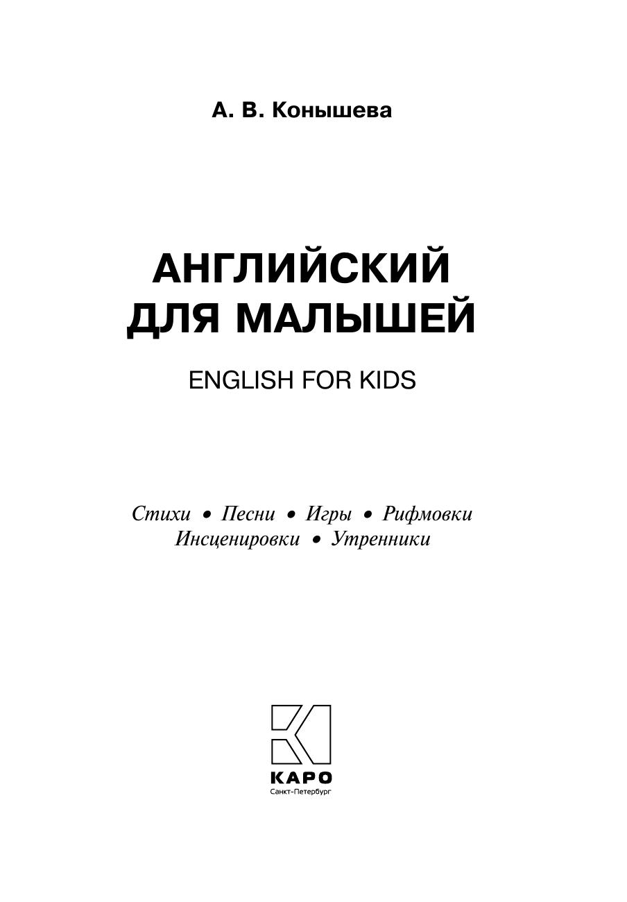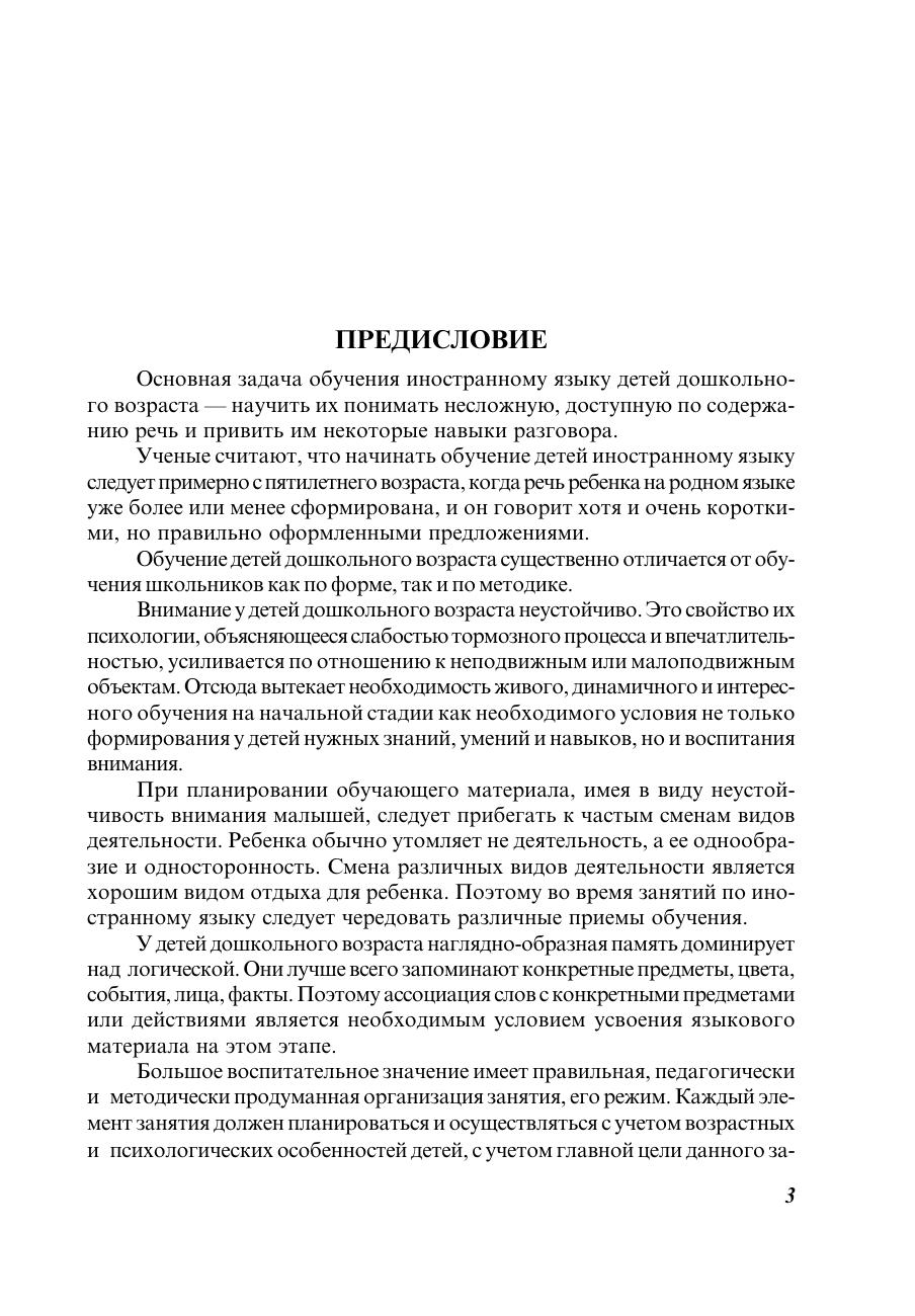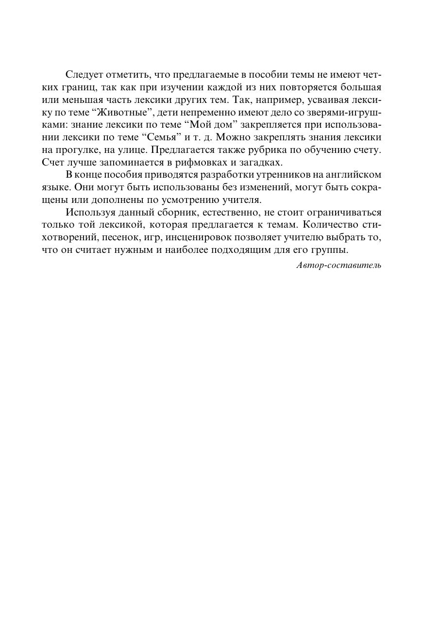 Сборник включает стихотворения, песенки, игры, рифмовки, небольшие пьески, считалки на английском языке, а также сценарии утренников по различной тематике. Материалы в предлагаемом сборнике подобраны по тематическому принципу в соответствии с возрастом детей. "Игрушки", "Животные", "Природа", "Одежда", "Семья" и др. - темы, представленные в этом сборнике. Перед каждой темой приводится список изучаемой лексики.
