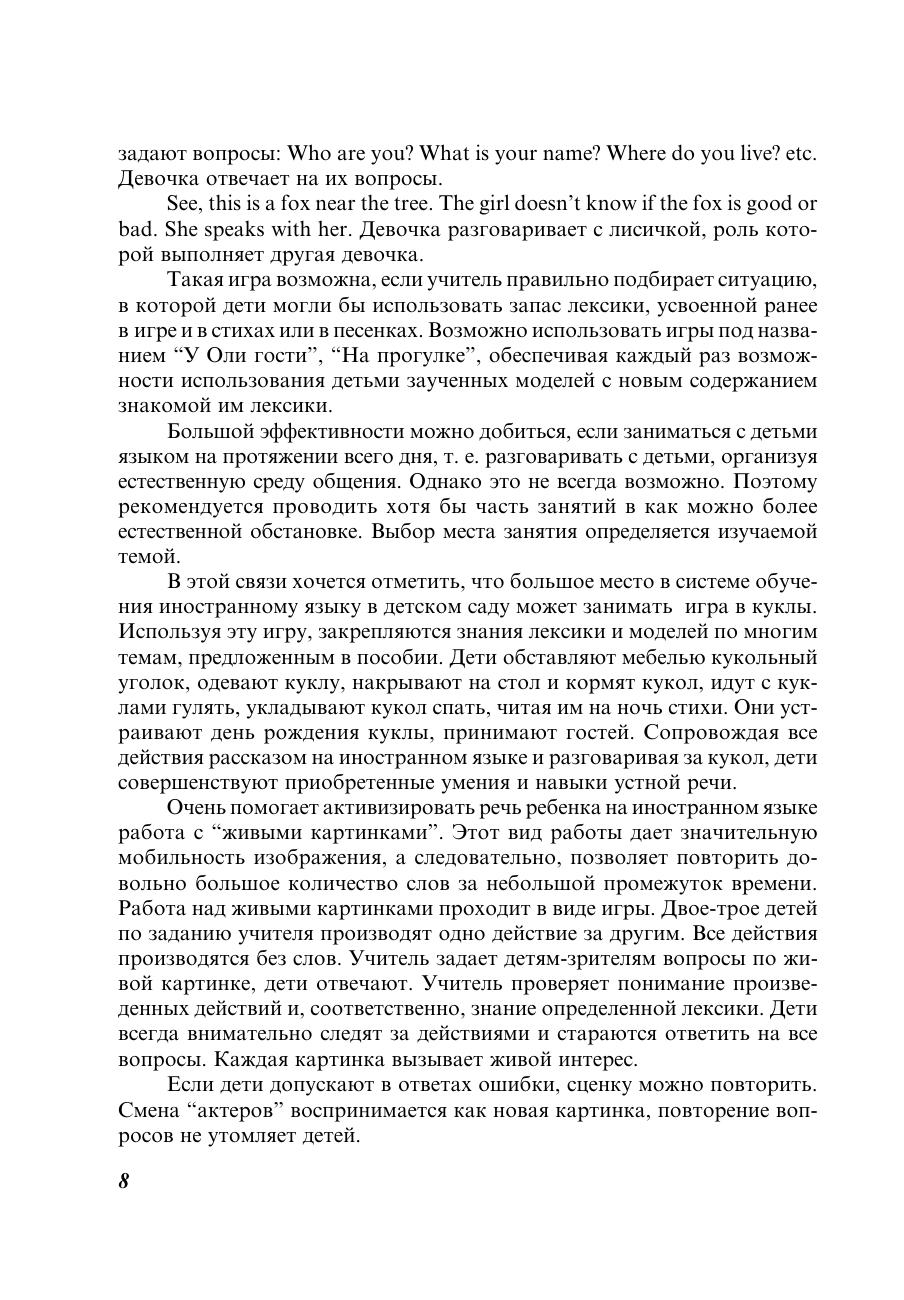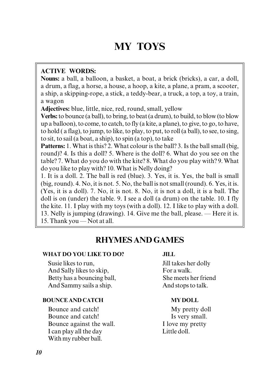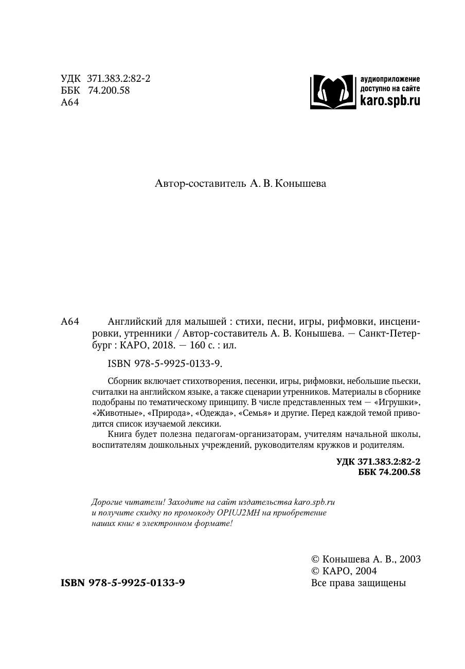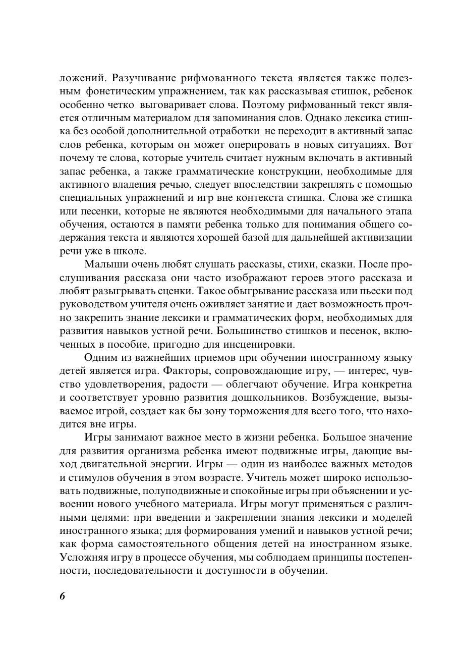 Сборник включает стихотворения, песенки, игры, рифмовки, небольшие пьески, считалки на английском языке, а также сценарии утренников по различной тематике. Материалы в предлагаемом сборнике подобраны по тематическому принципу в соответствии с возрастом детей. "Игрушки", "Животные", "Природа", "Одежда", "Семья" и др. - темы, представленные в этом сборнике. Перед каждой темой приводится список изучаемой лексики.