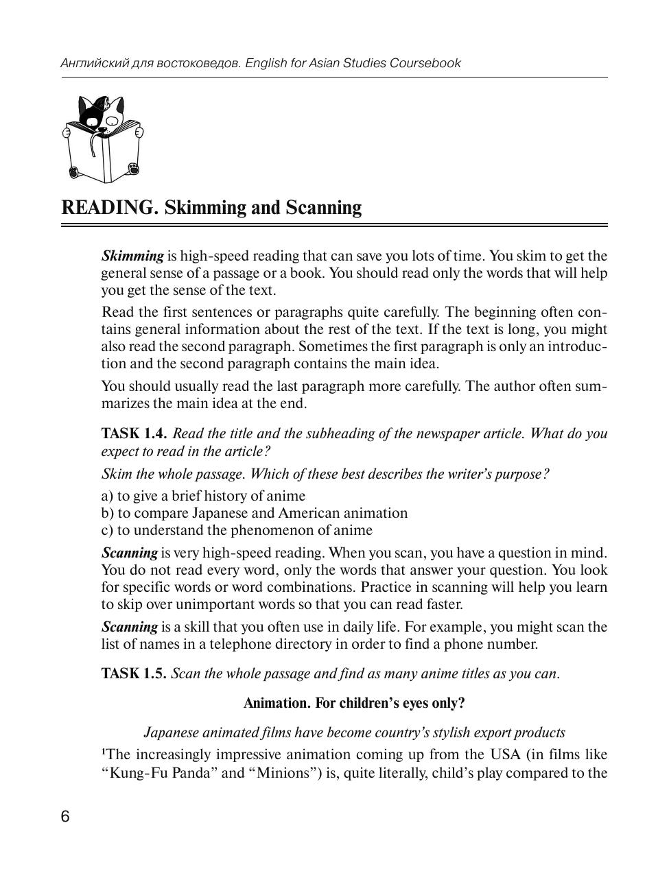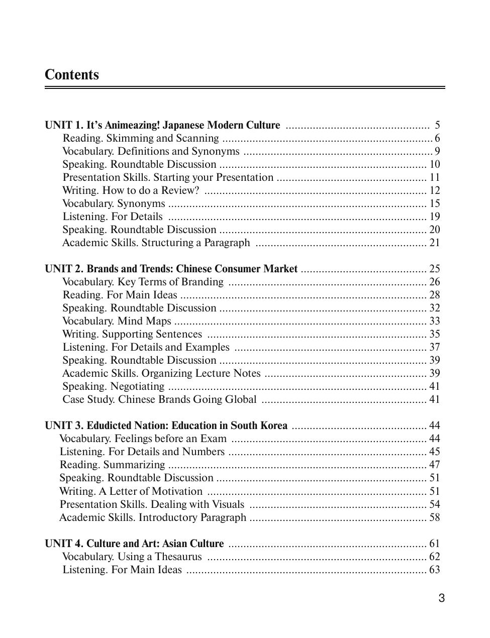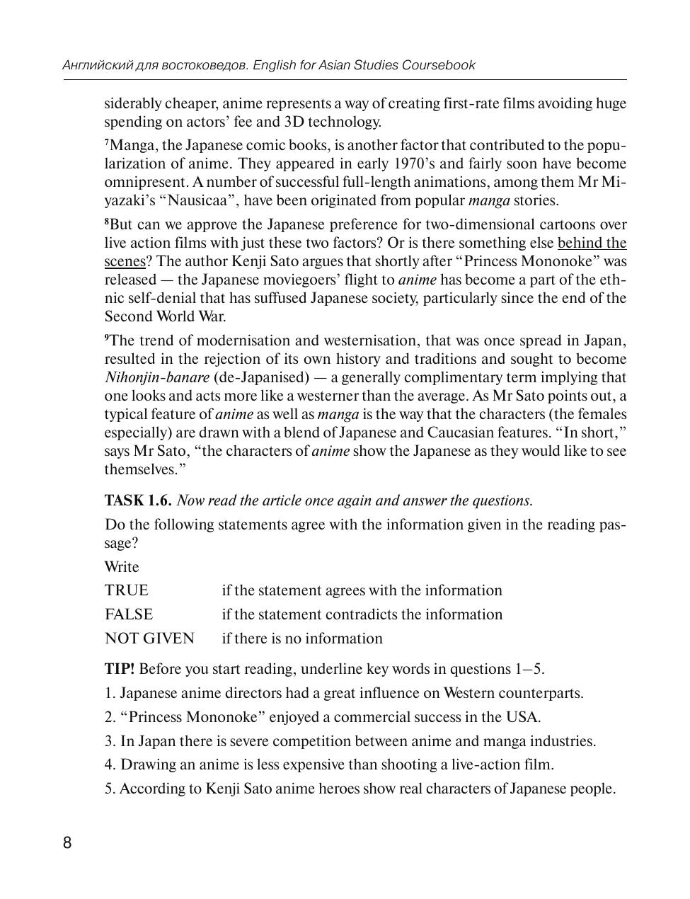 Английский язык уже давно проник во все сферы человеческой деятельности и стал инструментом интеграции в глобальное общество. Изучение английского языка признано необходимостью в большинстве стран мира. Однако если в школе упор делается на освоение курса «General English», то при обучении английскому языку в вузе на первый план выходят овладение академическими навыками и навыки профессионального общения. Эти два аспекта и легли в основу данного учебного пособия, которое охватывает первую часть практического курса «Английский для востоковедов» (‘English for Asian Studies’). Курс построен на принципах коммуникативного подхода к изучению английского языка и включает четыре вида речевой деятельности: прослушивание (Listening), чтение (Reading), говорение (Speaking), письмо (Writing), а также изучение грамматики и вокабуляра. Основной целью учебного пособия является развитие у студентов как академических навыков (написание эссе, аннотаций, тезисов, выступление с презентацией, участие в круглых столах и дебатах), так и навыков в сфере английского для специальных целей (овладение англоязычной терминологией будущей специальности, знакомство с культурологическими, экономическими, историческими, политическими реалиями изучаемого региона). Пособие «Английский для востоковедов» основано на аутентичном англоязычном материале, посвященном странам Восточно-Азиатского региона, и состоит из шести частей (Units): Unit 1. Анимэ (Япония); Unit 2. Бренды (Китай); Unit 3. Образование (Корея); Unit 4. Искусство (Дальний Восток); Unit 5. Инновационные технологии (Япония); Unit 6. Азиатский образ жизни (Дальний Восток).