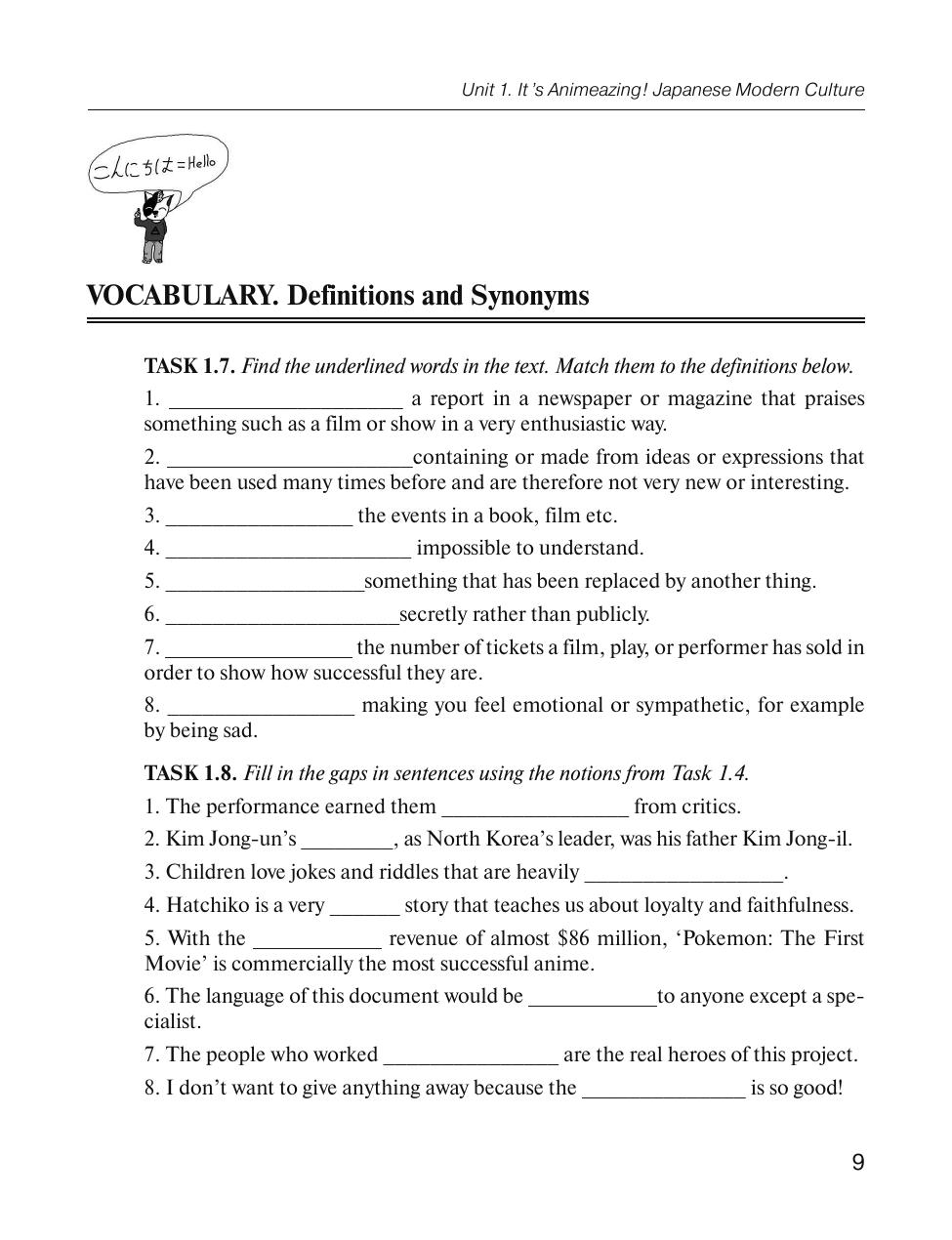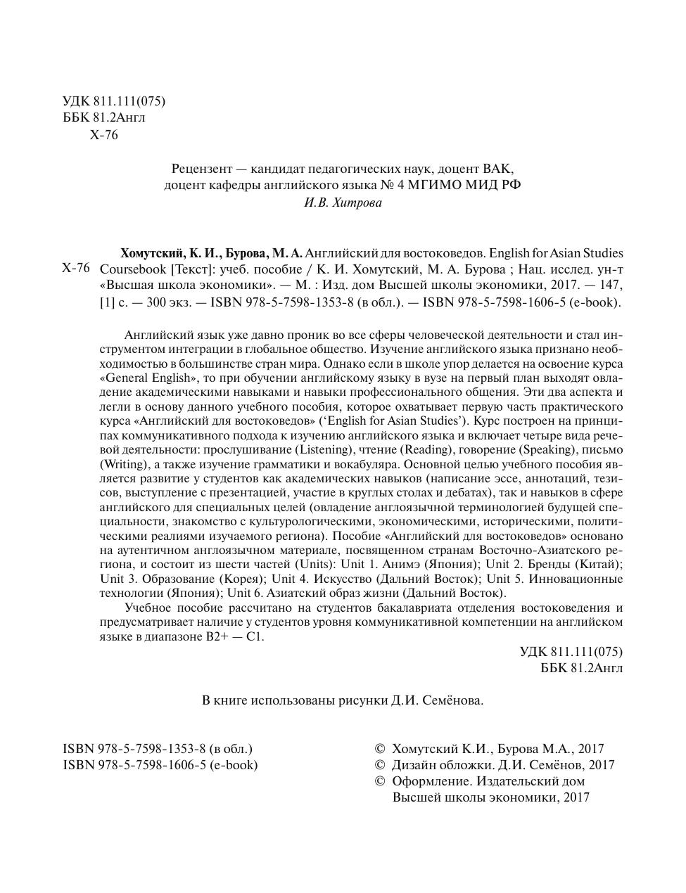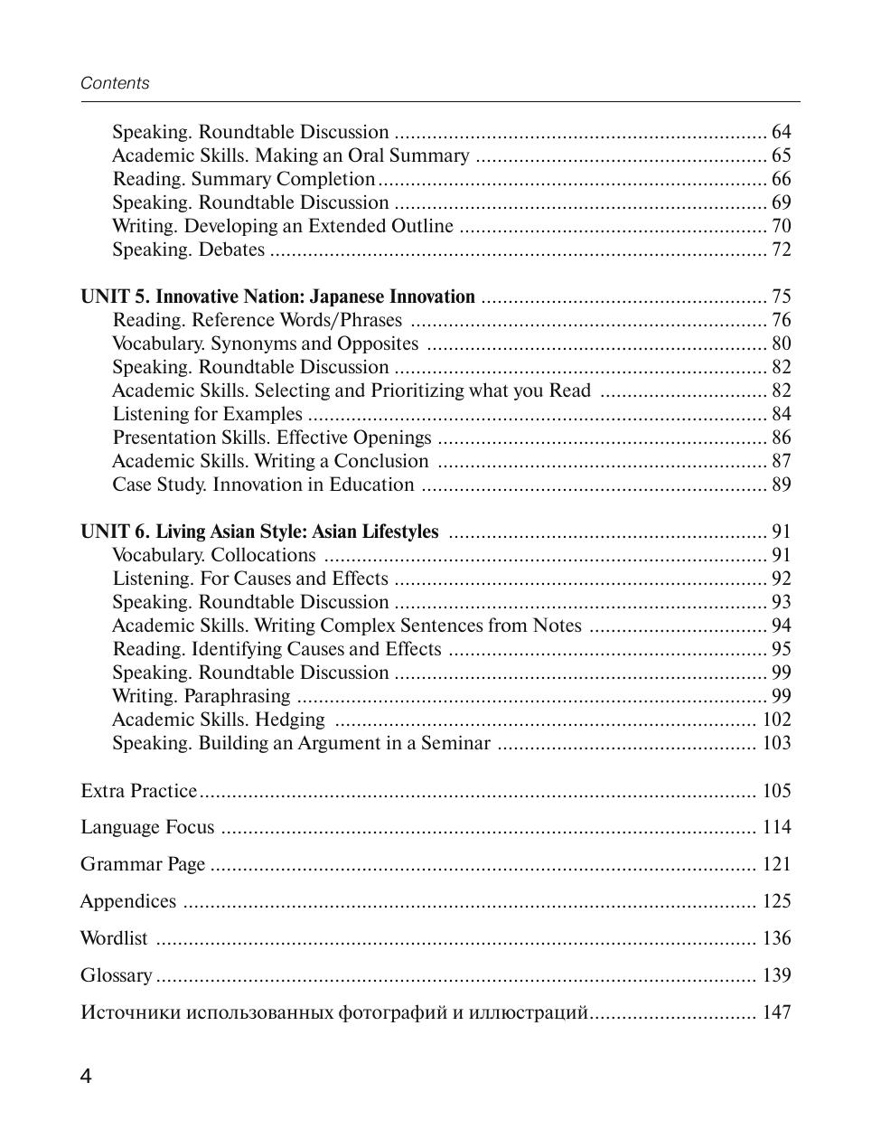 Английский язык уже давно проник во все сферы человеческой деятельности и стал инструментом интеграции в глобальное общество. Изучение английского языка признано необходимостью в большинстве стран мира. Однако если в школе упор делается на освоение курса «General English», то при обучении английскому языку в вузе на первый план выходят овладение академическими навыками и навыки профессионального общения. Эти два аспекта и легли в основу данного учебного пособия, которое охватывает первую часть практического курса «Английский для востоковедов» (‘English for Asian Studies’). Курс построен на принципах коммуникативного подхода к изучению английского языка и включает четыре вида речевой деятельности: прослушивание (Listening), чтение (Reading), говорение (Speaking), письмо (Writing), а также изучение грамматики и вокабуляра. Основной целью учебного пособия является развитие у студентов как академических навыков (написание эссе, аннотаций, тезисов, выступление с презентацией, участие в круглых столах и дебатах), так и навыков в сфере английского для специальных целей (овладение англоязычной терминологией будущей специальности, знакомство с культурологическими, экономическими, историческими, политическими реалиями изучаемого региона). Пособие «Английский для востоковедов» основано на аутентичном англоязычном материале, посвященном странам Восточно-Азиатского региона, и состоит из шести частей (Units): Unit 1. Анимэ (Япония); Unit 2. Бренды (Китай); Unit 3. Образование (Корея); Unit 4. Искусство (Дальний Восток); Unit 5. Инновационные технологии (Япония); Unit 6. Азиатский образ жизни (Дальний Восток).