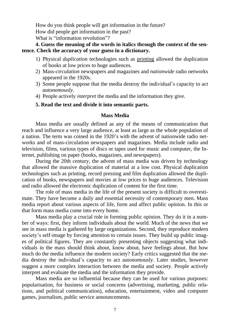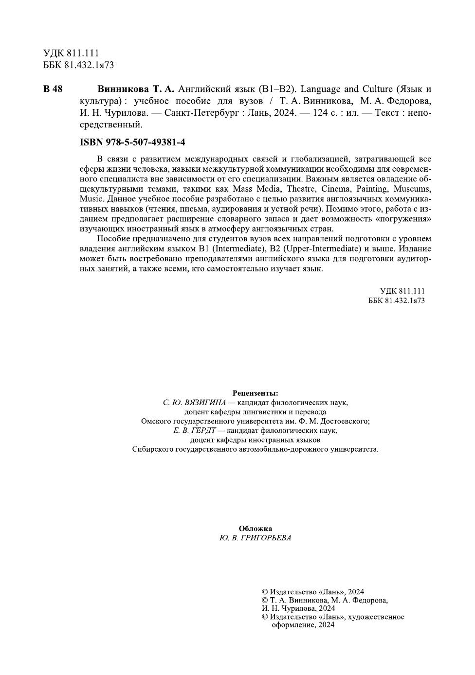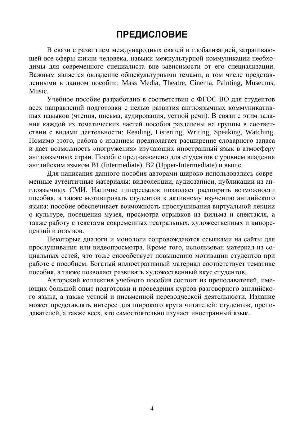 В связи с развитием международных связей и глобализацией, затрагивающей все сферы жизни человека, навыки межкультурной коммуникации необходимы для современного специалиста вне зависимости от его специализации. Важным является овладение общекультурными темами, такими как Mass Media, Theatre, Cinema, Painting, Museums, Music. Данное учебное пособие разработано с целью развития англоязычных коммуникативных навыков (чтения, письма, аудирования и устной речи). Помимо этого, работа с изданием предполагает расширение словарного запаса и дает возможность «погружения» изучающих иностранный язык в атмосферу англоязычных стран. Пособие предназначено для студентов вузов всех направлений подготовки с уровнем владения английским языком B1 (Intermediate), B2 (Upper-Intermediate) и выше. Издание может быть востребовано преподавателями английского языка для подготовки аудиторных занятий, а также всеми, кто самостоятельно изучает язык.