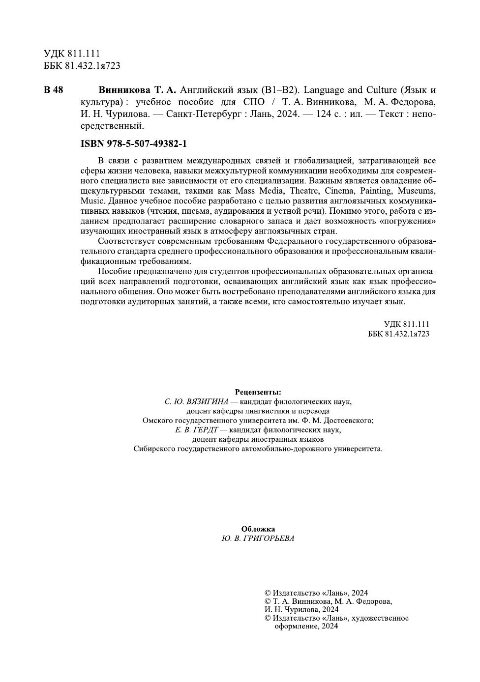В связи с развитием международных связей и глобализацией, затрагивающей все сферы жизни человека, навыки межкультурной коммуникации необходимы для современного специалиста вне зависимости от его специализации. Важным является овладение общекультурными темами, такими как Mass Media, Theatre, Cinema, Painting, Museums, Music. Данное учебное пособие разработано с целью развития англоязычных коммуникативных навыков (чтения, письма, аудирования и устной речи). Помимо этого, работа с изданием предполагает расширение словарного запаса и дает возможность «погружения» изучающих иностранный язык в атмосферу англоязычных стран. Соответствует современным требованиям Федерального государственного образова-тельного стандарта среднего профессионального образования и профессиональным квалификационным требованиям. Пособие предназначено для студентов профессиональных образовательных организаций всех направлений подготовки, осваивающих английский язык как язык профессионального общения. Оно может быть востребовано преподавателями английского языка для подготовки аудиторных занятий, а также всеми, кто самостоятельно изучает язык.