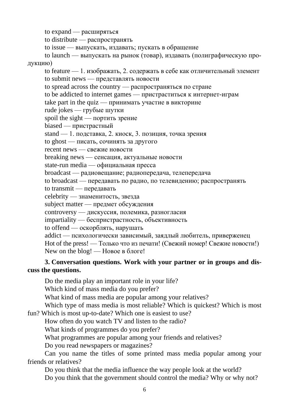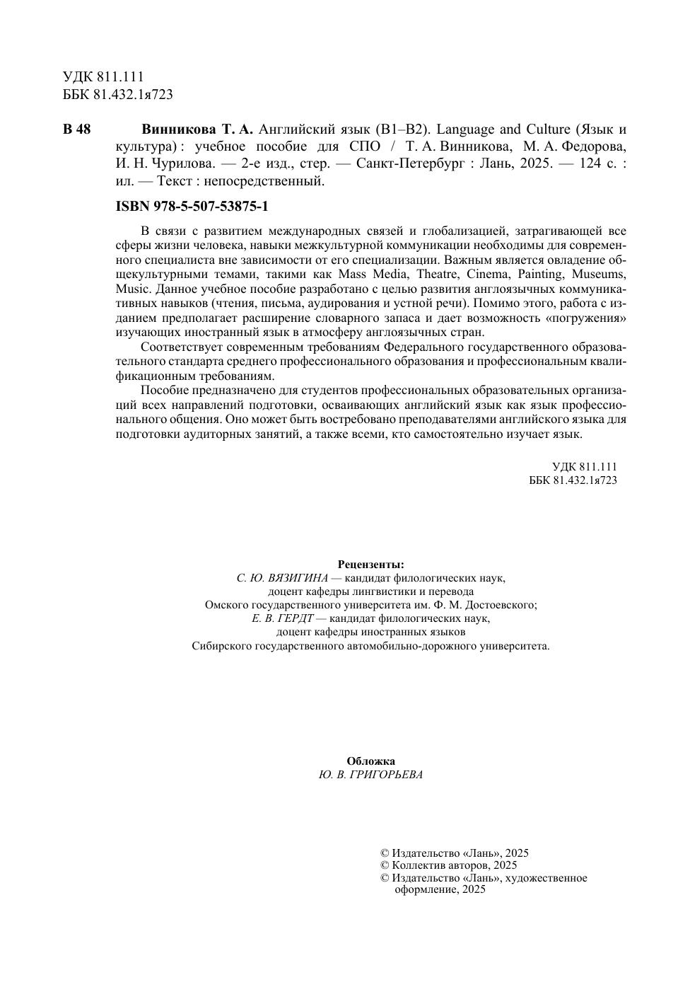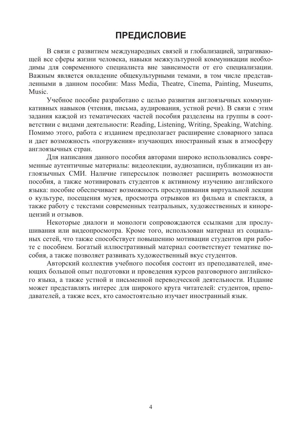 В связи с развитием международных связей и глобализацией, затрагивающей все сферы жизни человека, навыки межкультурной коммуникации необходимы для современного специалиста вне зависимости от его специализации. Важным является овладение общекультурными темами, такими как Mass Media, Theatre, Cinema, Painting, Museums, Music. Данное учебное пособие разработано с целью развития англоязычных коммуникативных навыков (чтения, письма, аудирования и устной речи). Помимо этого, работа с изданием предполагает расширение словарного запаса и дает возможность «погружения» изучающих иностранный язык в атмосферу англоязычных стран. Соответствует современным требованиям Федерального государственного образова-тельного стандарта среднего профессионального образования и профессиональным квалификационным требованиям. Пособие предназначено для студентов профессиональных образовательных организаций всех направлений подготовки, осваивающих английский язык как язык профессионального общения. Оно может быть востребовано преподавателями английского языка для подготовки аудиторных занятий, а также всеми, кто самостоятельно изучает язык.