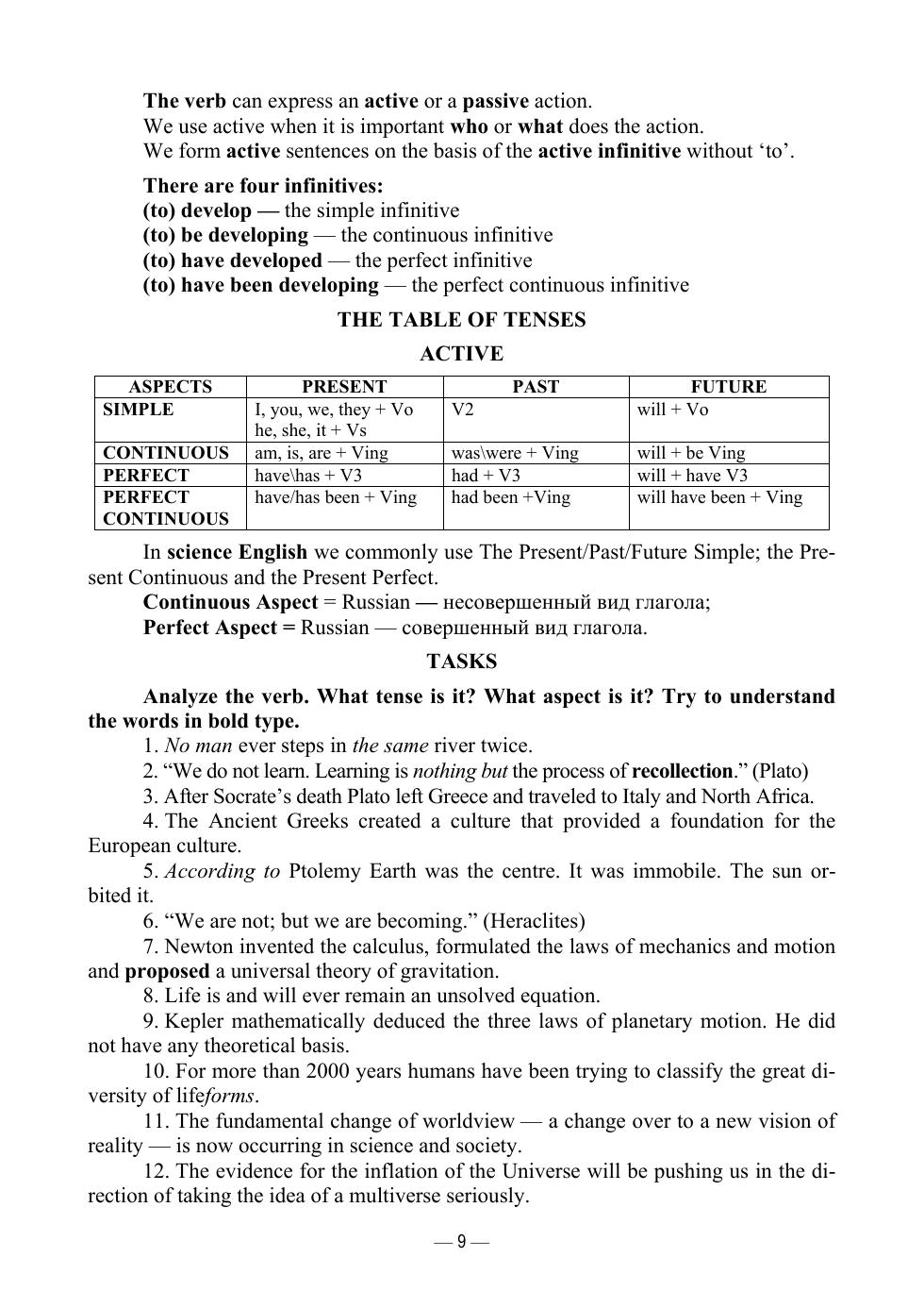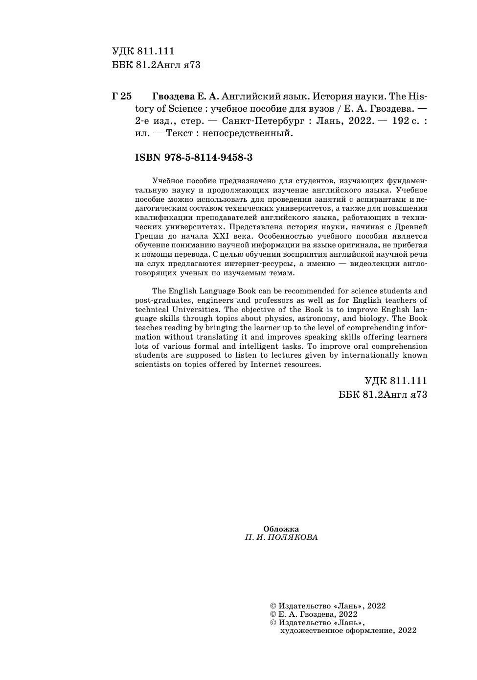 Учебное пособие предназначено для студентов, изучающих фундаментальную науку и продолжающих изучение английского языка. Учебное пособие можно использовать для проведения занятий с аспирантами и педагогическим составом технических университетов, а также для повышения квалификации преподавателей английского языка, работающих в технических университетах. Представлена история науки, начиная с Древней Греции до начала XXI века. Особенностью учебного пособия является обучение пониманию научной информации на языке оригинала, не прибегая к помощи перевода. С целью обучения восприятия английской научной речи на слух предлагаются интернет-ресурсы, а именно — видеолекции англоговорящих ученых по изучаемым темам.